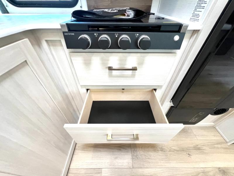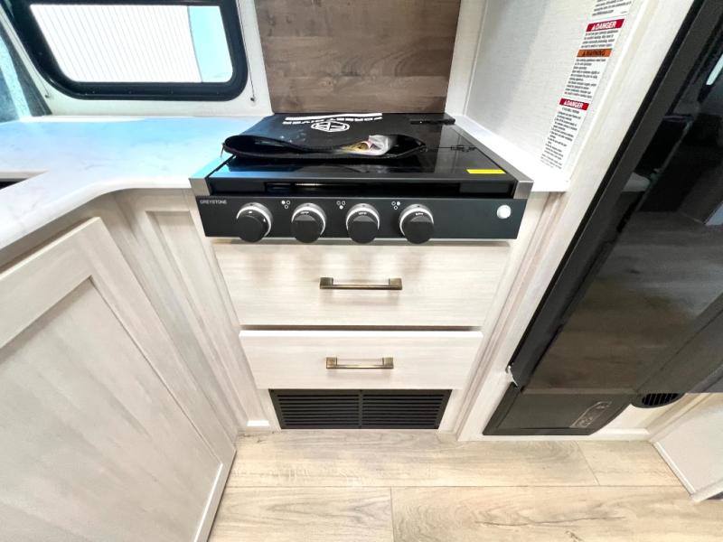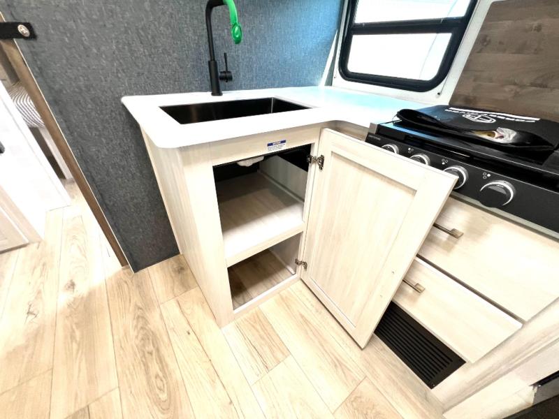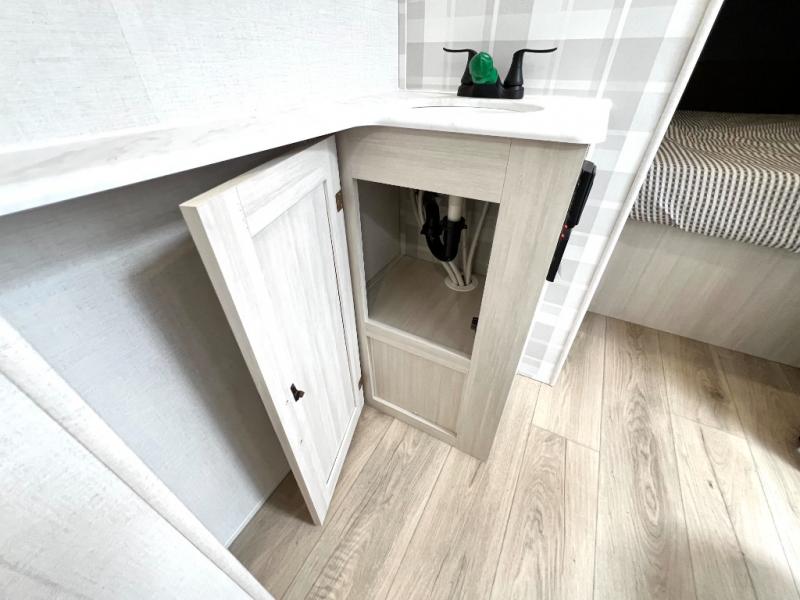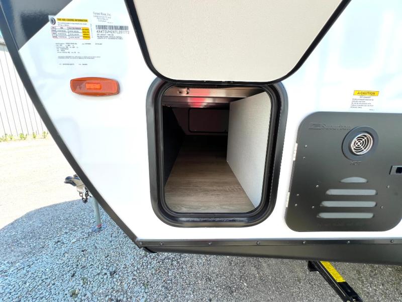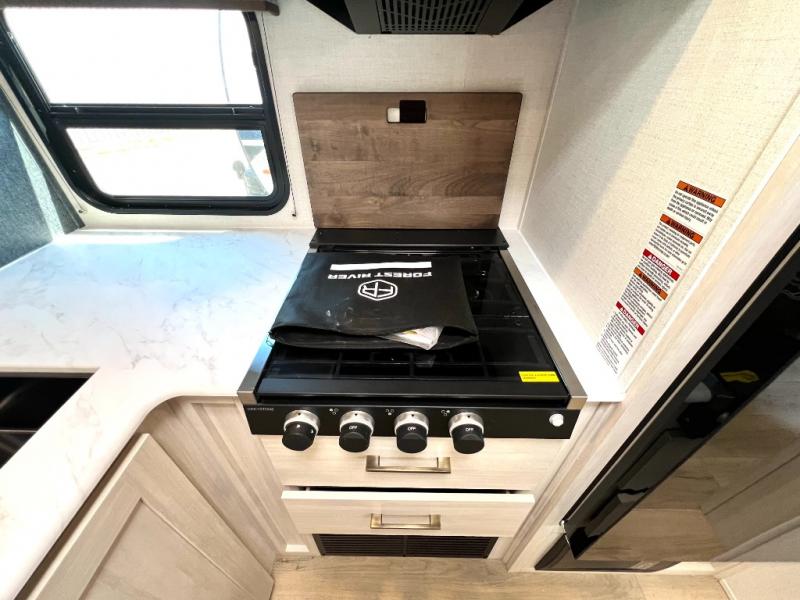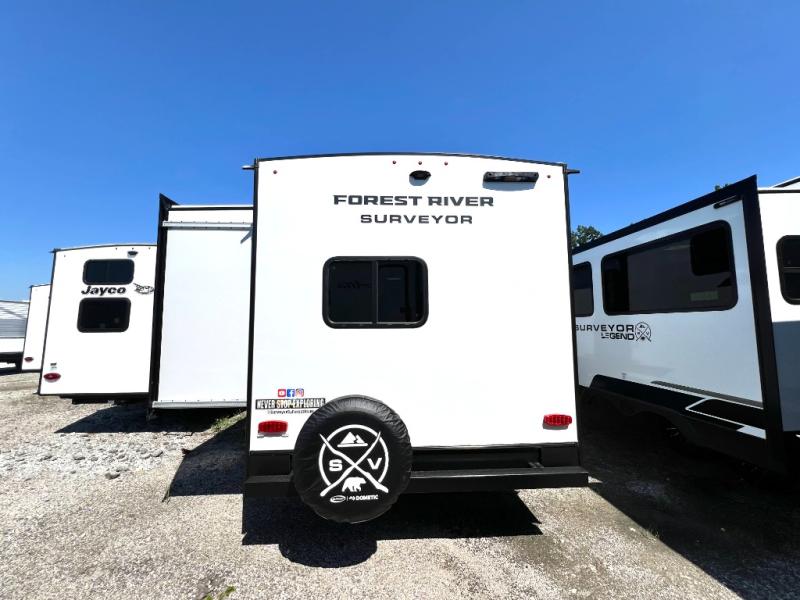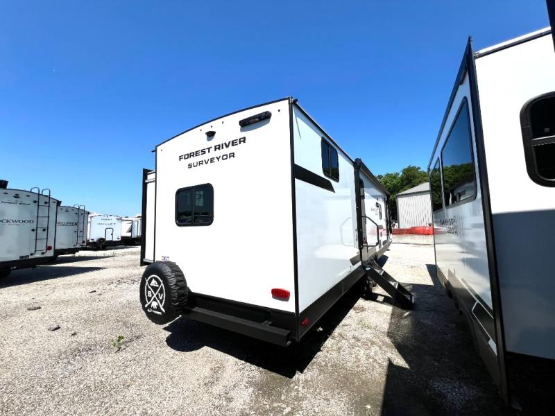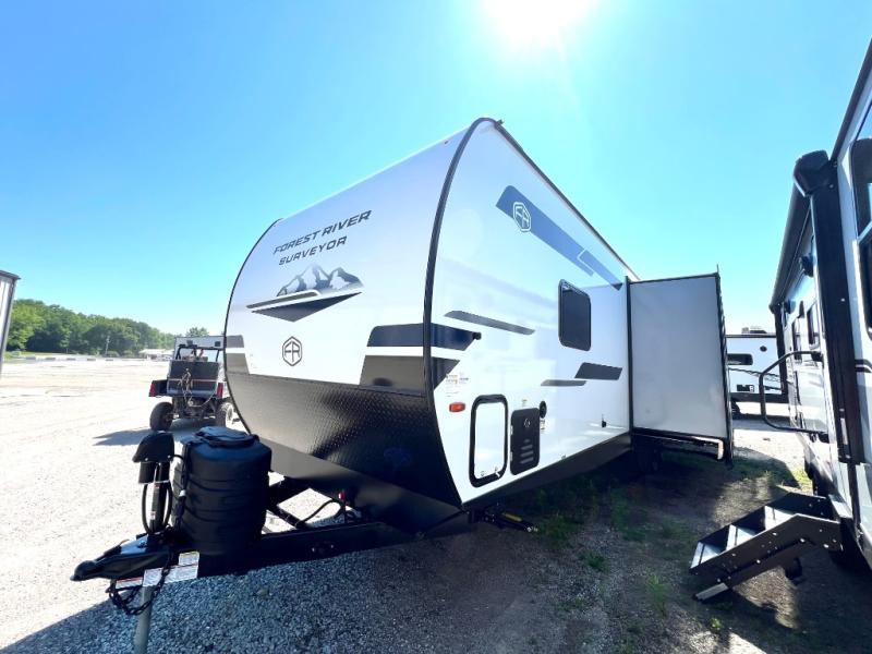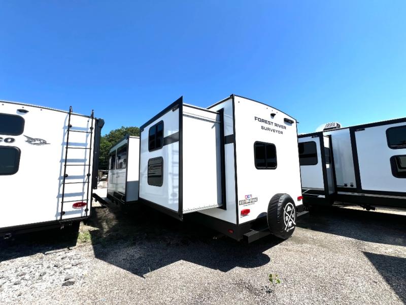 Value and versatility go hand-in-hand with the Surveyor Camp Series travel trailers by Forest River. The solid construction includes a 2" aluminum framed floor with block foam insulation and a sealed underbelly with forced heat and radiant foil insulation. A 100-watt roof mounted solar panel will provide some off-grid power, and the power tongue jack will let you easily hitch up and go whenever you're ready. Additional stand-out features include Surf(X) seamless countertops throughout, two A/C units, an electric awning with LED light strip, black glass friction hinge entry door(s), and so much more!