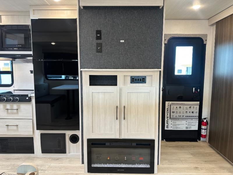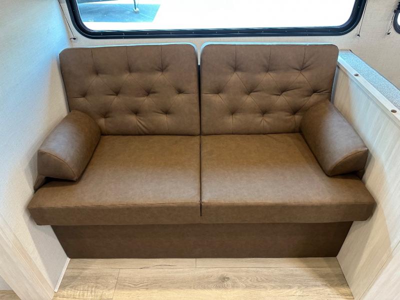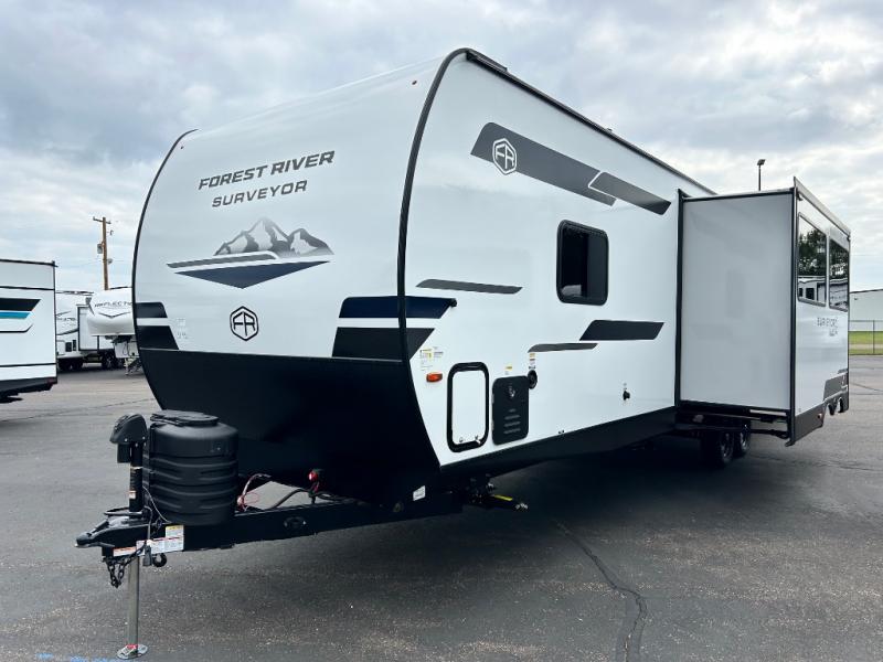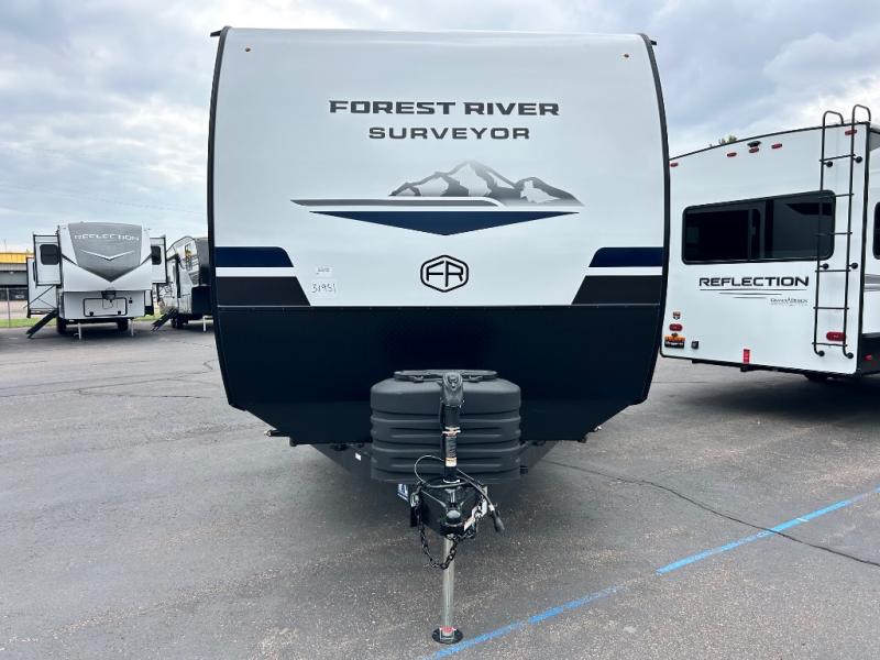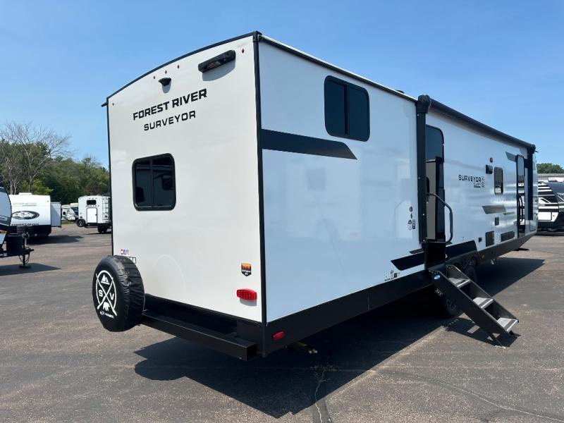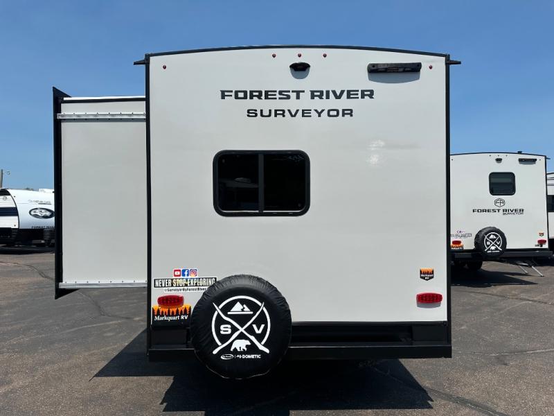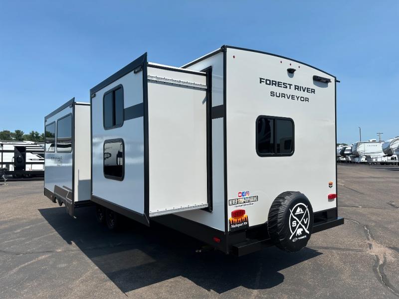 Value and versatility go hand-in-hand with the Surveyor Camp Series travel trailers by Forest River. The solid construction includes a 2" aluminum framed floor with block foam insulation and a sealed underbelly with forced heat and radiant foil insulation. A 100-watt roof mounted solar panel will provide some off-grid power, and the power tongue jack will let you easily hitch up and go whenever you're ready. Additional stand-out features include Surf(X) seamless countertops throughout, two A/C units, an electric awning with LED light strip, black glass friction hinge entry door(s), and so much more!