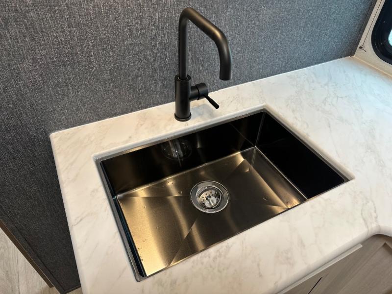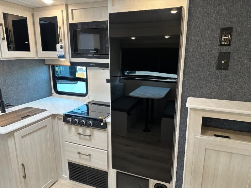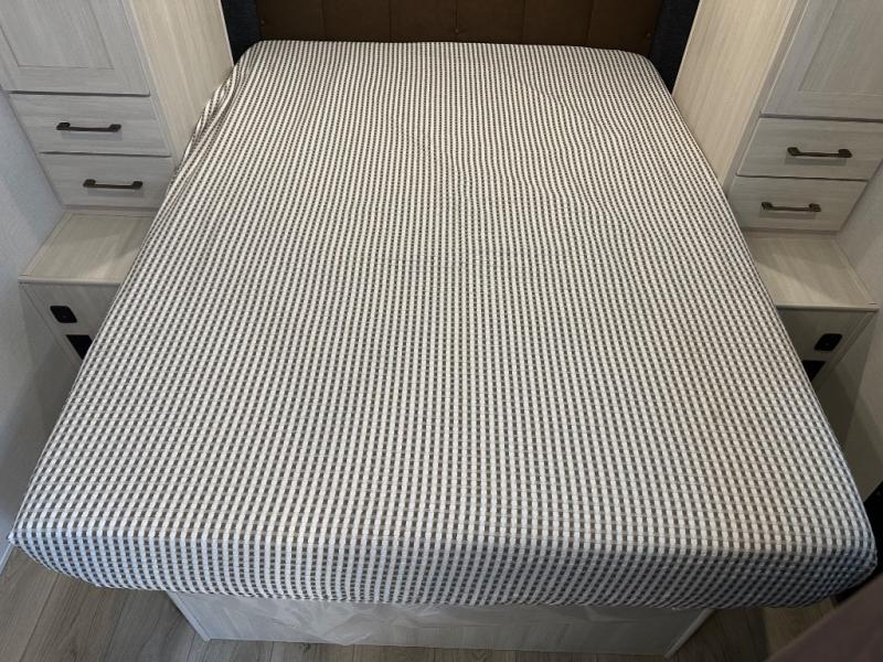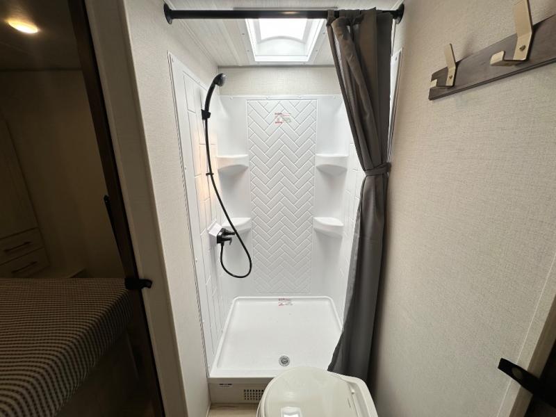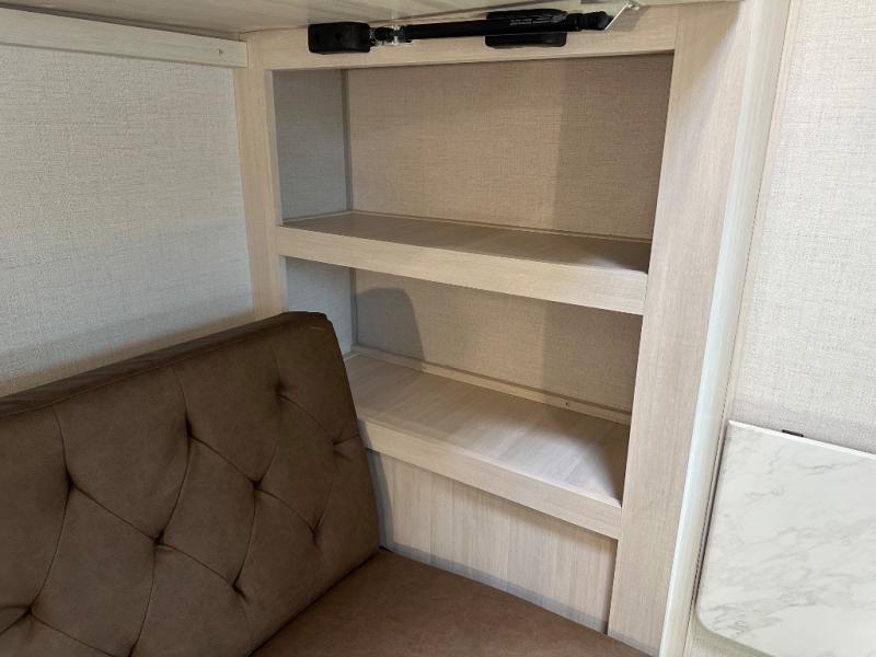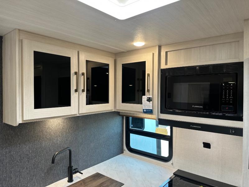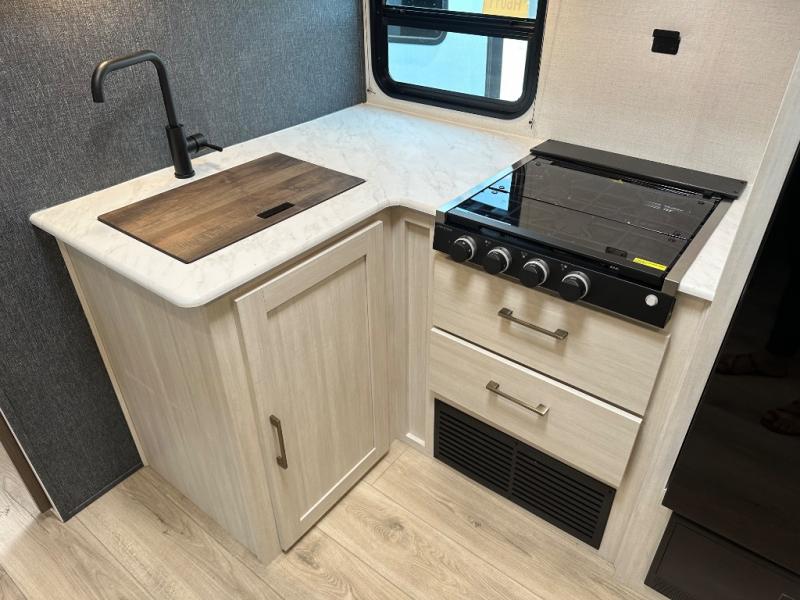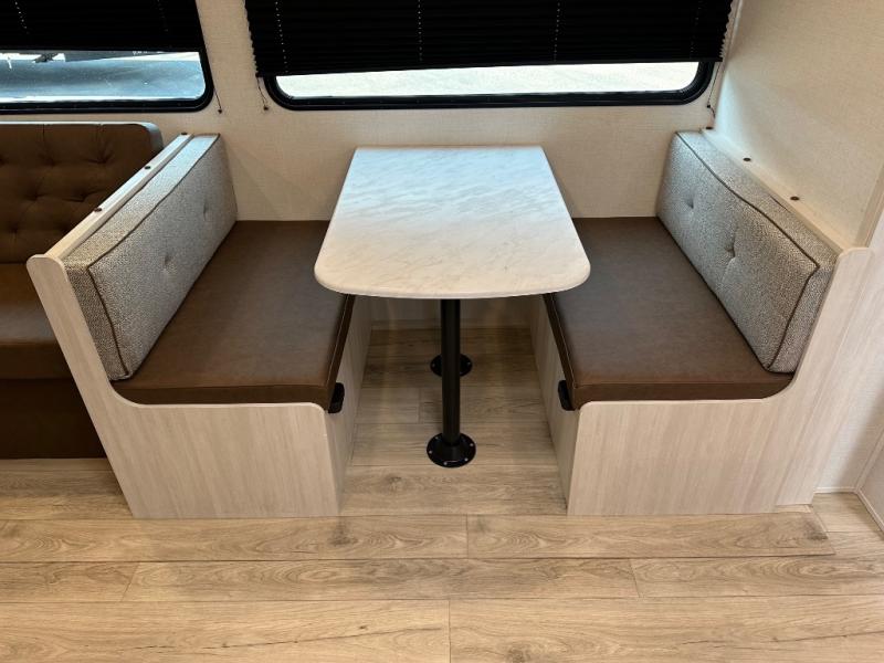 Value and versatility go hand-in-hand with the Surveyor Camp Series travel trailers by Forest River. The solid construction includes a 2" aluminum framed floor with block foam insulation and a sealed underbelly with forced heat and radiant foil insulation. A 100-watt roof mounted solar panel will provide some off-grid power, and the power tongue jack will let you easily hitch up and go whenever you're ready. Additional stand-out features include Surf(X) seamless countertops throughout, two A/C units, an electric awning with LED light strip, black glass friction hinge entry door(s), and so much more!