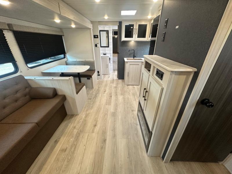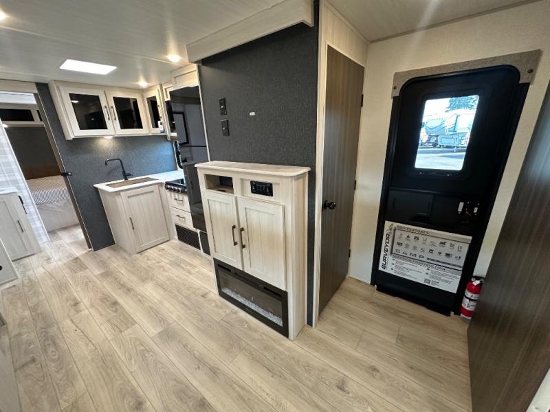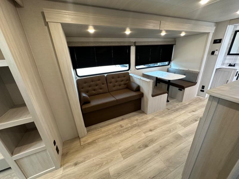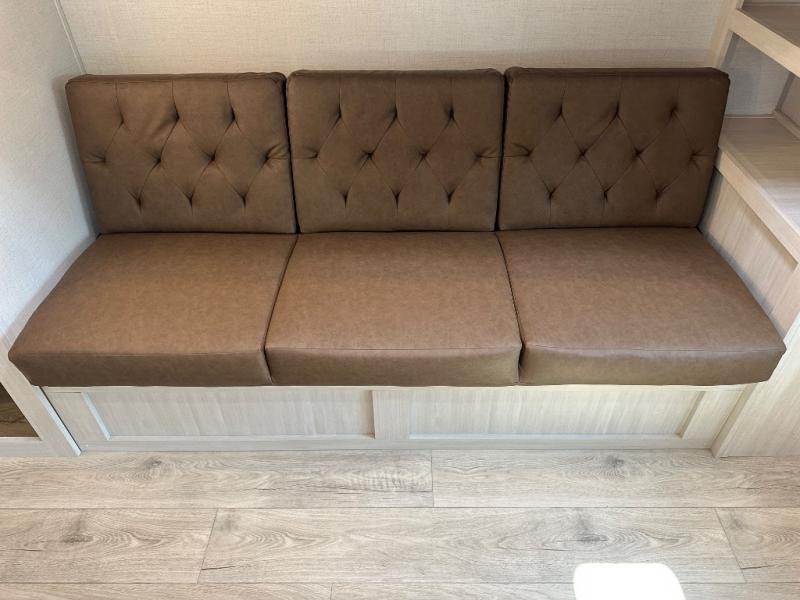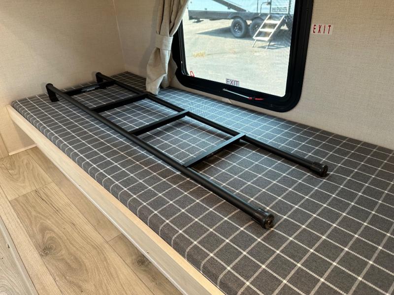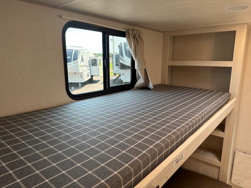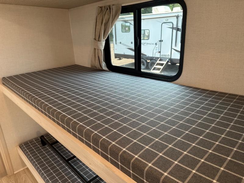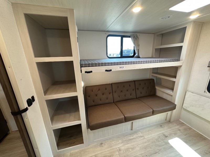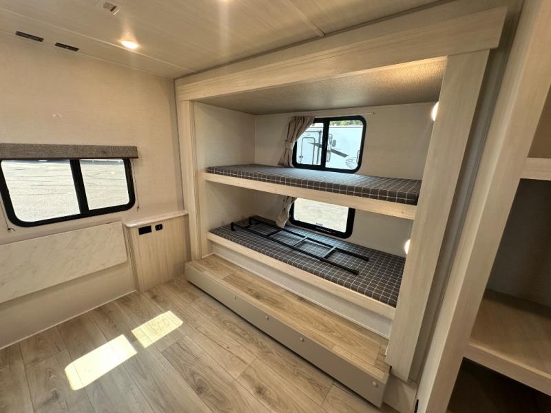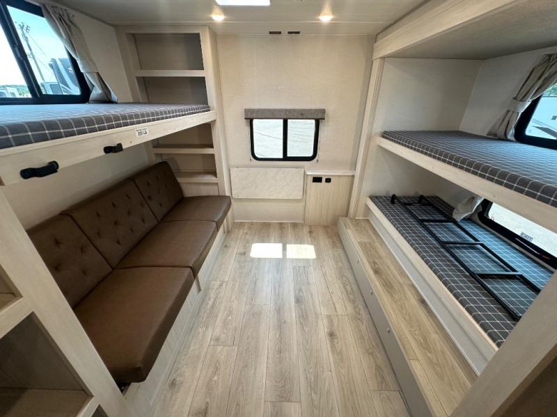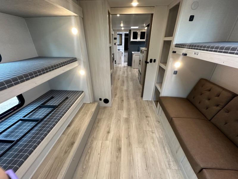 Head to your favorite camping spot with your favorite people in this spacious, dual entry travel trailer! The large slide out houses the booth dinette and sofa where you can relax in the evenings and even let guests sleep over who haven't claimed the triple bunks in the rear bunkhouse. There is also a bunkhouse sofa, two wardrobes, cubbies, and a flip-up desk if you need a space to work. A walk-thru bath is convenient for all, and the full kitchen lets you whip up your best meals in the microwave with an air fryer. There is also a walk-in pantry with washer and dryer prep if you choose to add those appliances. When it's time to call it a night, the front master bedroom with a queen bed will provide you with your own space to retreat to, and there are dual bedside wardrobes to keep your clothes organized.