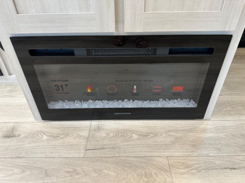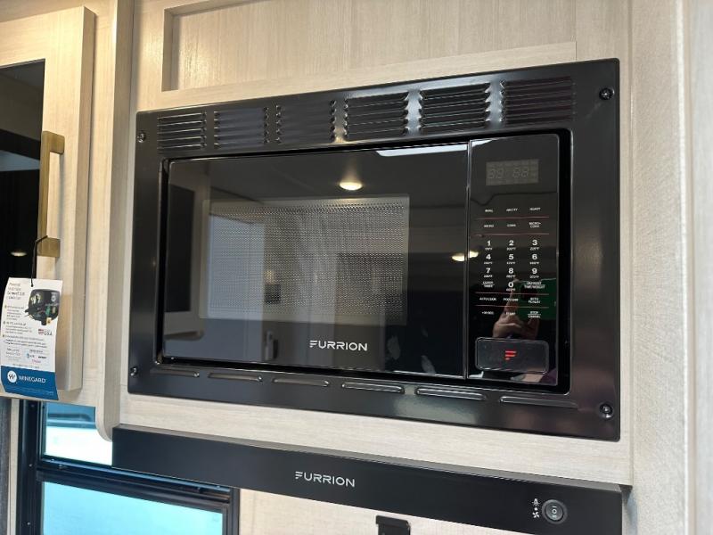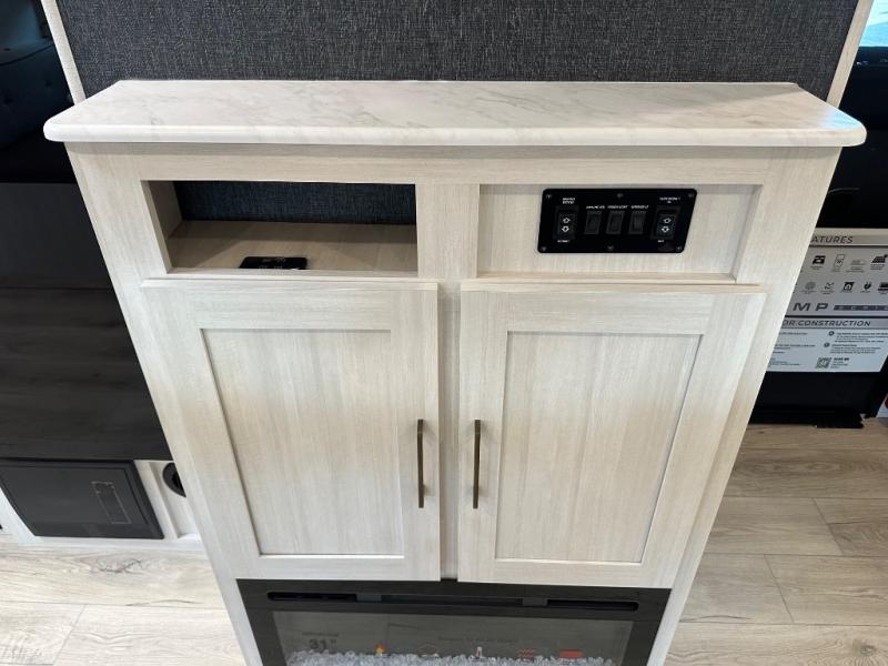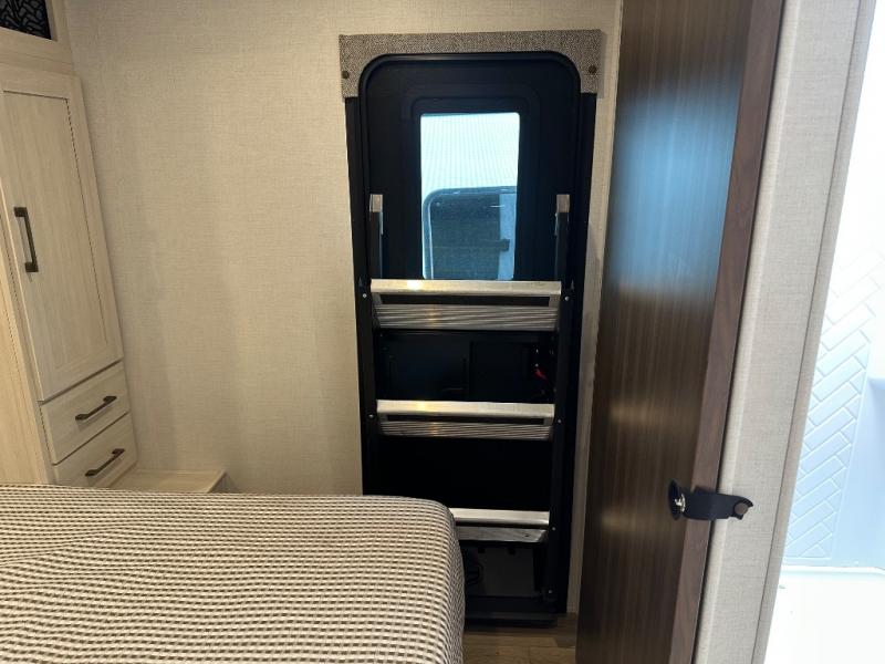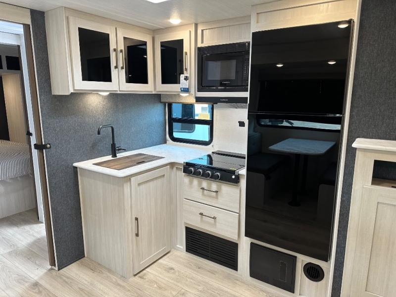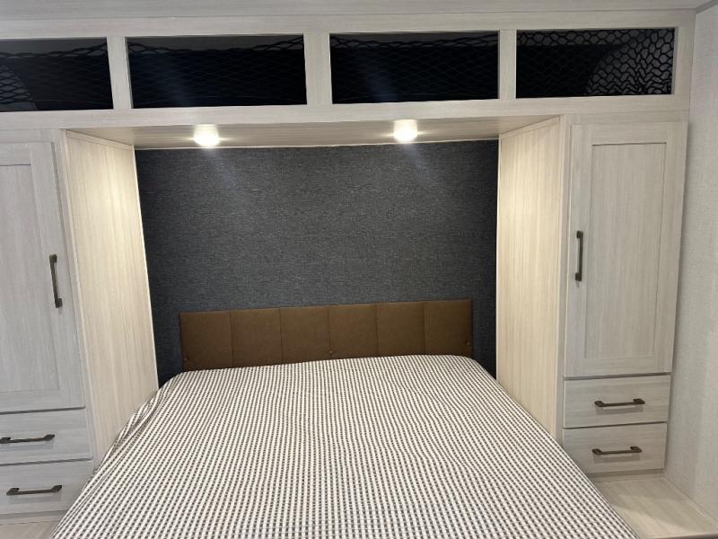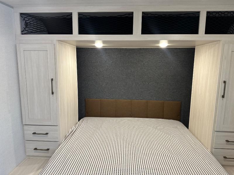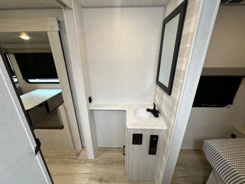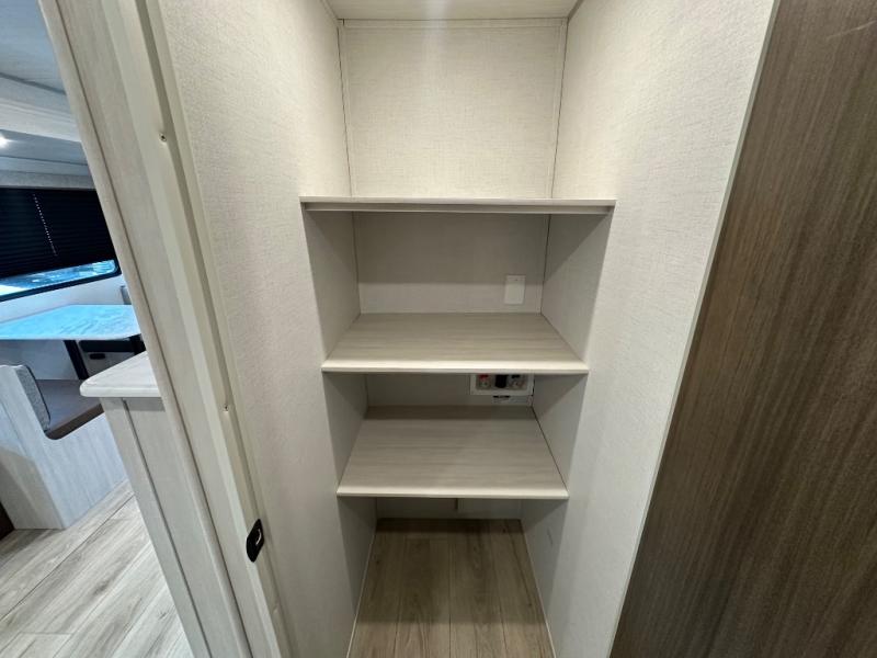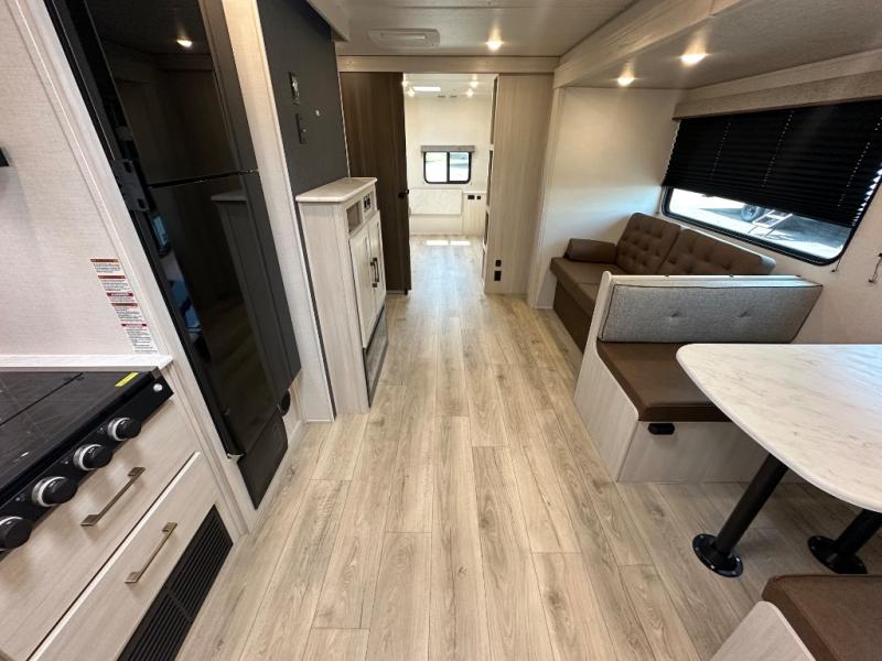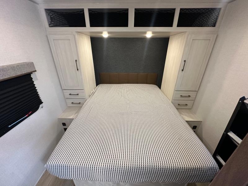 Head to your favorite camping spot with your favorite people in this spacious, dual entry travel trailer! The large slide out houses the booth dinette and sofa where you can relax in the evenings and even let guests sleep over who haven't claimed the triple bunks in the rear bunkhouse. There is also a bunkhouse sofa, two wardrobes, cubbies, and a flip-up desk if you need a space to work. A walk-thru bath is convenient for all, and the full kitchen lets you whip up your best meals in the microwave with an air fryer. There is also a walk-in pantry with washer and dryer prep if you choose to add those appliances. When it's time to call it a night, the front master bedroom with a queen bed will provide you with your own space to retreat to, and there are dual bedside wardrobes to keep your clothes organized.