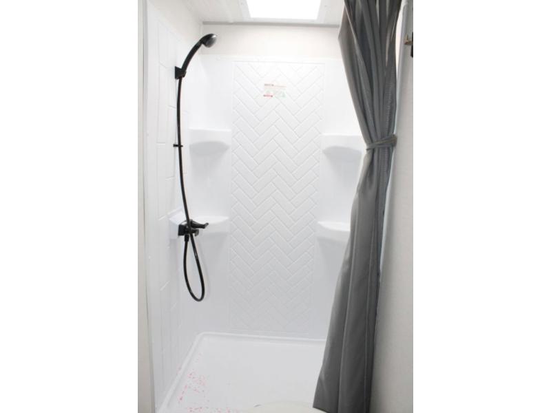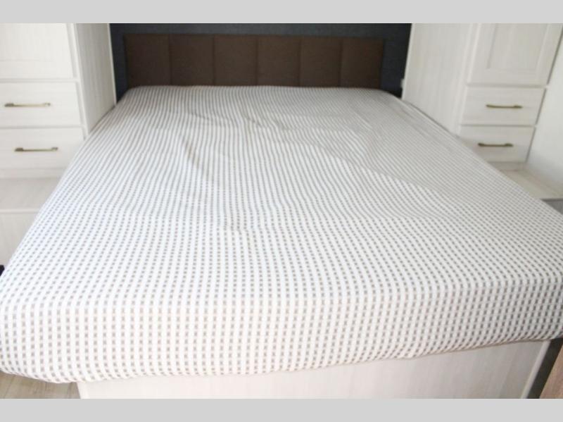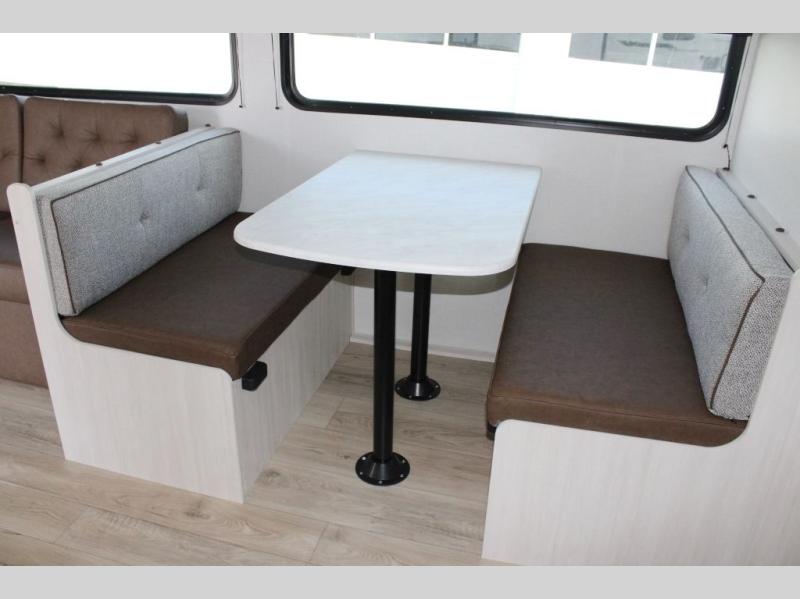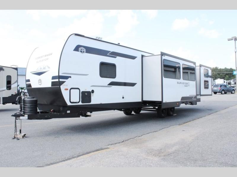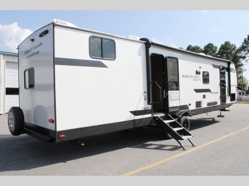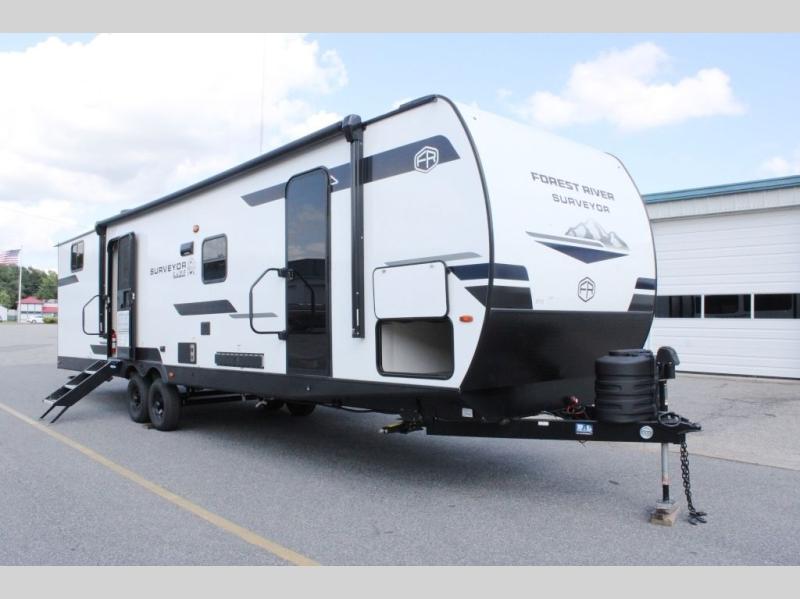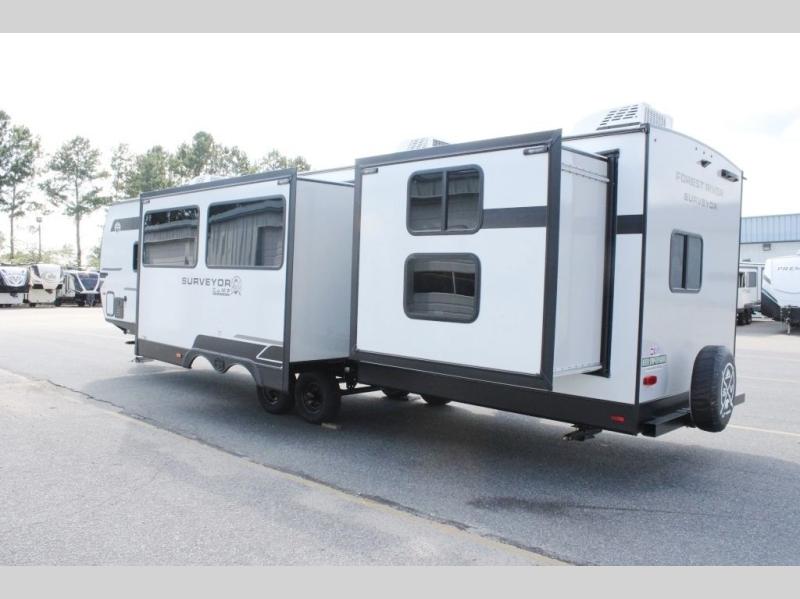 Value and versatility go hand-in-hand with the Surveyor Camp Series travel trailers by Forest River. The solid construction includes a 2" aluminum framed floor with block foam insulation and a sealed underbelly with forced heat and radiant foil insulation. A 100-watt roof mounted solar panel will provide some off-grid power, and the power tongue jack will let you easily hitch up and go whenever you're ready. Additional stand-out features include Surf(X) seamless countertops throughout, two A/C units, an electric awning with LED light strip, black glass friction hinge entry door(s), and so much more!