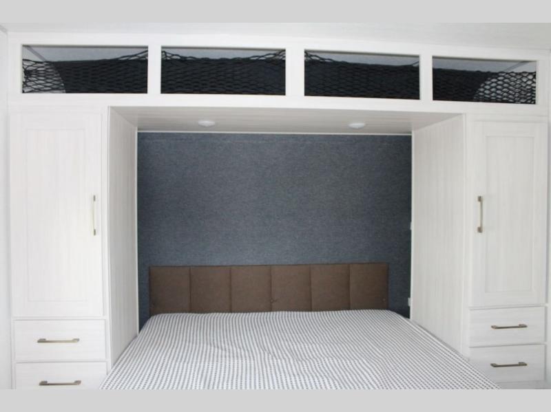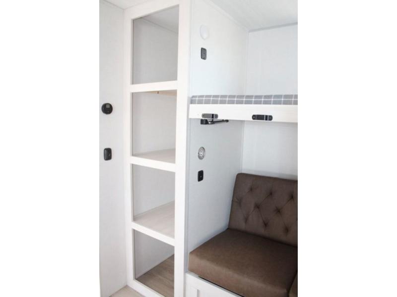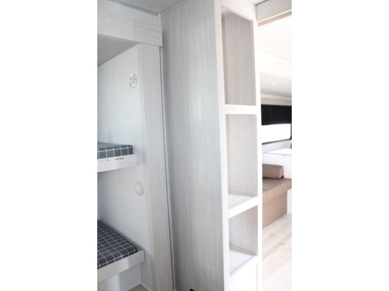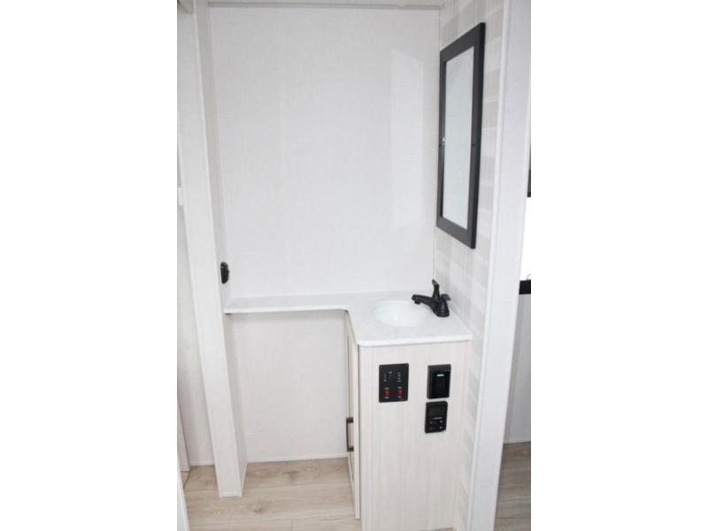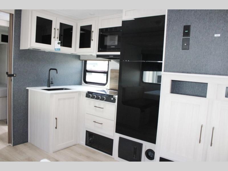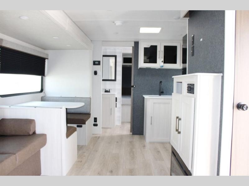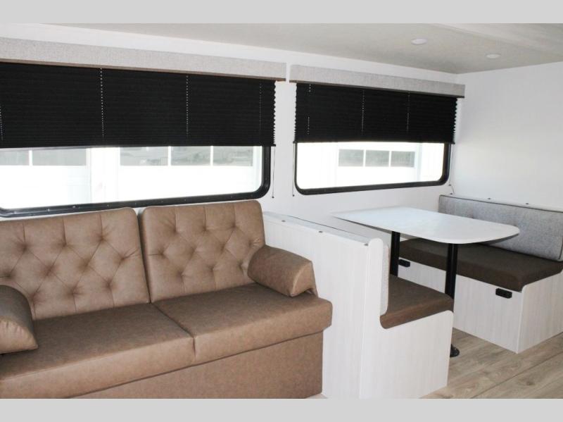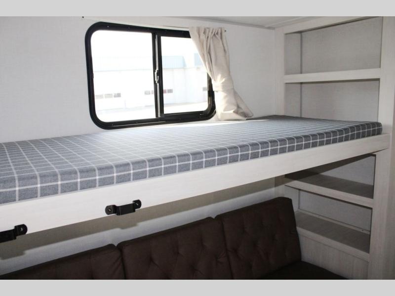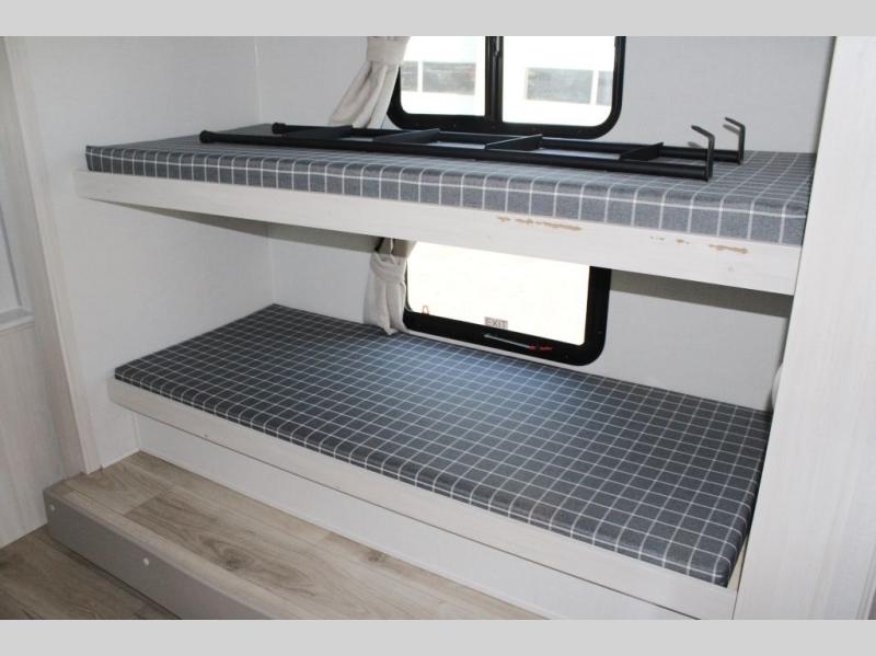 Head to your favorite camping spot with your favorite people in this spacious, dual entry travel trailer! The large slide out houses the booth dinette and sofa where you can relax in the evenings and even let guests sleep over who haven't claimed the triple bunks in the rear bunkhouse. There is also a bunkhouse sofa, two wardrobes, cubbies, and a flip-up desk if you need a space to work. A walk-thru bath is convenient for all, and the full kitchen lets you whip up your best meals in the microwave with an air fryer. There is also a walk-in pantry with washer and dryer prep if you choose to add those appliances. When it's time to call it a night, the front master bedroom with a queen bed will provide you with your own space to retreat to, and there are dual bedside wardrobes to keep your clothes organized.