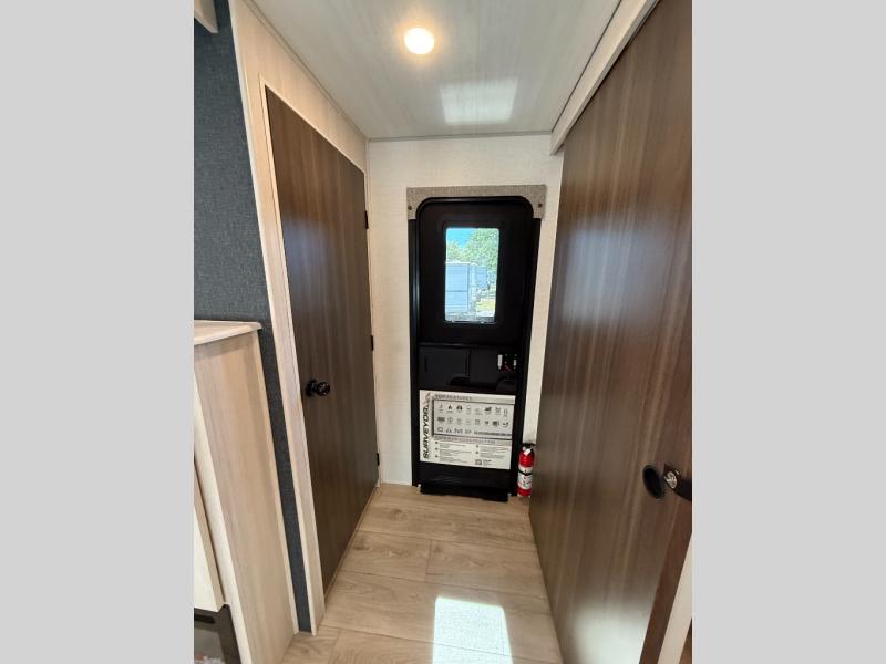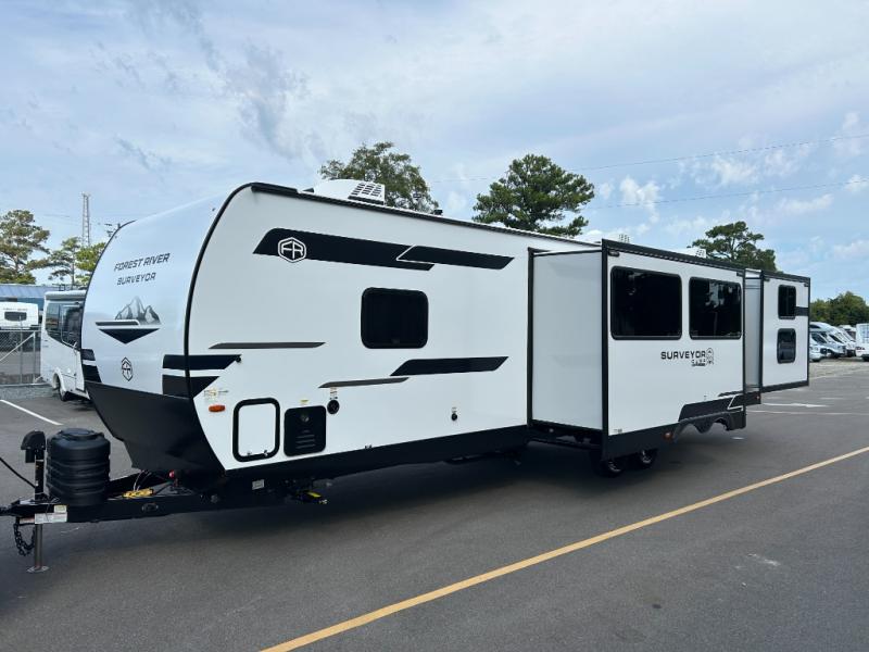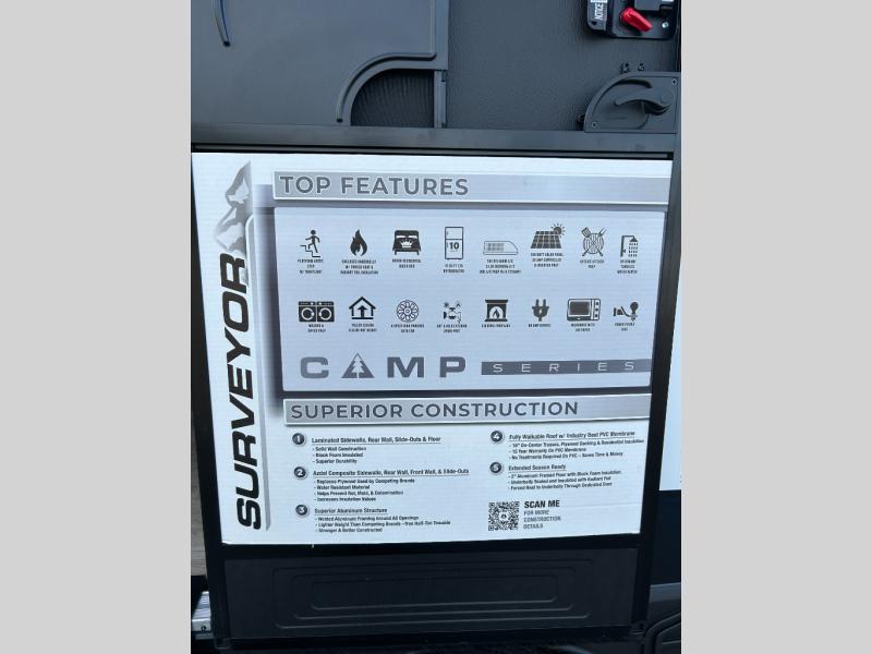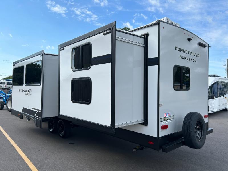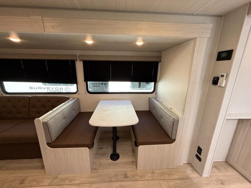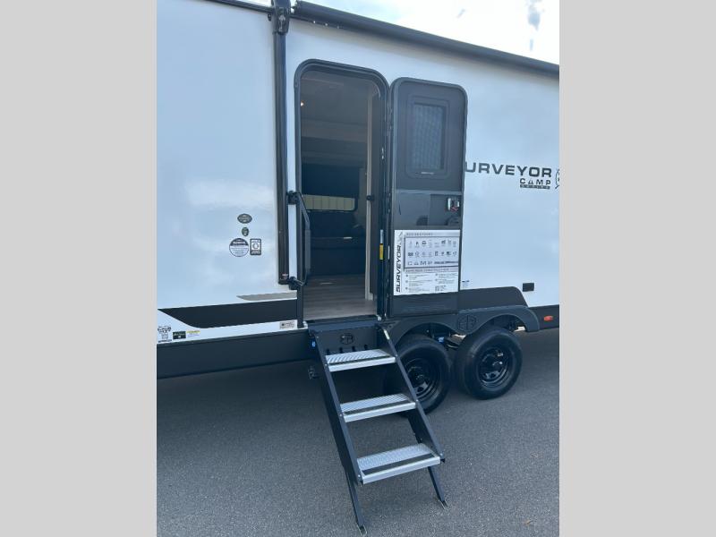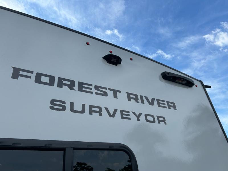 Value and versatility go hand-in-hand with the Surveyor Camp Series travel trailers by Forest River. The solid construction includes a 2" aluminum framed floor with block foam insulation and a sealed underbelly with forced heat and radiant foil insulation. A 100-watt roof mounted solar panel will provide some off-grid power, and the power tongue jack will let you easily hitch up and go whenever you're ready. Additional stand-out features include Surf(X) seamless countertops throughout, two A/C units, an electric awning with LED light strip, black glass friction hinge entry door(s), and so much more!