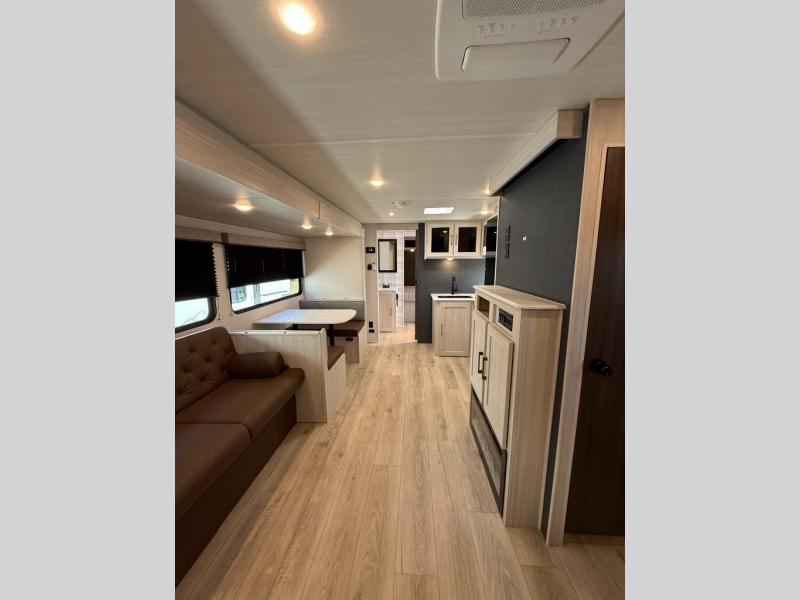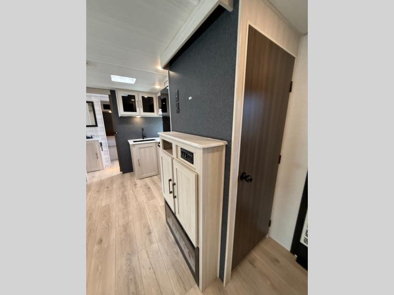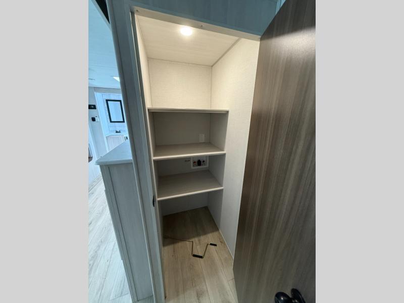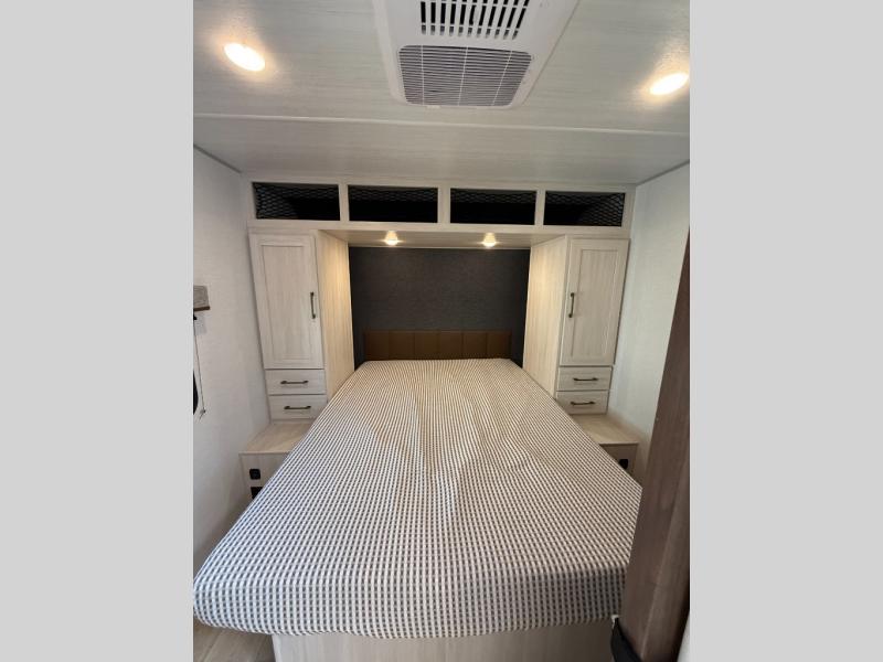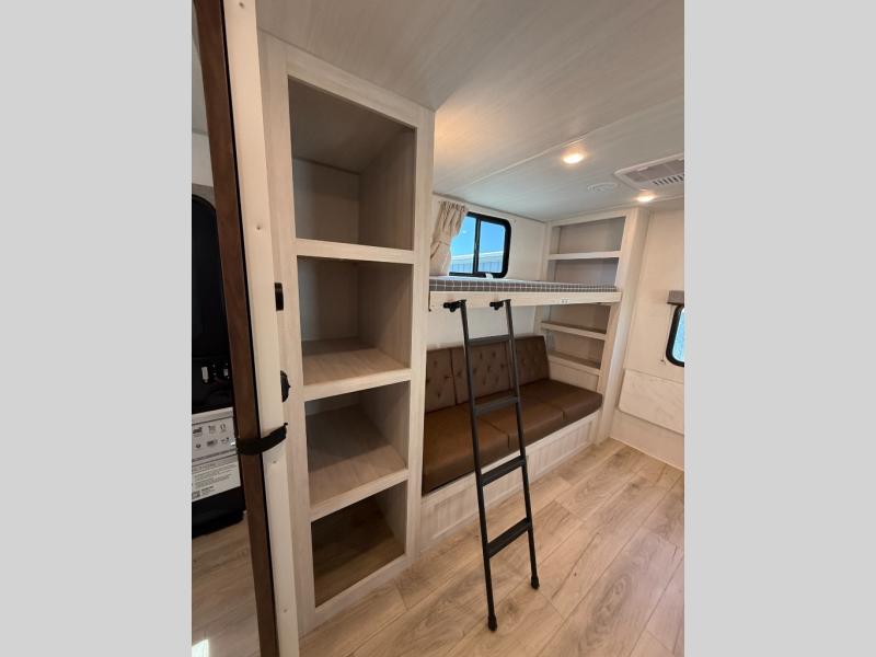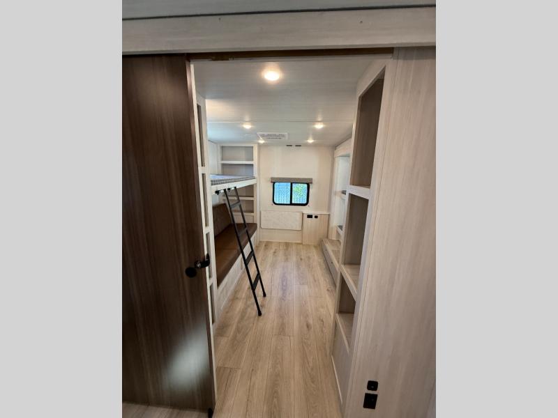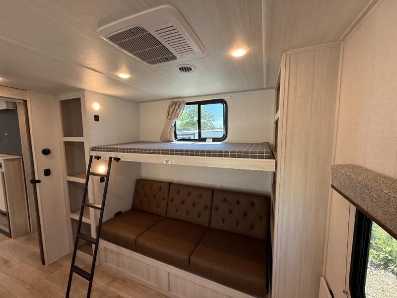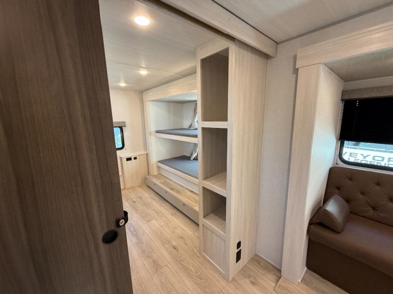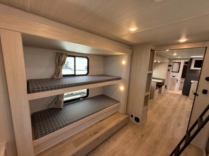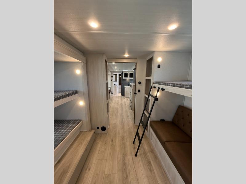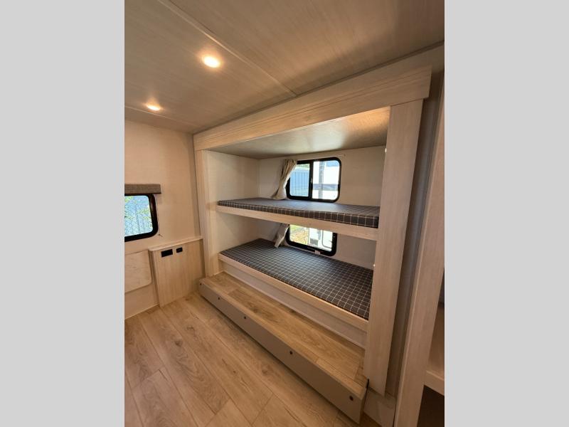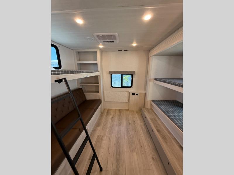 Head to your favorite camping spot with your favorite people in this spacious, dual entry travel trailer! The large slide out houses the booth dinette and sofa where you can relax in the evenings and even let guests sleep over who haven't claimed the triple bunks in the rear bunkhouse. There is also a bunkhouse sofa, two wardrobes, cubbies, and a flip-up desk if you need a space to work. A walk-thru bath is convenient for all, and the full kitchen lets you whip up your best meals in the microwave with an air fryer. There is also a walk-in pantry with washer and dryer prep if you choose to add those appliances. When it's time to call it a night, the front master bedroom with a queen bed will provide you with your own space to retreat to, and there are dual bedside wardrobes to keep your clothes organized.