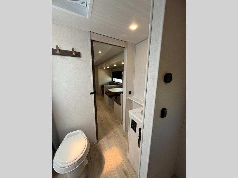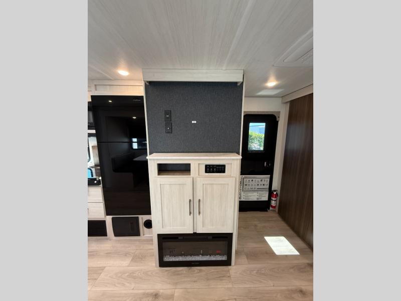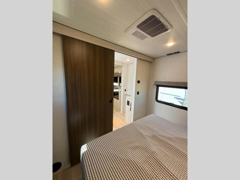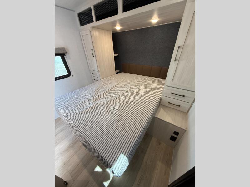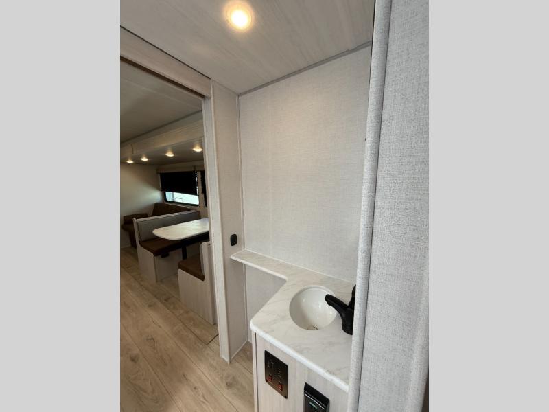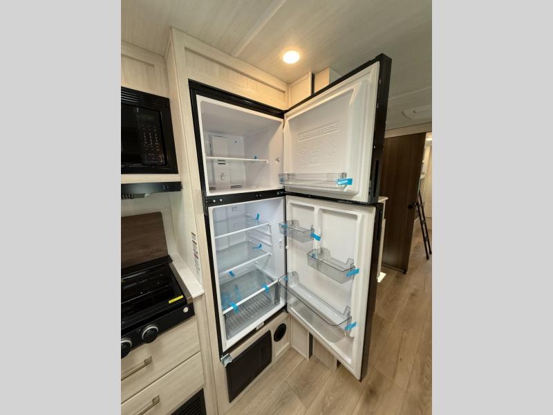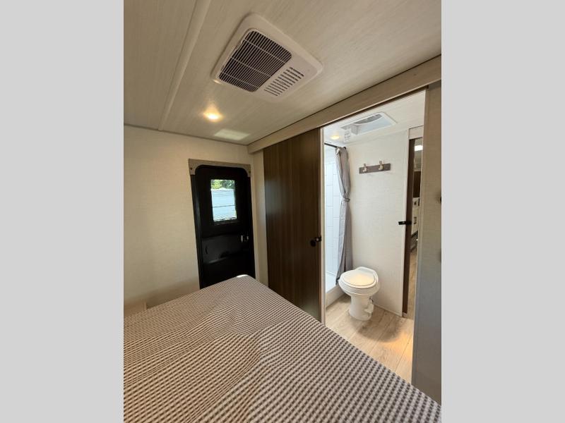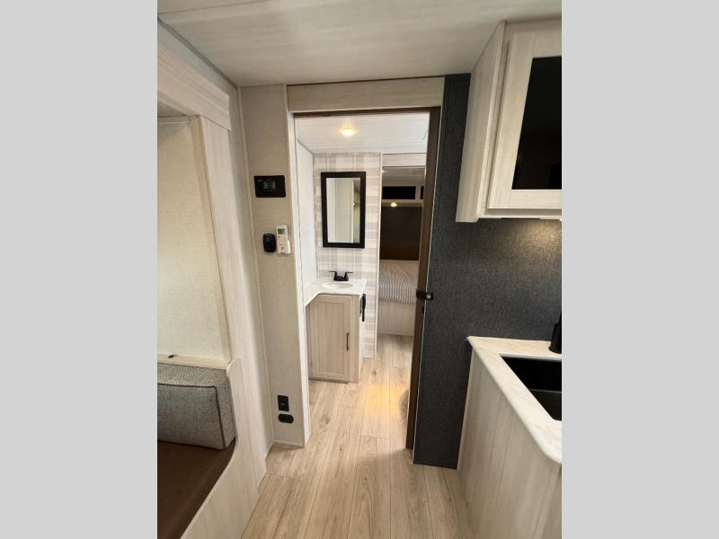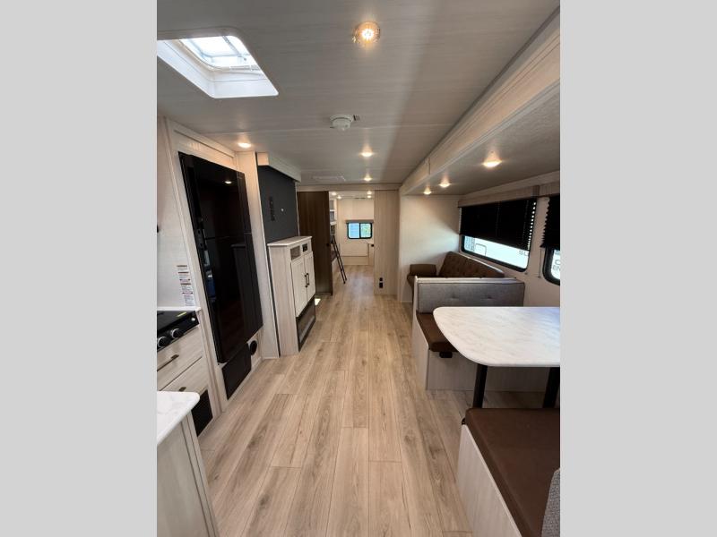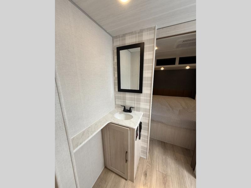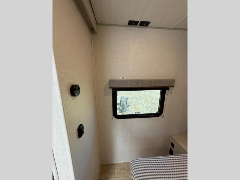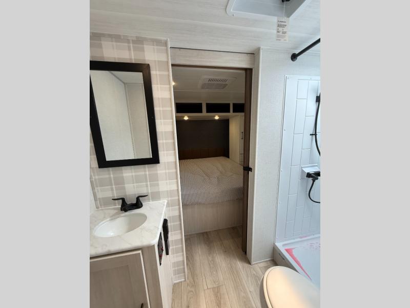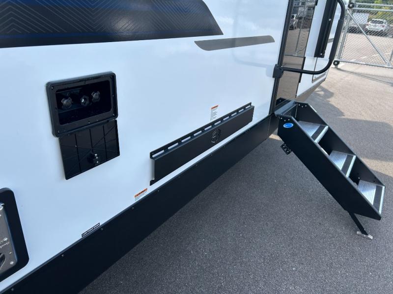 Head to your favorite camping spot with your favorite people in this spacious, dual entry travel trailer! The large slide out houses the booth dinette and sofa where you can relax in the evenings and even let guests sleep over who haven't claimed the triple bunks in the rear bunkhouse. There is also a bunkhouse sofa, two wardrobes, cubbies, and a flip-up desk if you need a space to work. A walk-thru bath is convenient for all, and the full kitchen lets you whip up your best meals in the microwave with an air fryer. There is also a walk-in pantry with washer and dryer prep if you choose to add those appliances. When it's time to call it a night, the front master bedroom with a queen bed will provide you with your own space to retreat to, and there are dual bedside wardrobes to keep your clothes organized.
