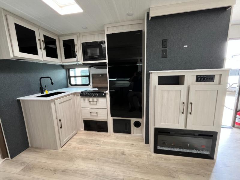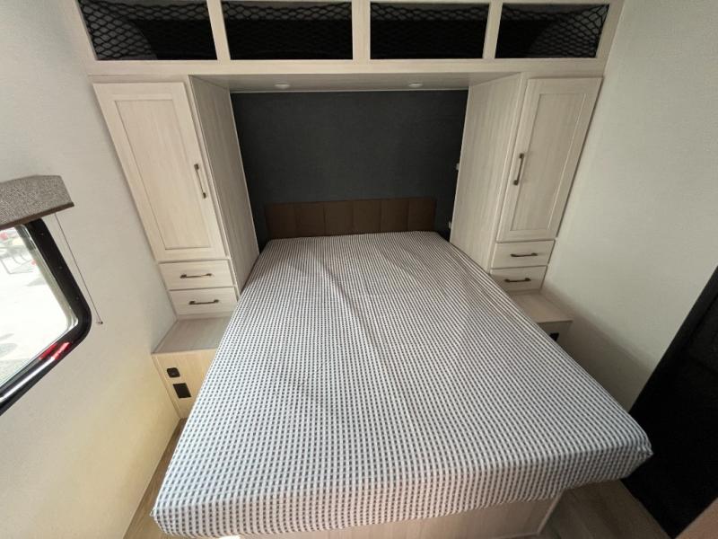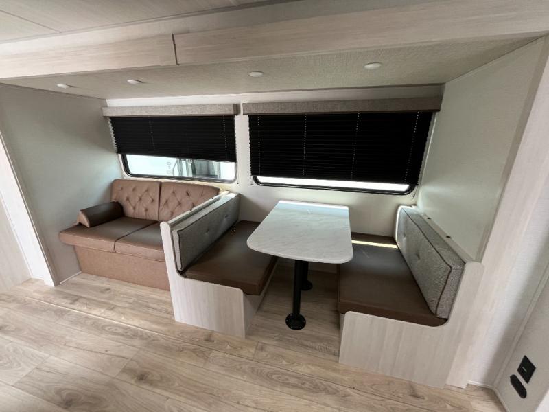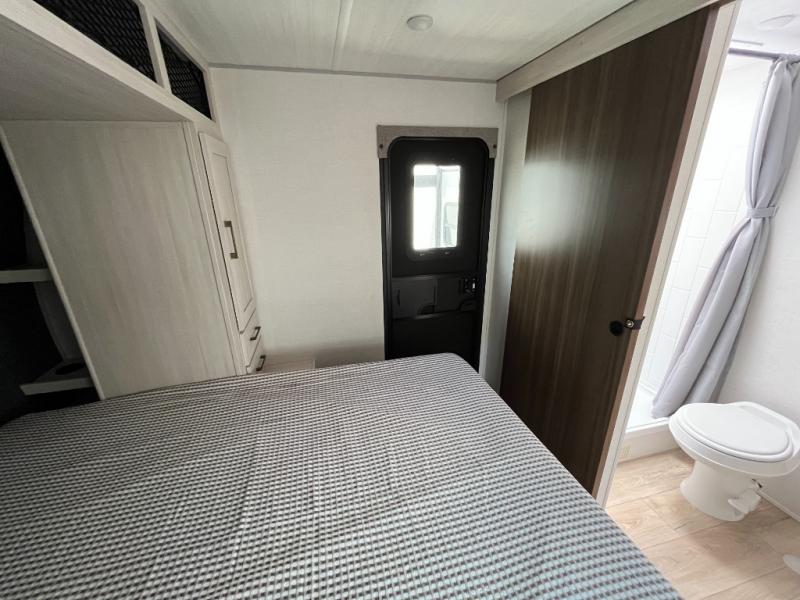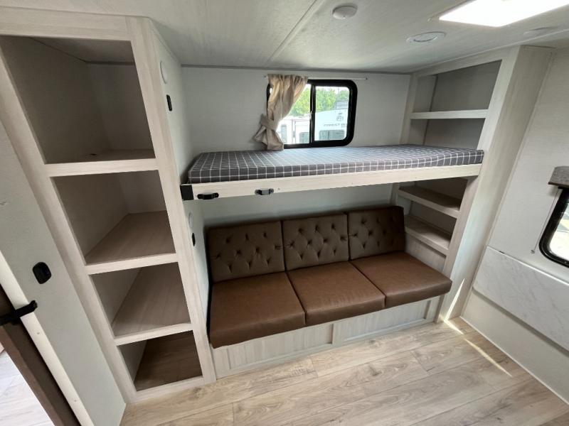 Head to your favorite camping spot with your favorite people in this spacious, dual entry travel trailer! The large slide out houses the booth dinette and sofa where you can relax in the evenings and even let guests sleep over who haven't claimed the triple bunks in the rear bunkhouse. There is also a bunkhouse sofa, two wardrobes, cubbies, and a flip-up desk if you need a space to work. A walk-thru bath is convenient for all, and the full kitchen lets you whip up your best meals in the microwave with an air fryer. There is also a walk-in pantry with washer and dryer prep if you choose to add those appliances. When it's time to call it a night, the front master bedroom with a queen bed will provide you with your own space to retreat to, and there are dual bedside wardrobes to keep your clothes organized.
