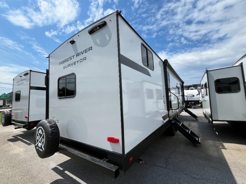 Value and versatility go hand-in-hand with the Surveyor Camp Series travel trailers by Forest River. The solid construction includes a 2" aluminum framed floor with block foam insulation and a sealed underbelly with forced heat and radiant foil insulation. A 100-watt roof mounted solar panel will provide some off-grid power, and the power tongue jack will let you easily hitch up and go whenever you're ready. Additional stand-out features include Surf(X) seamless countertops throughout, two A/C units, an electric awning with LED light strip, black glass friction hinge entry door(s), and so much more!