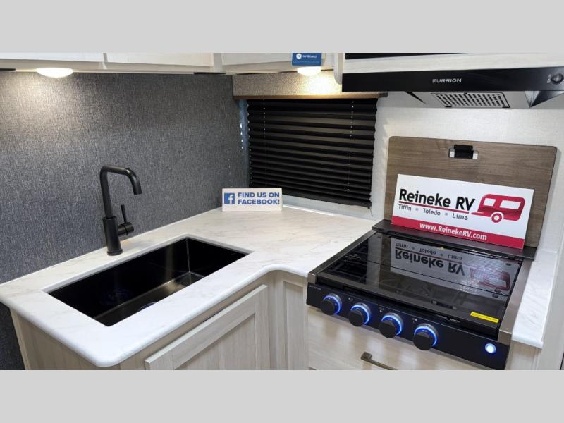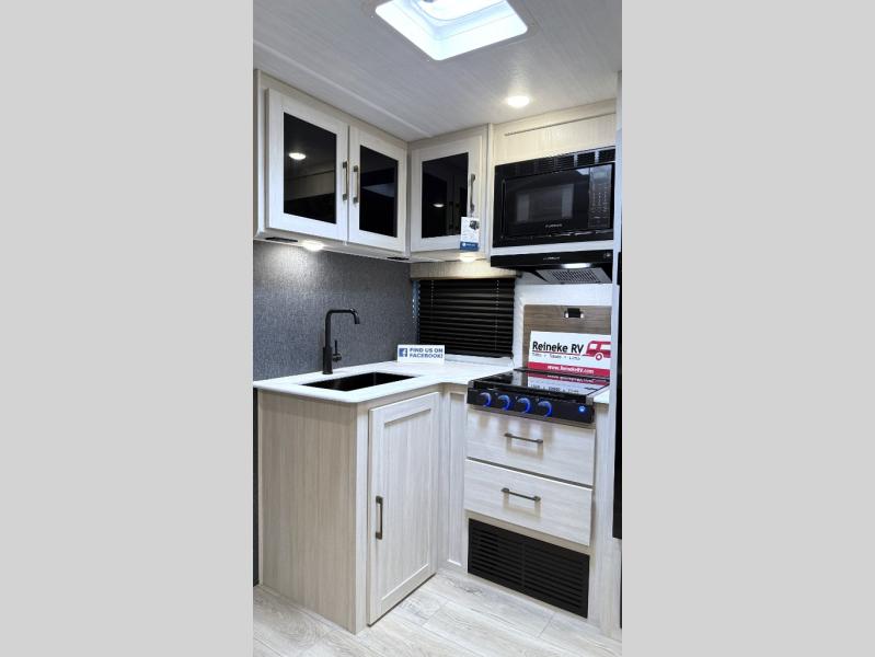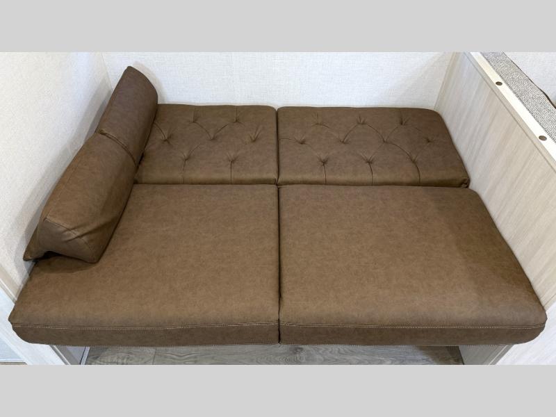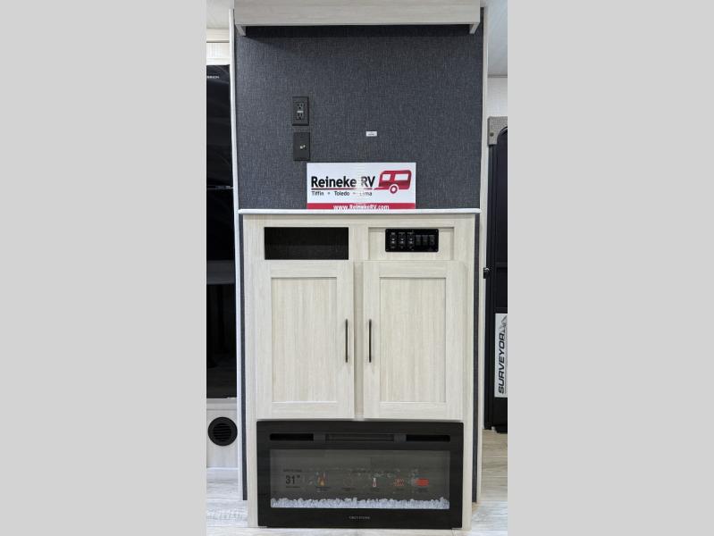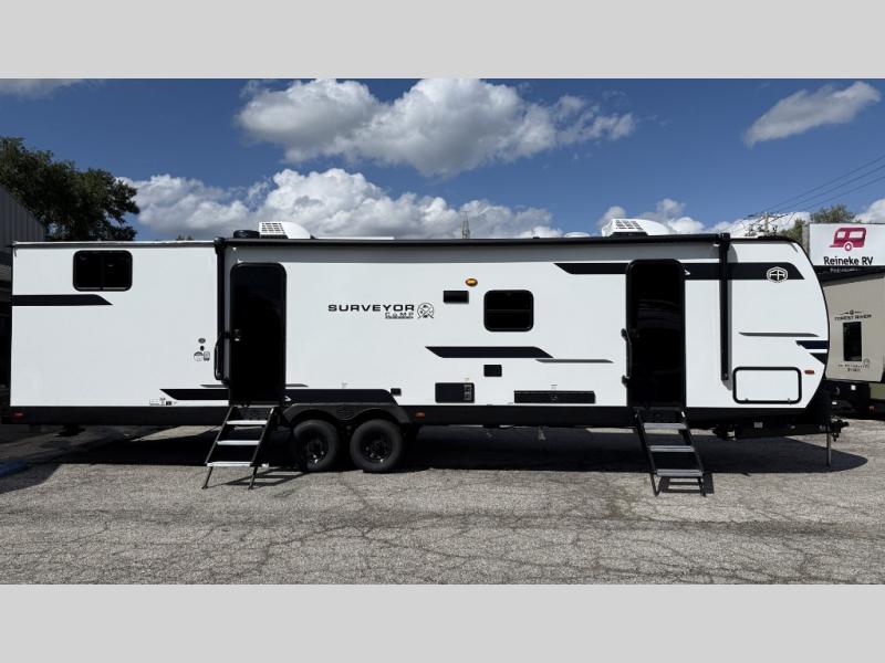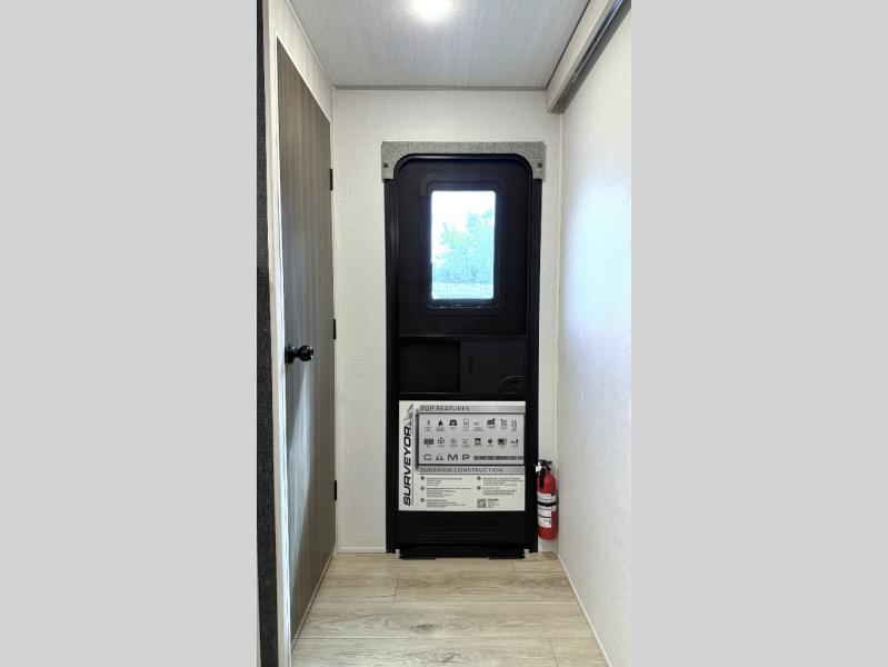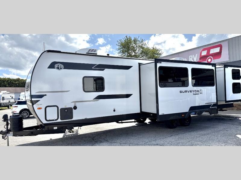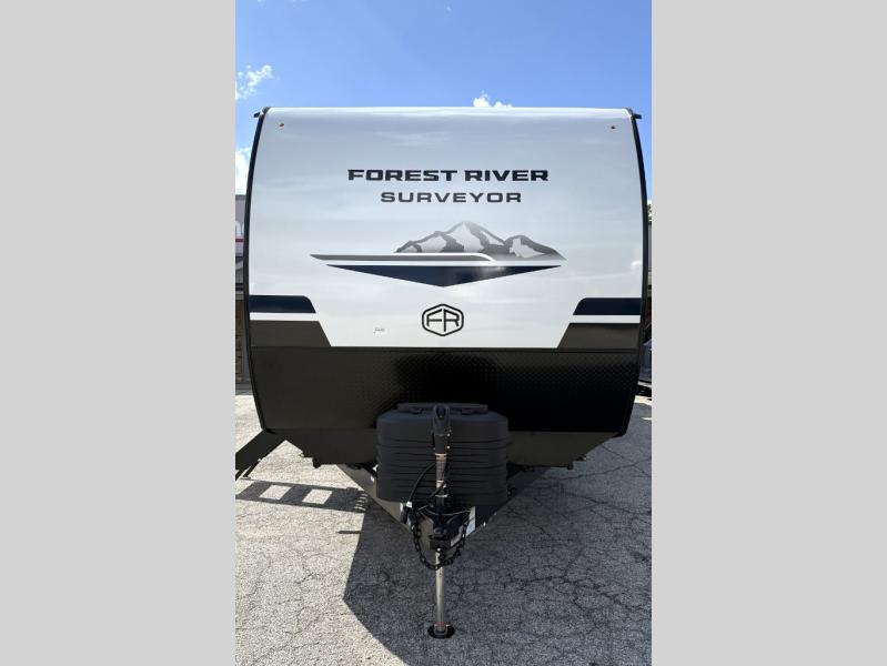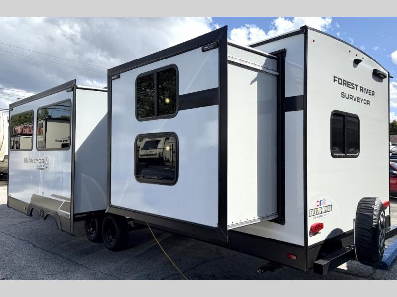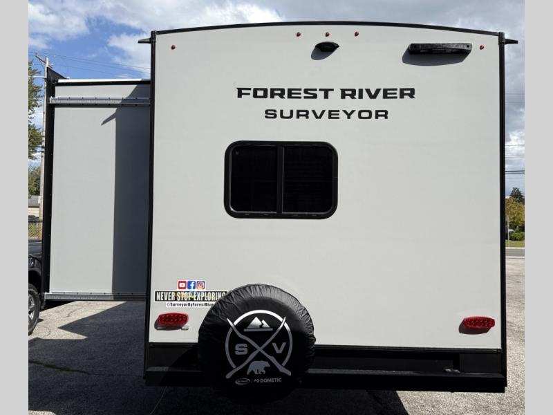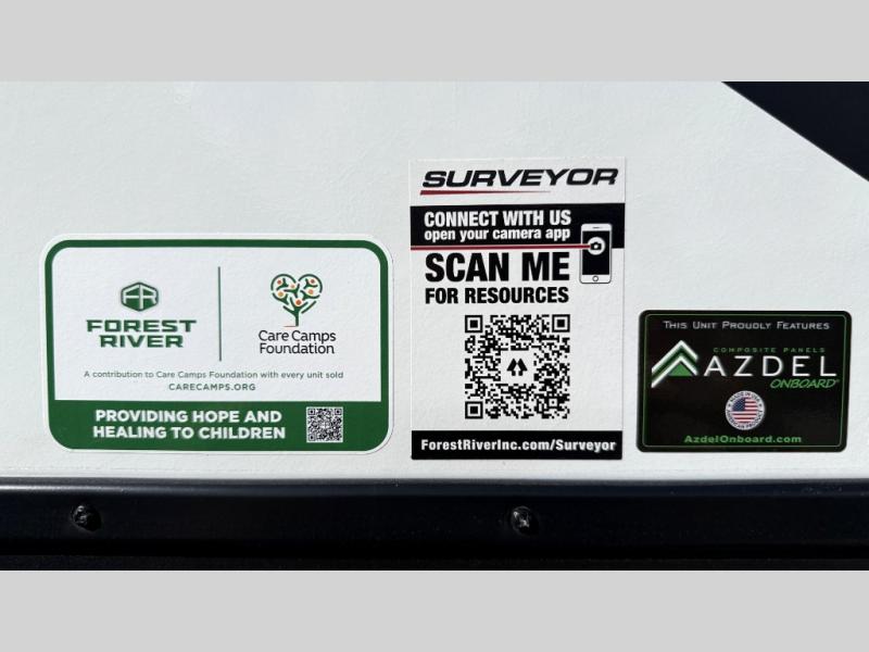 Value and versatility go hand-in-hand with the Surveyor Camp Series travel trailers by Forest River. The solid construction includes a 2" aluminum framed floor with block foam insulation and a sealed underbelly with forced heat and radiant foil insulation. A 100-watt roof mounted solar panel will provide some off-grid power, and the power tongue jack will let you easily hitch up and go whenever you're ready. Additional stand-out features include Surf(X) seamless countertops throughout, two A/C units, an electric awning with LED light strip, black glass friction hinge entry door(s), and so much more!