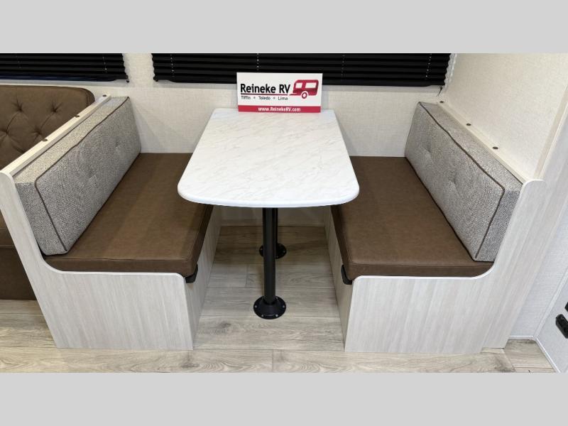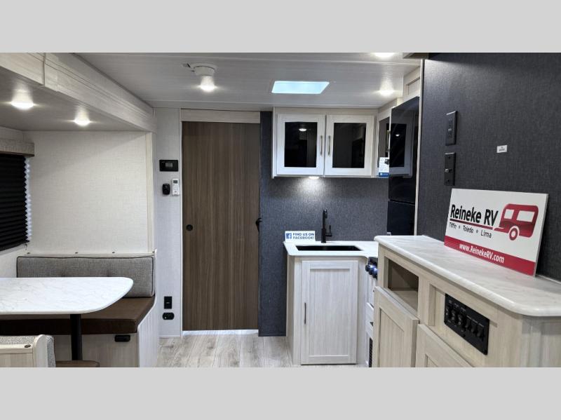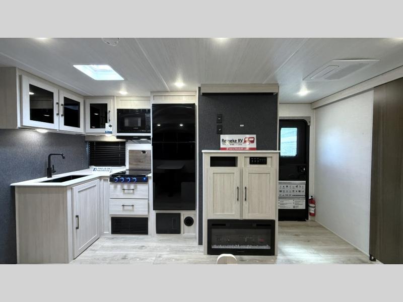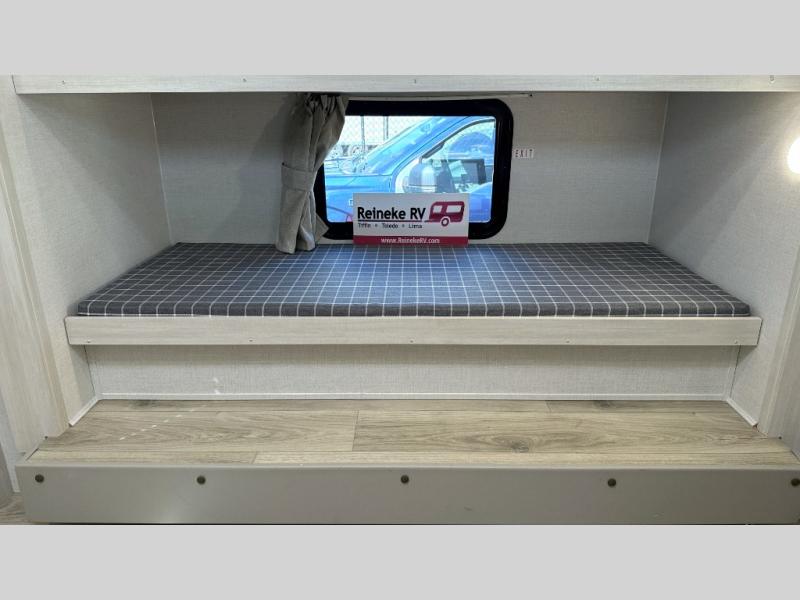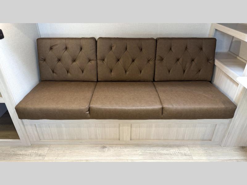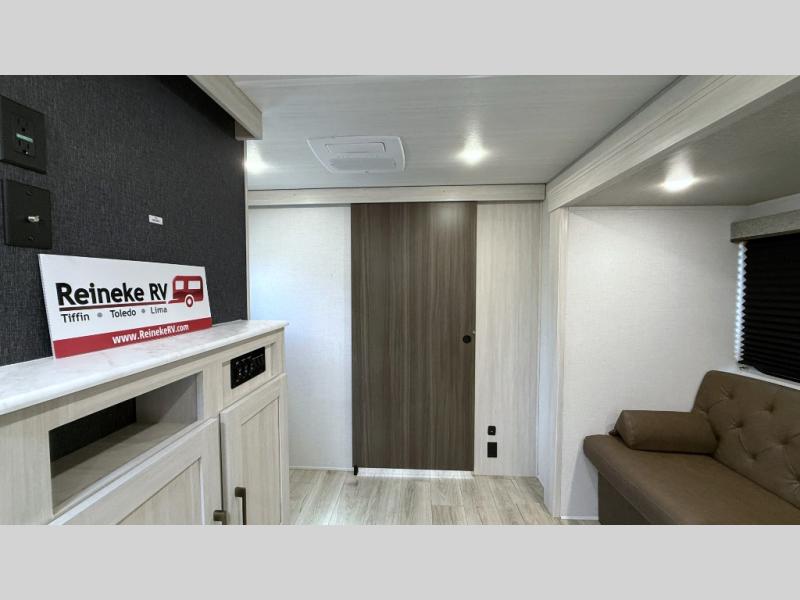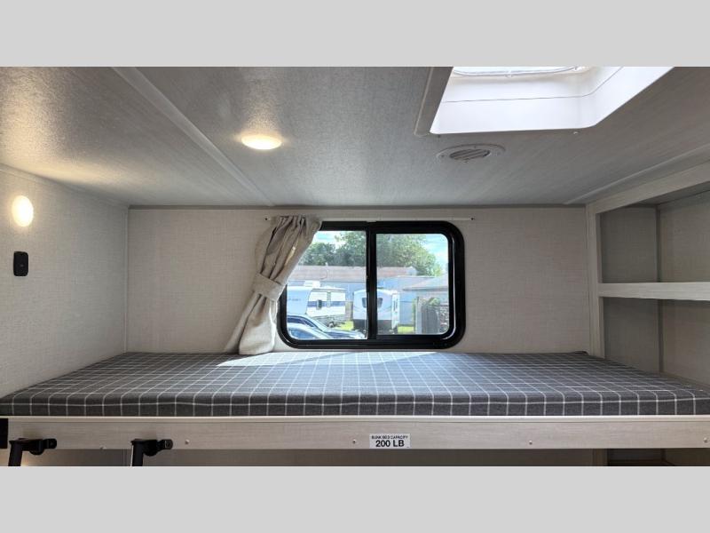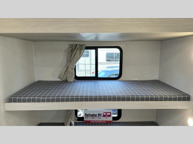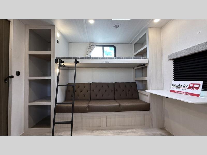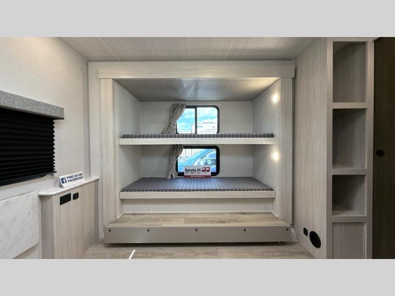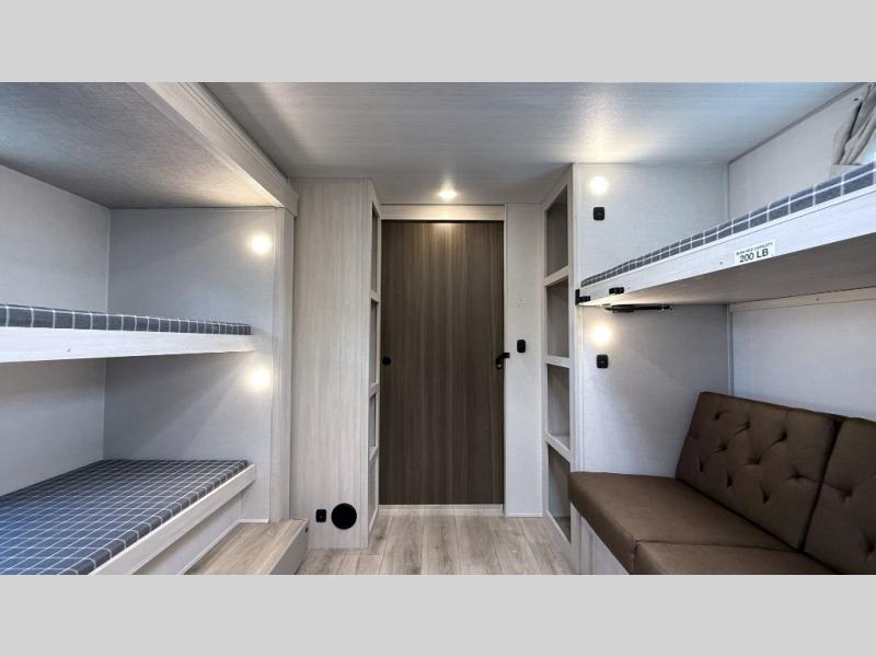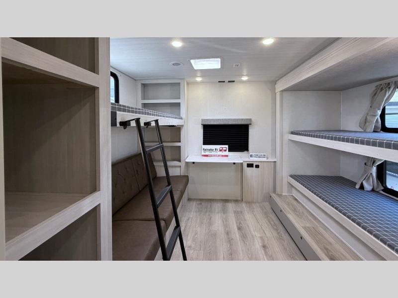 Head to your favorite camping spot with your favorite people in this spacious, dual entry travel trailer! The large slide out houses the booth dinette and sofa where you can relax in the evenings and even let guests sleep over who haven't claimed the triple bunks in the rear bunkhouse. There is also a bunkhouse sofa, two wardrobes, cubbies, and a flip-up desk if you need a space to work. A walk-thru bath is convenient for all, and the full kitchen lets you whip up your best meals in the microwave with an air fryer. There is also a walk-in pantry with washer and dryer prep if you choose to add those appliances. When it's time to call it a night, the front master bedroom with a queen bed will provide you with your own space to retreat to, and there are dual bedside wardrobes to keep your clothes organized.