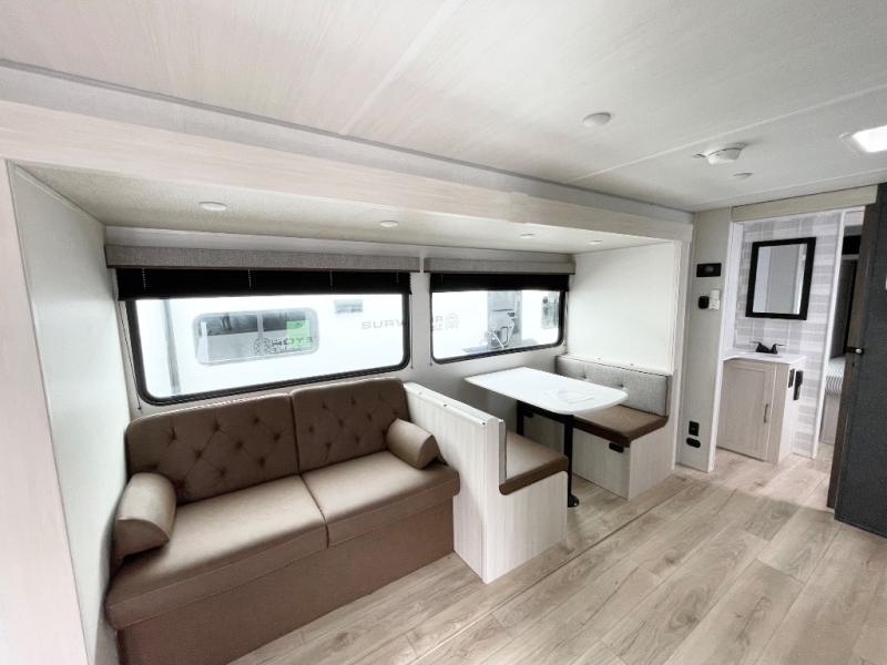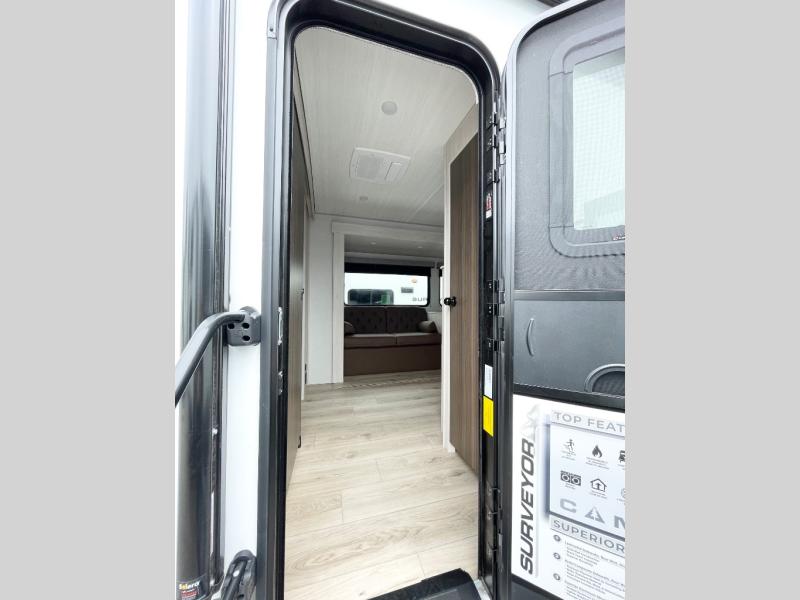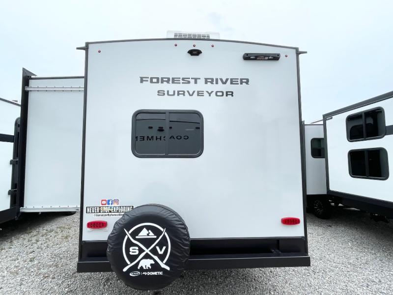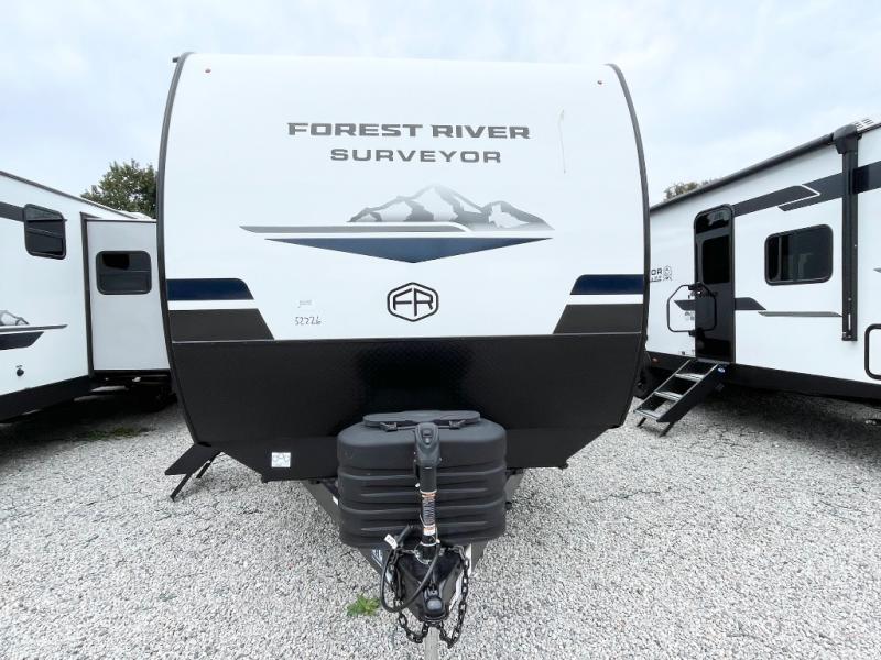 Value and versatility go hand-in-hand with the Surveyor Camp Series travel trailers by Forest River. The solid construction includes a 2" aluminum framed floor with block foam insulation and a sealed underbelly with forced heat and radiant foil insulation. A 100-watt roof mounted solar panel will provide some off-grid power, and the power tongue jack will let you easily hitch up and go whenever you're ready. Additional stand-out features include Surf(X) seamless countertops throughout, two A/C units, an electric awning with LED light strip, black glass friction hinge entry door(s), and so much more!