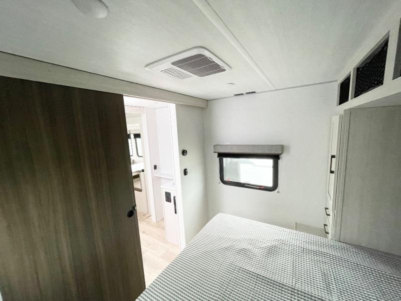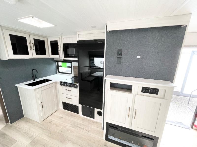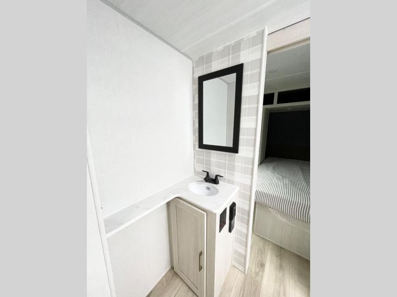 Head to your favorite camping spot with your favorite people in this spacious, dual entry travel trailer! The large slide out houses the booth dinette and sofa where you can relax in the evenings and even let guests sleep over who haven't claimed the triple bunks in the rear bunkhouse. There is also a bunkhouse sofa, two wardrobes, cubbies, and a flip-up desk if you need a space to work. A walk-thru bath is convenient for all, and the full kitchen lets you whip up your best meals in the microwave with an air fryer. There is also a walk-in pantry with washer and dryer prep if you choose to add those appliances. When it's time to call it a night, the front master bedroom with a queen bed will provide you with your own space to retreat to, and there are dual bedside wardrobes to keep your clothes organized.