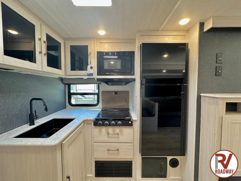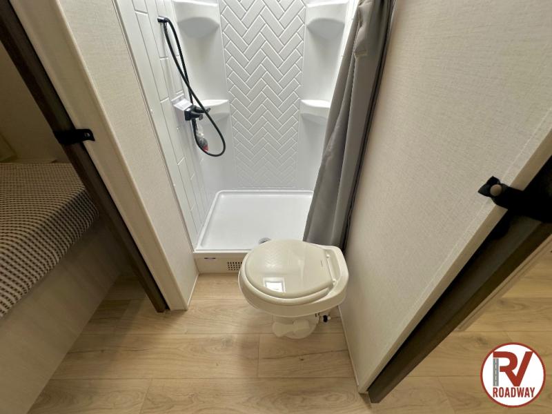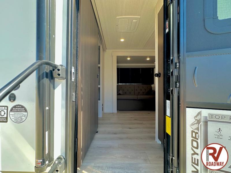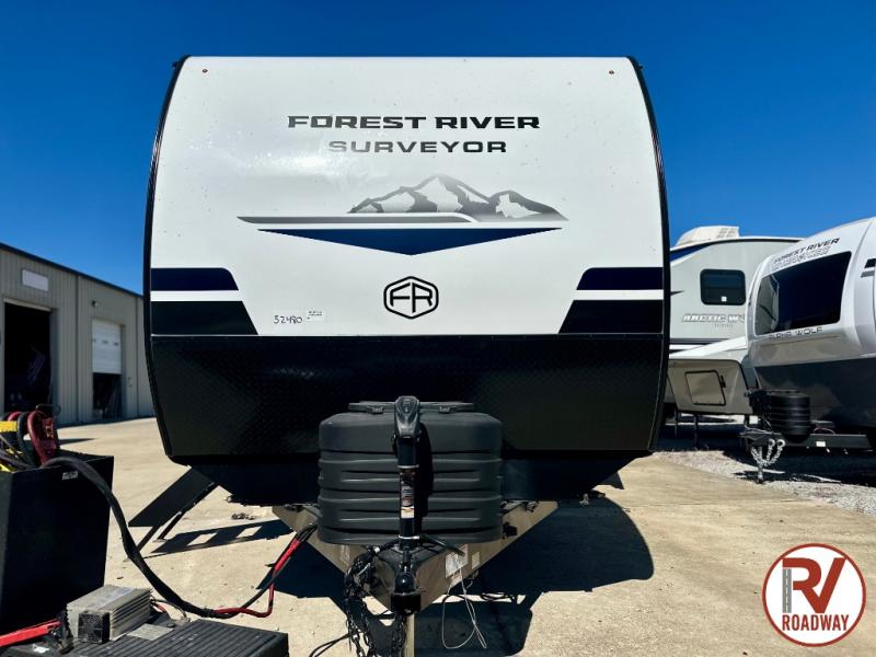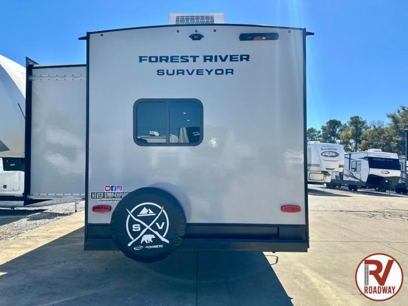 Value and versatility go hand-in-hand with the Surveyor Camp Series travel trailers by Forest River. The solid construction includes a 2" aluminum framed floor with block foam insulation and a sealed underbelly with forced heat and radiant foil insulation. A 100-watt roof mounted solar panel will provide some off-grid power, and the power tongue jack will let you easily hitch up and go whenever you're ready. Additional stand-out features include Surf(X) seamless countertops throughout, two A/C units, an electric awning with LED light strip, black glass friction hinge entry door(s), and so much more!