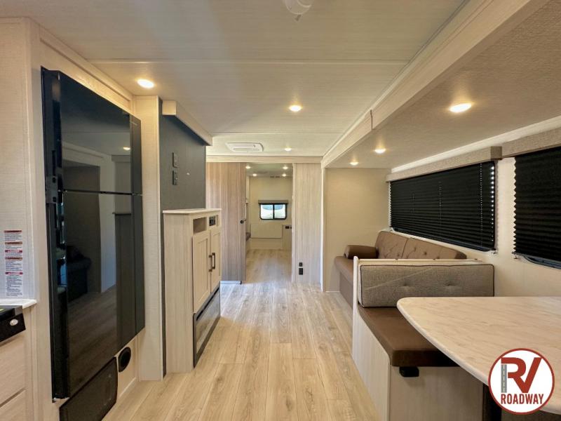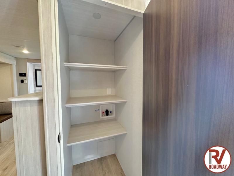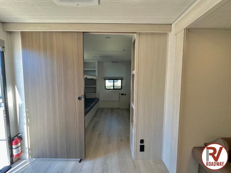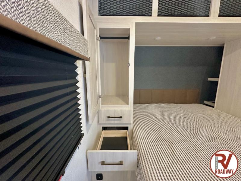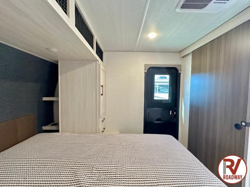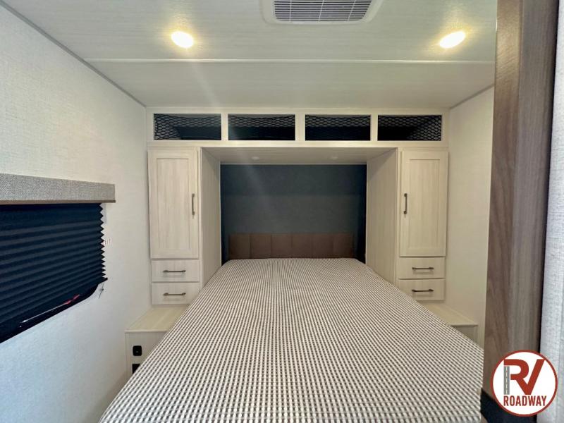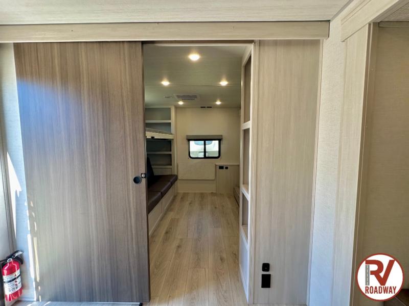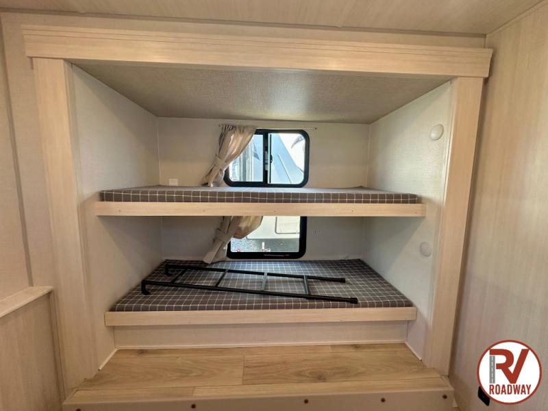 Head to your favorite camping spot with your favorite people in this spacious, dual entry travel trailer! The large slide out houses the booth dinette and sofa where you can relax in the evenings and even let guests sleep over who haven't claimed the triple bunks in the rear bunkhouse. There is also a bunkhouse sofa, two wardrobes, cubbies, and a flip-up desk if you need a space to work. A walk-thru bath is convenient for all, and the full kitchen lets you whip up your best meals in the microwave with an air fryer. There is also a walk-in pantry with washer and dryer prep if you choose to add those appliances. When it's time to call it a night, the front master bedroom with a queen bed will provide you with your own space to retreat to, and there are dual bedside wardrobes to keep your clothes organized.