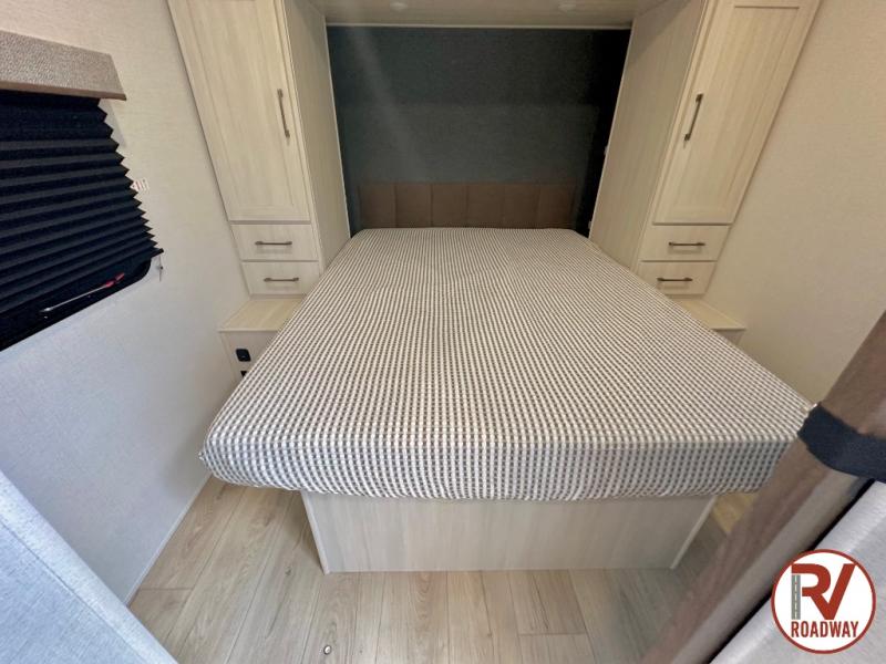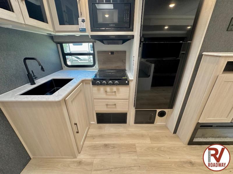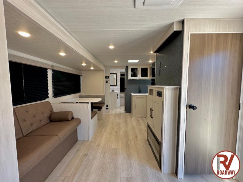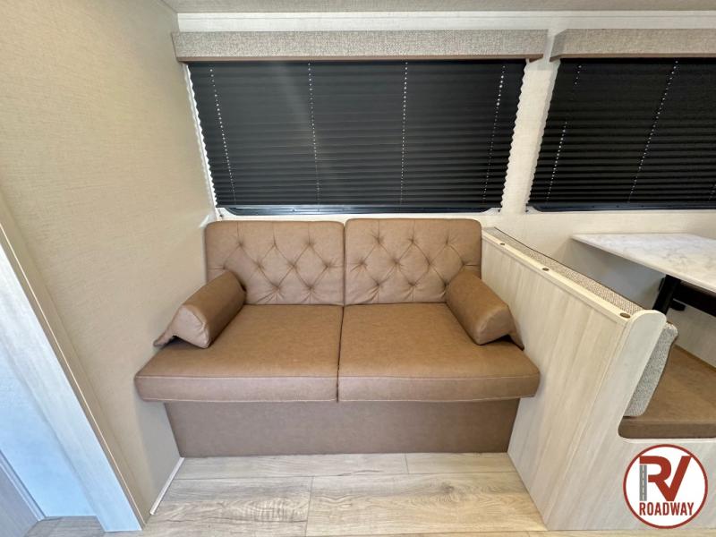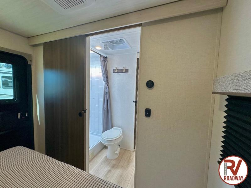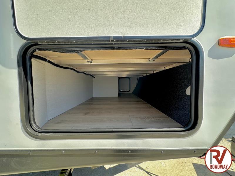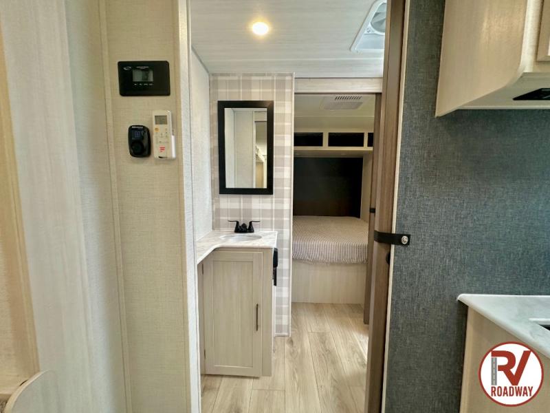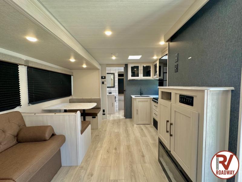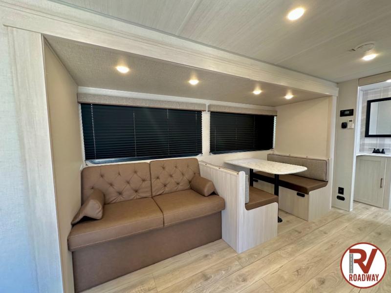 Head to your favorite camping spot with your favorite people in this spacious, dual entry travel trailer! The large slide out houses the booth dinette and sofa where you can relax in the evenings and even let guests sleep over who haven't claimed the triple bunks in the rear bunkhouse. There is also a bunkhouse sofa, two wardrobes, cubbies, and a flip-up desk if you need a space to work. A walk-thru bath is convenient for all, and the full kitchen lets you whip up your best meals in the microwave with an air fryer. There is also a walk-in pantry with washer and dryer prep if you choose to add those appliances. When it's time to call it a night, the front master bedroom with a queen bed will provide you with your own space to retreat to, and there are dual bedside wardrobes to keep your clothes organized.