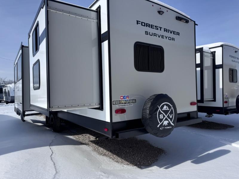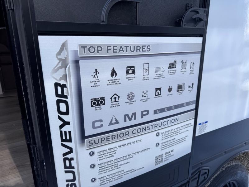 Value and versatility go hand-in-hand with the Surveyor Camp Series travel trailers by Forest River. The solid construction includes a 2" aluminum framed floor with block foam insulation and a sealed underbelly with forced heat and radiant foil insulation. A 100-watt roof mounted solar panel will provide some off-grid power, and the power tongue jack will let you easily hitch up and go whenever you're ready. Additional stand-out features include Surf(X) seamless countertops throughout, two A/C units, an electric awning with LED light strip, black glass friction hinge entry door(s), and so much more!