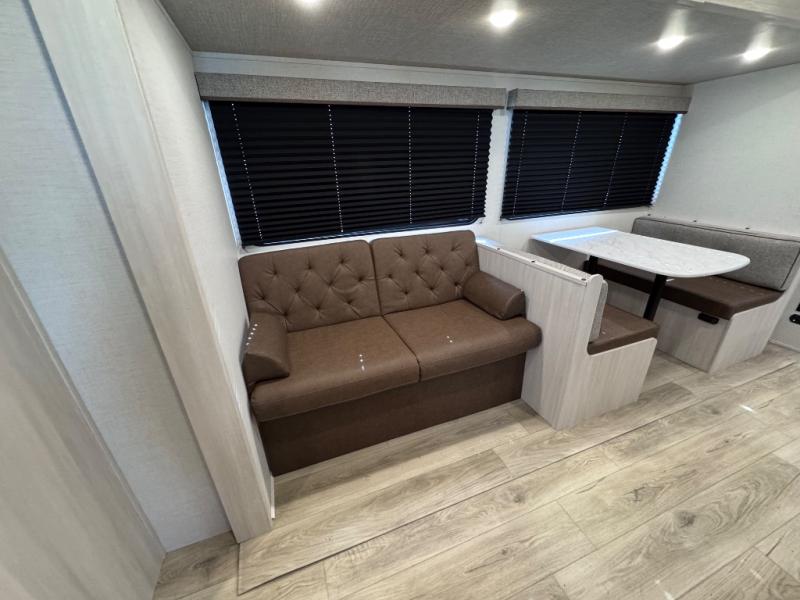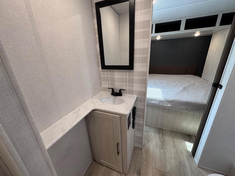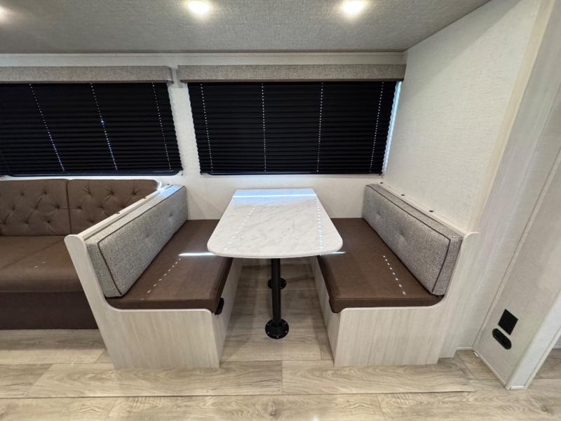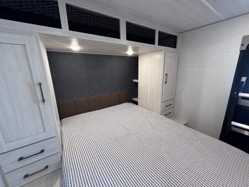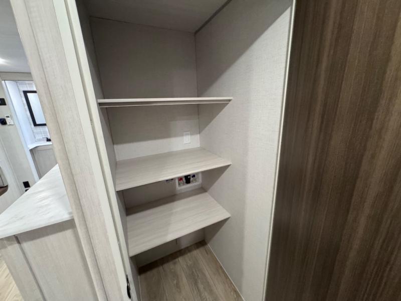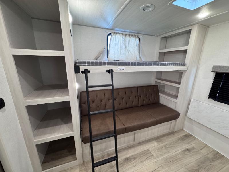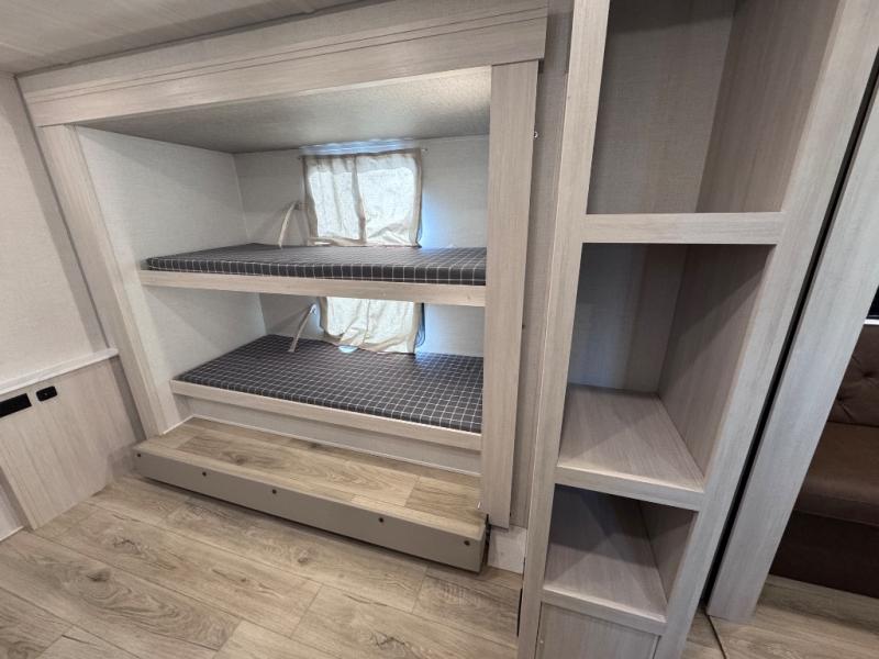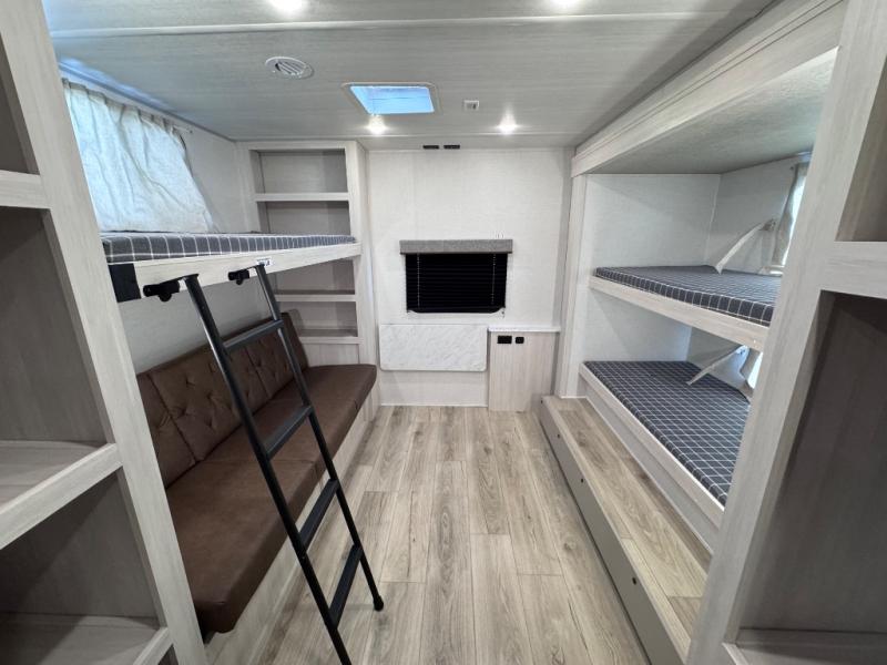 Head to your favorite camping spot with your favorite people in this spacious, dual entry travel trailer! The large slide out houses the booth dinette and sofa where you can relax in the evenings and even let guests sleep over who haven't claimed the triple bunks in the rear bunkhouse. There is also a bunkhouse sofa, two wardrobes, cubbies, and a flip-up desk if you need a space to work. A walk-thru bath is convenient for all, and the full kitchen lets you whip up your best meals in the microwave with an air fryer. There is also a walk-in pantry with washer and dryer prep if you choose to add those appliances. When it's time to call it a night, the front master bedroom with a queen bed will provide you with your own space to retreat to, and there are dual bedside wardrobes to keep your clothes organized.
