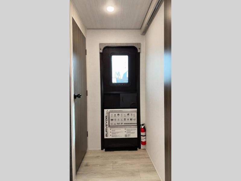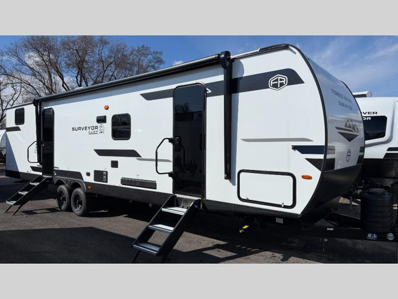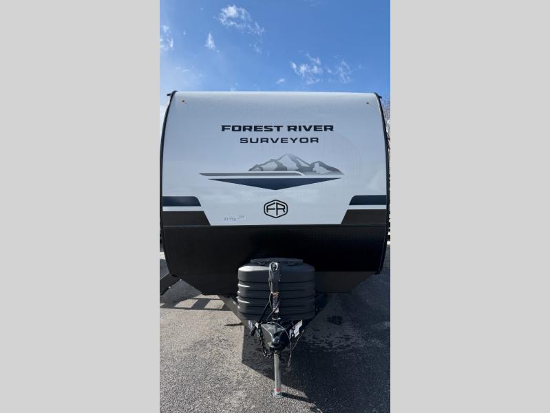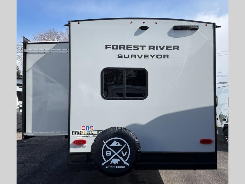 Value and versatility go hand-in-hand with the Surveyor Camp Series travel trailers by Forest River. The solid construction includes a 2" aluminum framed floor with block foam insulation and a sealed underbelly with forced heat and radiant foil insulation. A 100-watt roof mounted solar panel will provide some off-grid power, and the power tongue jack will let you easily hitch up and go whenever you're ready. Additional stand-out features include Surf(X) seamless countertops throughout, two A/C units, an electric awning with LED light strip, black glass friction hinge entry door(s), and so much more!