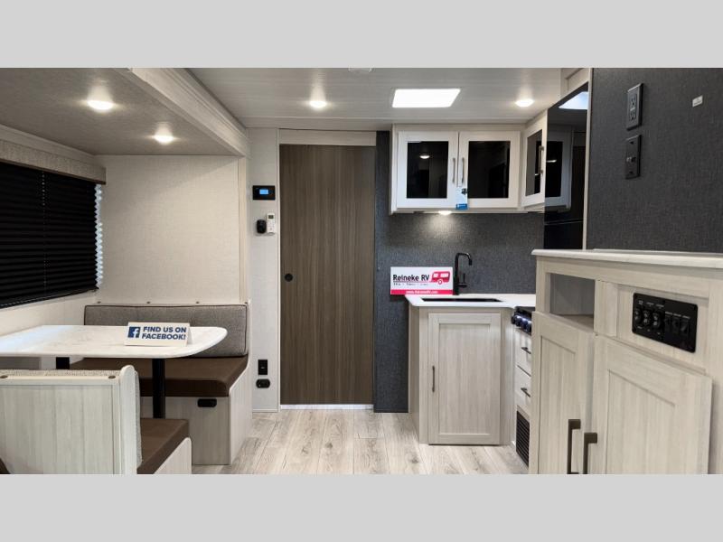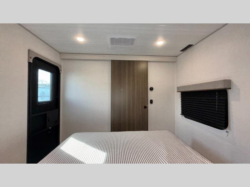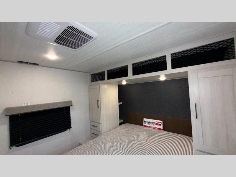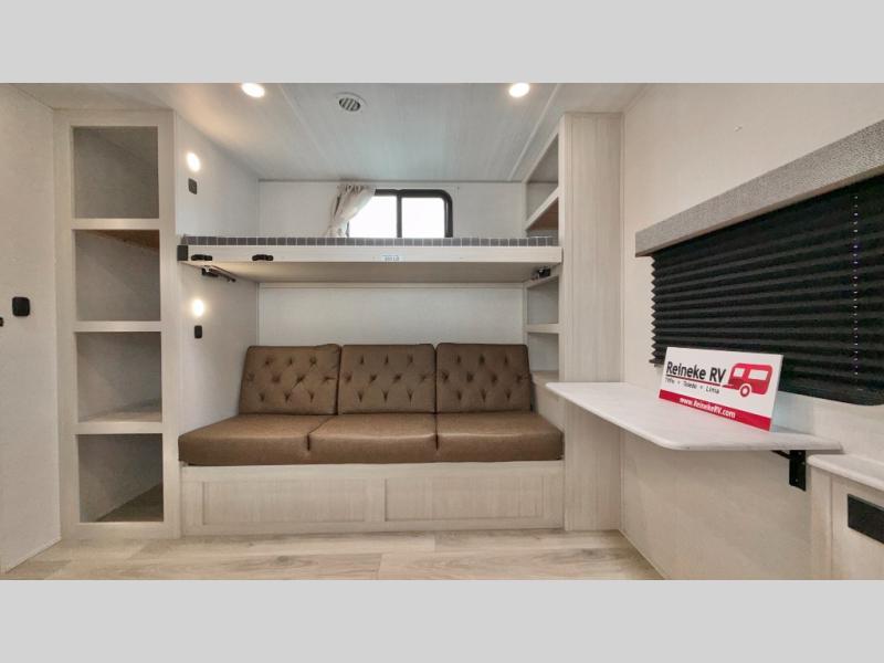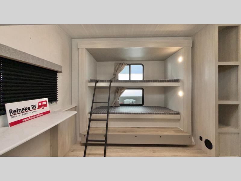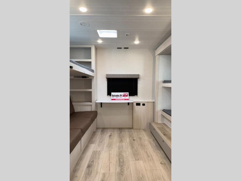 Head to your favorite camping spot with your favorite people in this spacious, dual entry travel trailer! The large slide out houses the booth dinette and sofa where you can relax in the evenings and even let guests sleep over who haven't claimed the triple bunks in the rear bunkhouse. There is also a bunkhouse sofa, two wardrobes, cubbies, and a flip-up desk if you need a space to work. A walk-thru bath is convenient for all, and the full kitchen lets you whip up your best meals in the microwave with an air fryer. There is also a walk-in pantry with washer and dryer prep if you choose to add those appliances. When it's time to call it a night, the front master bedroom with a queen bed will provide you with your own space to retreat to, and there are dual bedside wardrobes to keep your clothes organized.