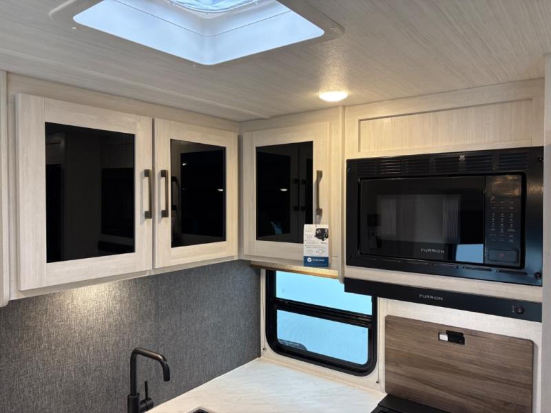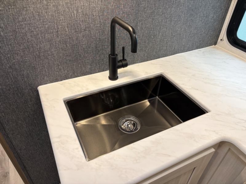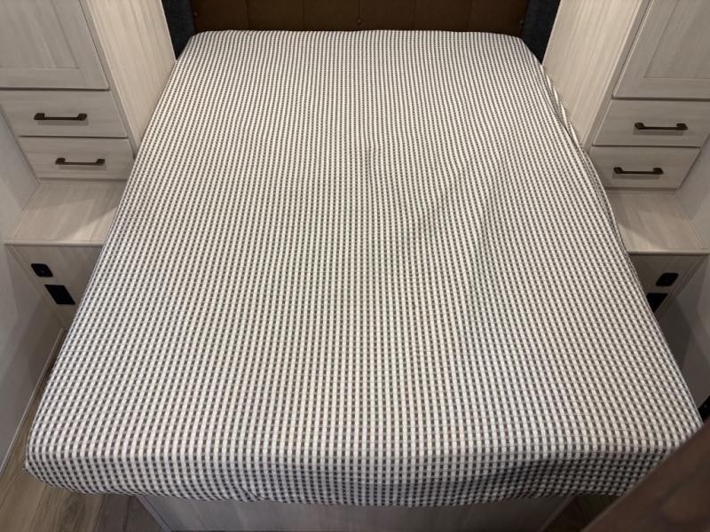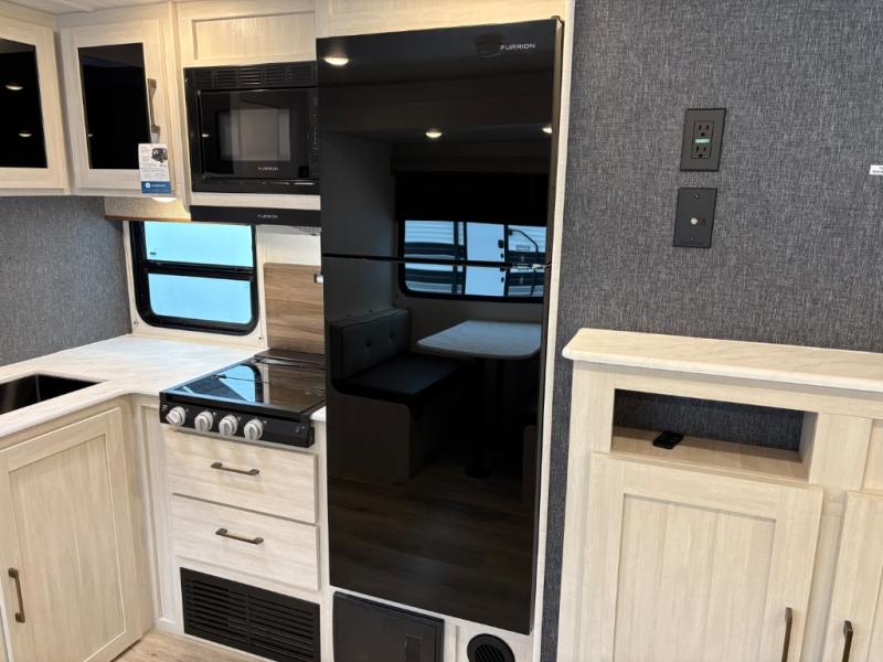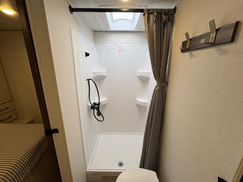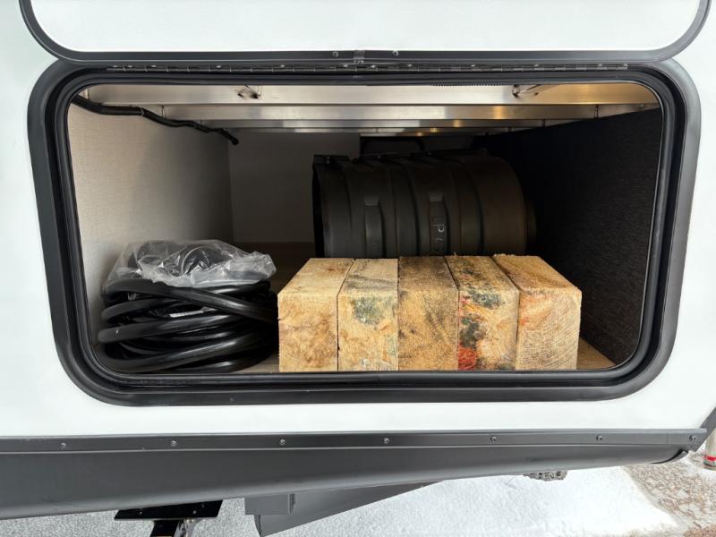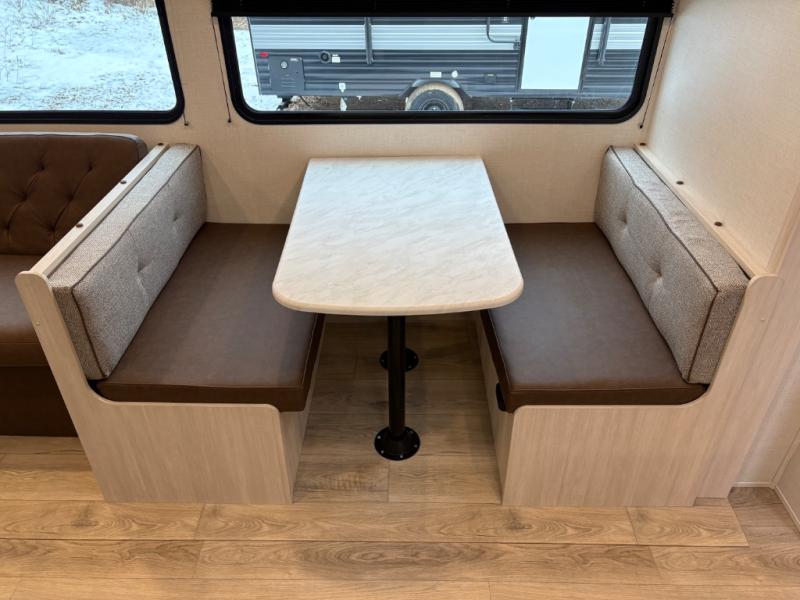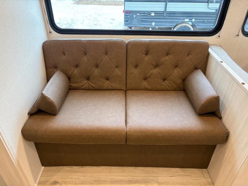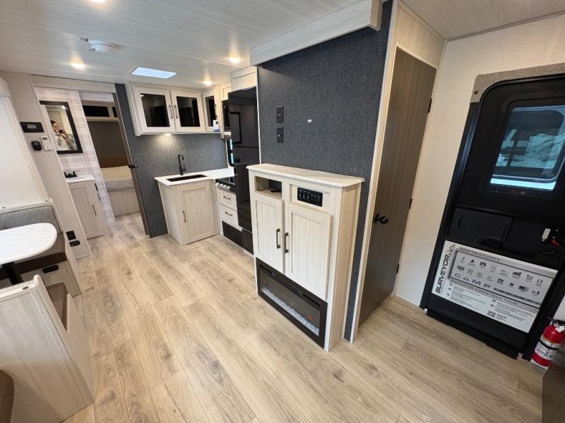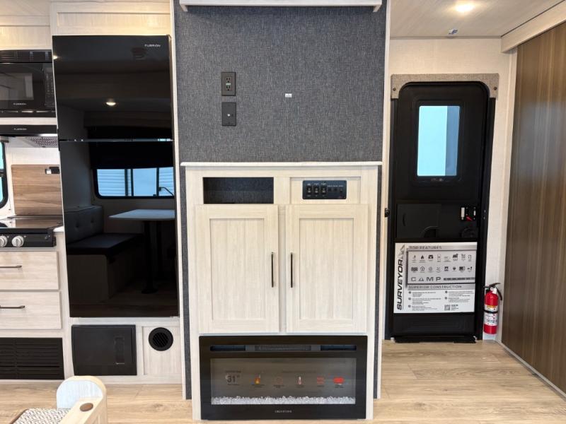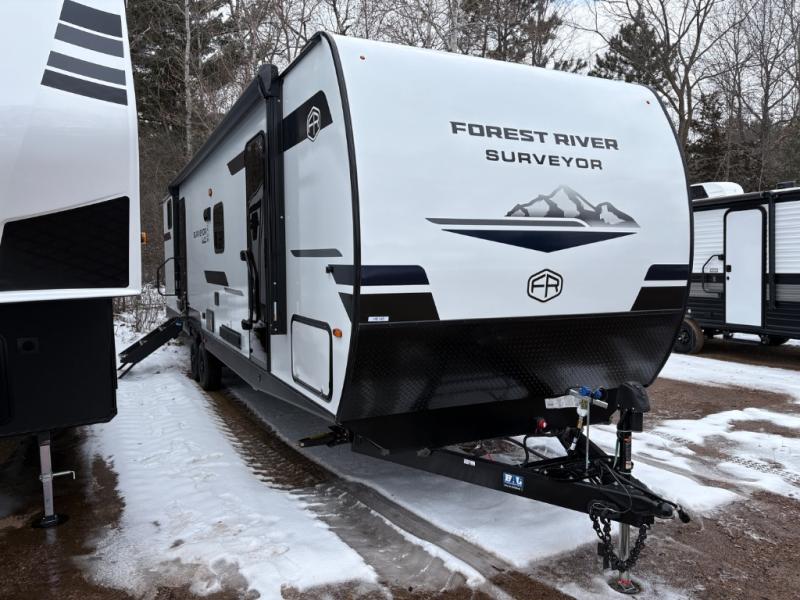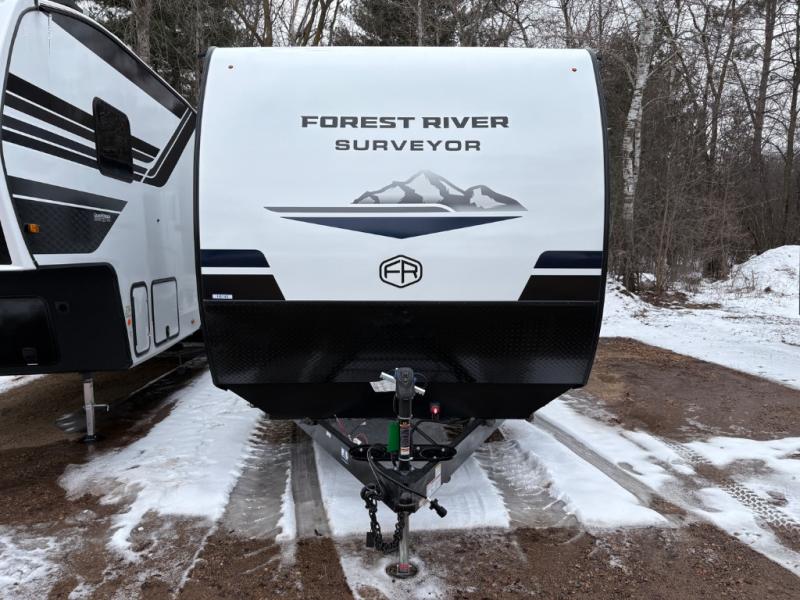 Value and versatility go hand-in-hand with the Surveyor Camp Series travel trailers by Forest River. The solid construction includes a 2" aluminum framed floor with block foam insulation and a sealed underbelly with forced heat and radiant foil insulation. A 100-watt roof mounted solar panel will provide some off-grid power, and the power tongue jack will let you easily hitch up and go whenever you're ready. Additional stand-out features include Surf(X) seamless countertops throughout, two A/C units, an electric awning with LED light strip, black glass friction hinge entry door(s), and so much more!