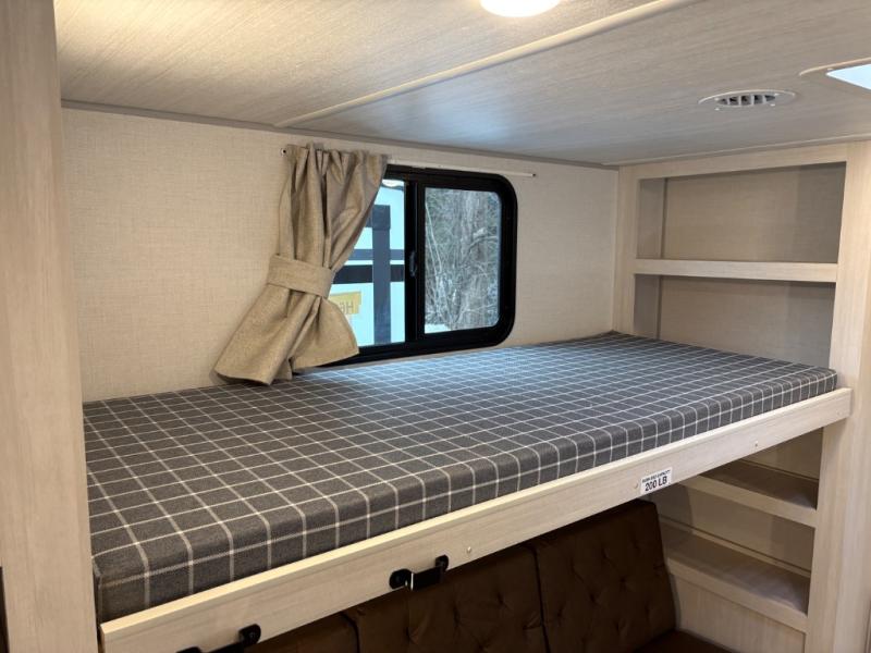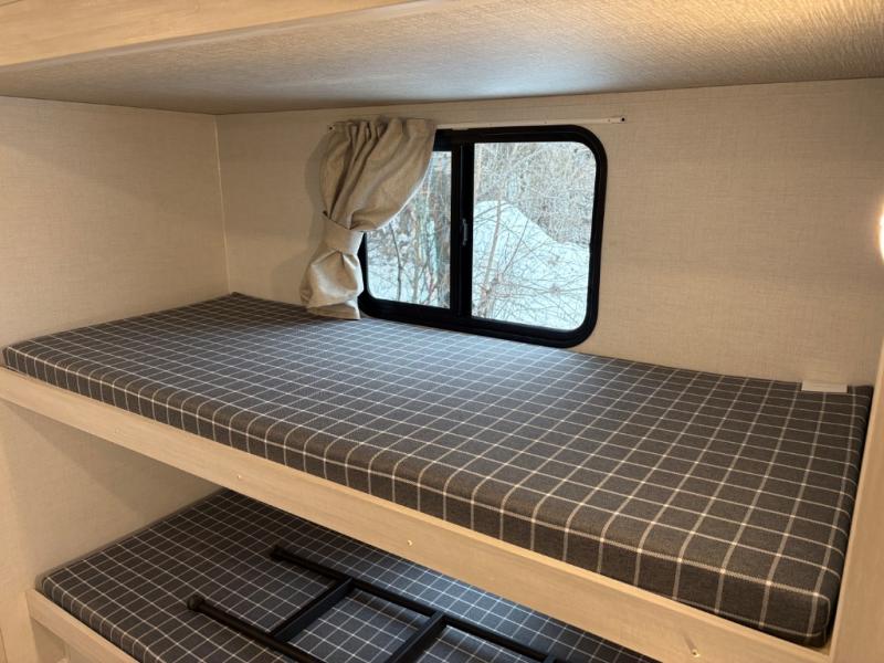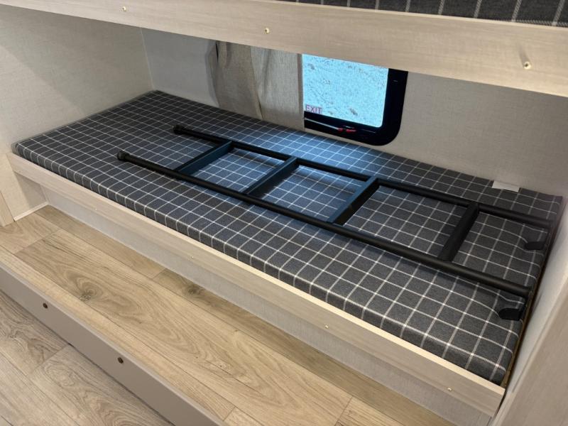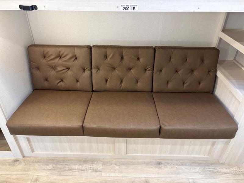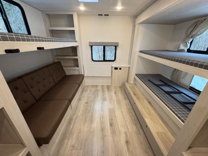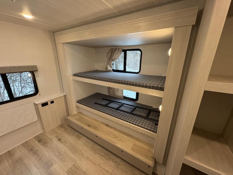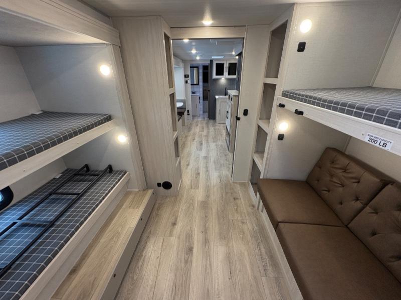 Head to your favorite camping spot with your favorite people in this spacious, dual entry travel trailer! The large slide out houses the booth dinette and sofa where you can relax in the evenings and even let guests sleep over who haven't claimed the triple bunks in the rear bunkhouse. There is also a bunkhouse sofa, two wardrobes, cubbies, and a flip-up desk if you need a space to work. A walk-thru bath is convenient for all, and the full kitchen lets you whip up your best meals in the microwave with an air fryer. There is also a walk-in pantry with washer and dryer prep if you choose to add those appliances. When it's time to call it a night, the front master bedroom with a queen bed will provide you with your own space to retreat to, and there are dual bedside wardrobes to keep your clothes organized.