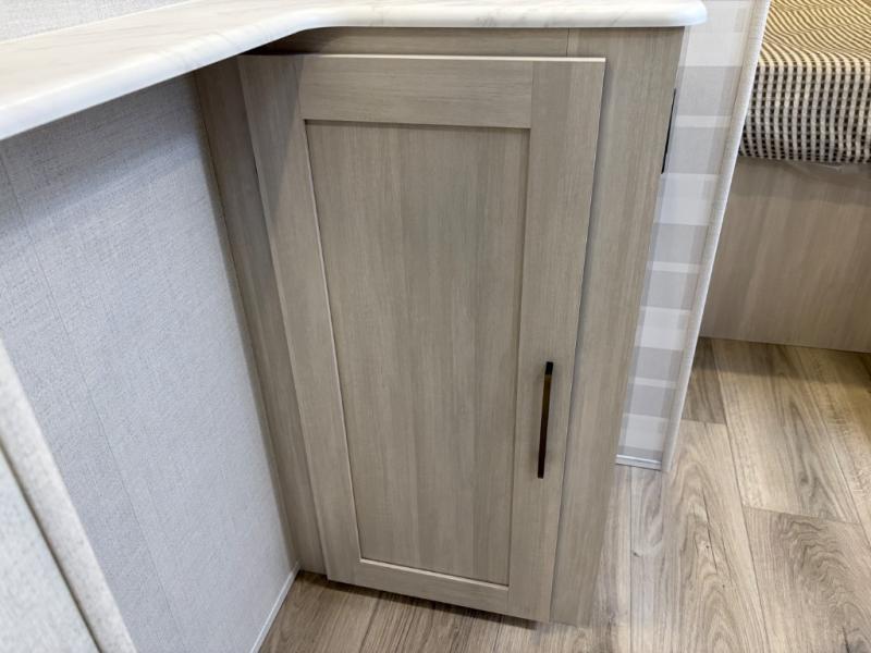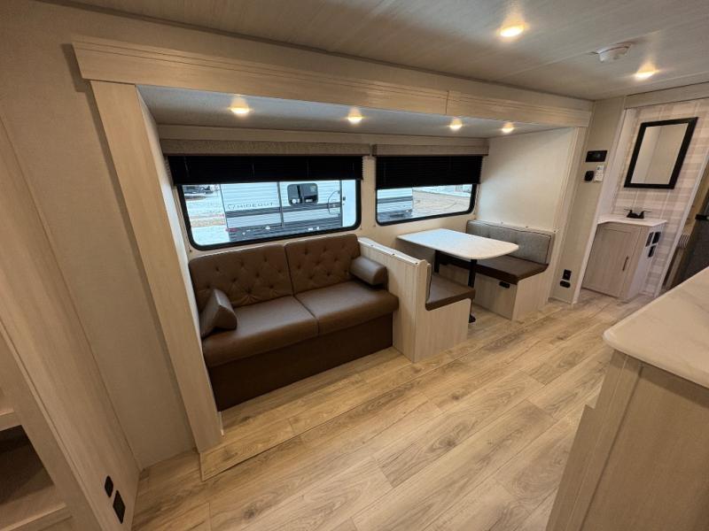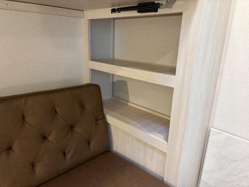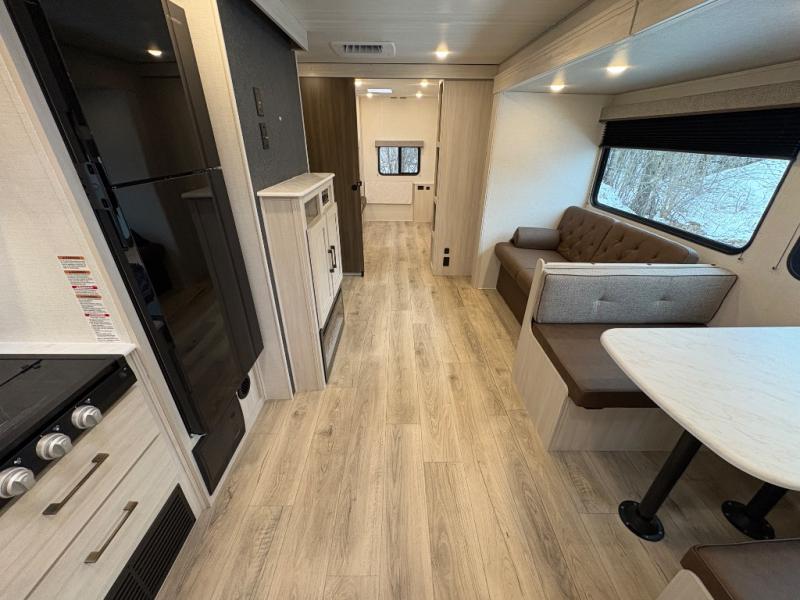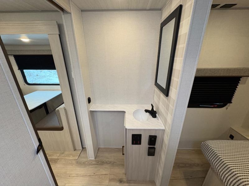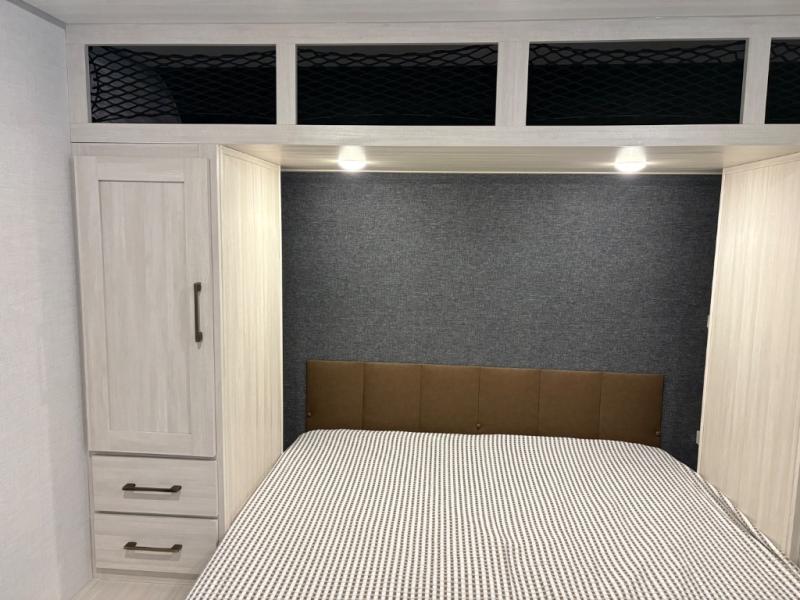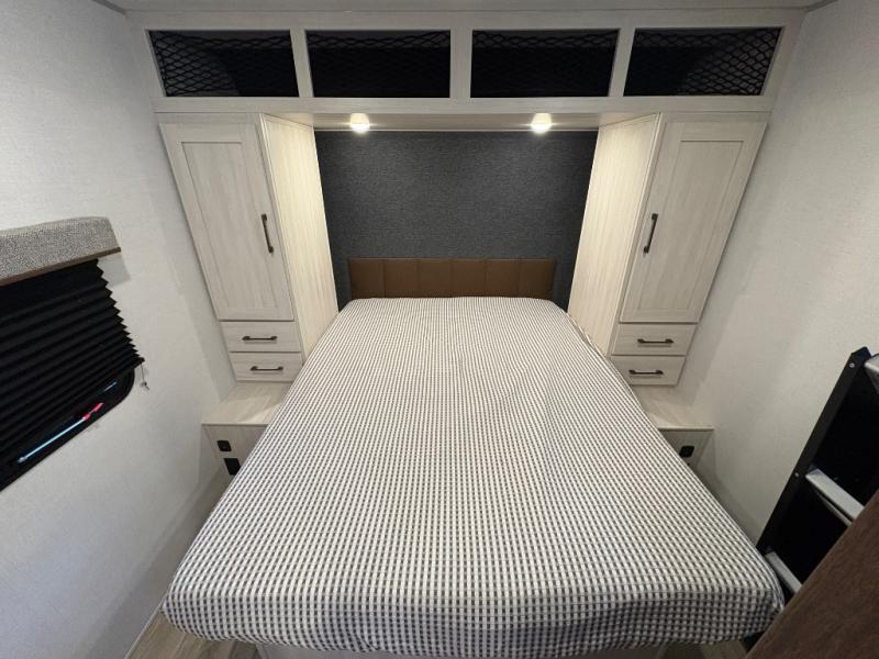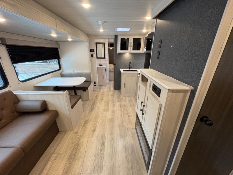 Head to your favorite camping spot with your favorite people in this spacious, dual entry travel trailer! The large slide out houses the booth dinette and sofa where you can relax in the evenings and even let guests sleep over who haven't claimed the triple bunks in the rear bunkhouse. There is also a bunkhouse sofa, two wardrobes, cubbies, and a flip-up desk if you need a space to work. A walk-thru bath is convenient for all, and the full kitchen lets you whip up your best meals in the microwave with an air fryer. There is also a walk-in pantry with washer and dryer prep if you choose to add those appliances. When it's time to call it a night, the front master bedroom with a queen bed will provide you with your own space to retreat to, and there are dual bedside wardrobes to keep your clothes organized.