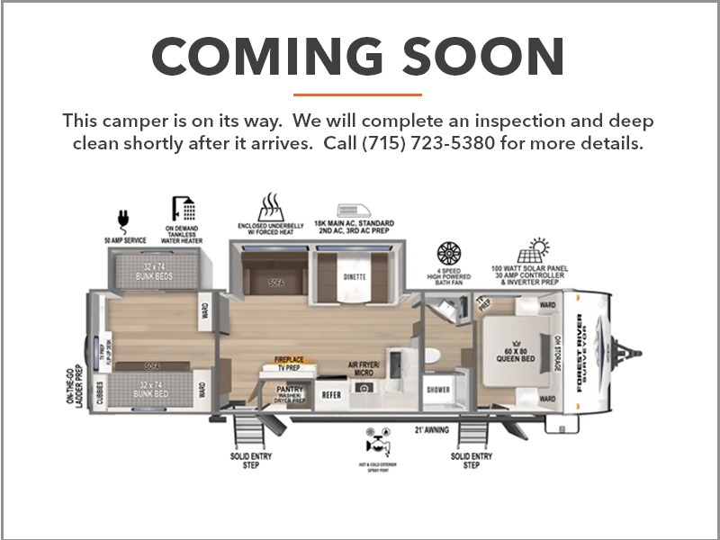 Value and versatility go hand-in-hand with the Surveyor Camp Series travel trailers by Forest River. The solid construction includes a 2" aluminum framed floor with block foam insulation and a sealed underbelly with forced heat and radiant foil insulation. A 100-watt roof mounted solar panel will provide some off-grid power, and the power tongue jack will let you easily hitch up and go whenever you're ready. Additional stand-out features include Surf(X) seamless countertops throughout, two A/C units, an electric awning with LED light strip, black glass friction hinge entry door(s), and so much more!