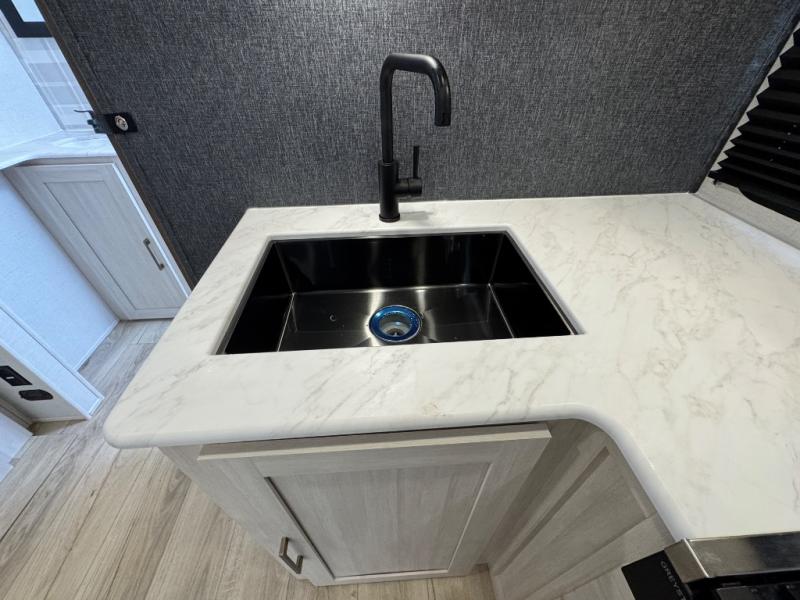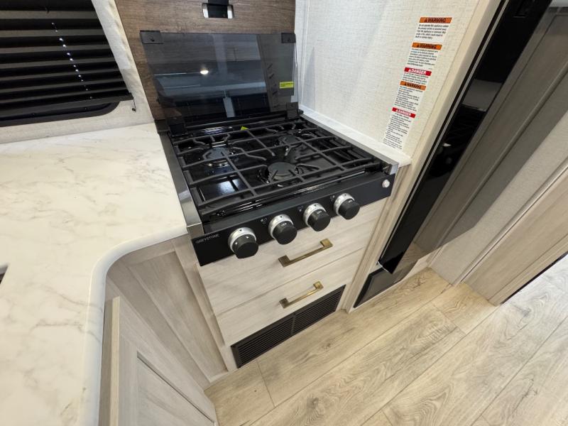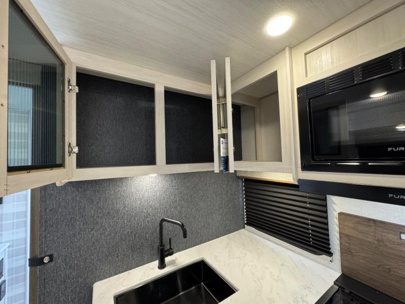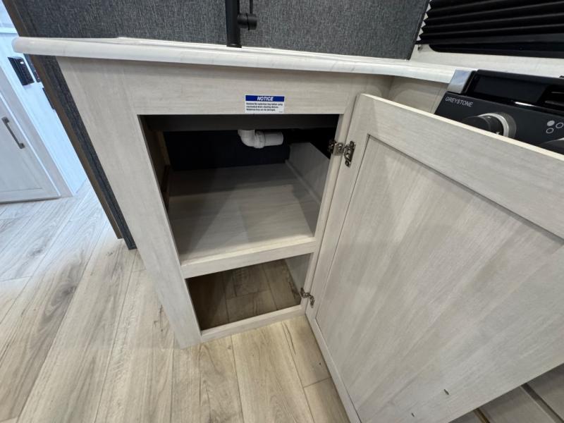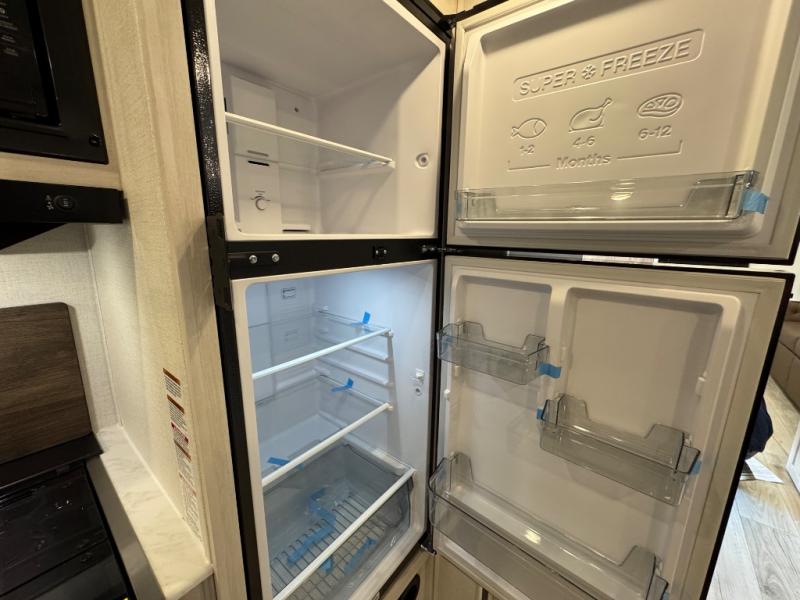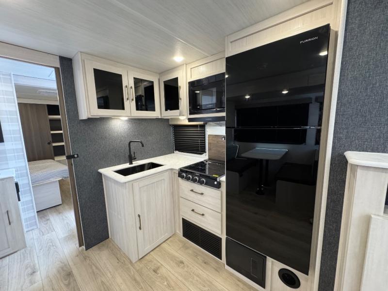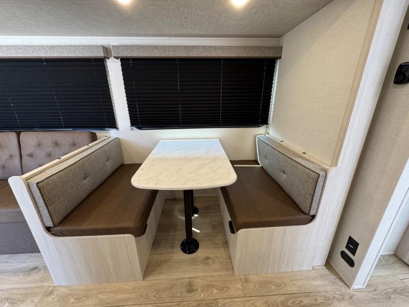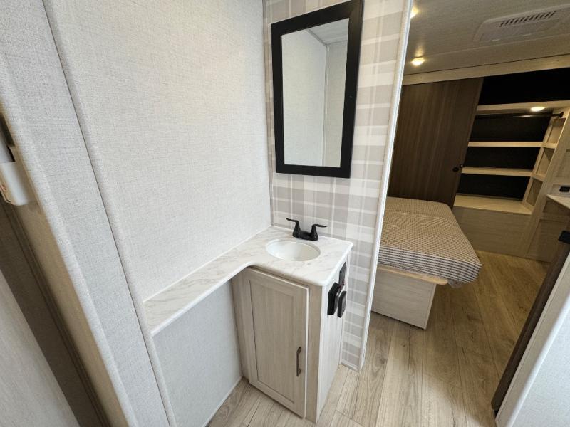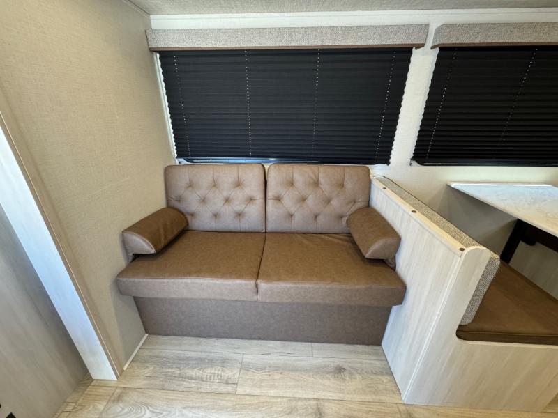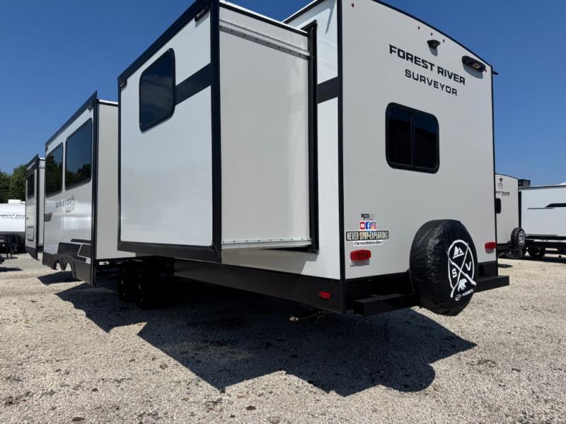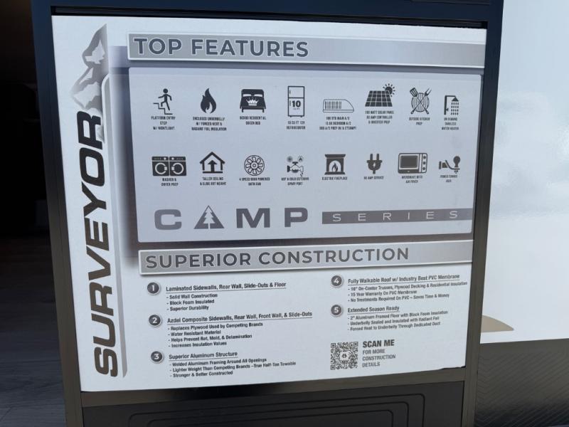 Value and versatility go hand-in-hand with the Surveyor Camp Series travel trailers by Forest River. The solid construction includes a 2" aluminum framed floor with block foam insulation and a sealed underbelly with forced heat and radiant foil insulation. A 100-watt roof mounted solar panel will provide some off-grid power, and the power tongue jack will let you easily hitch up and go whenever you're ready. Additional stand-out features include Surf(X) seamless countertops throughout, two A/C units, an electric awning with LED light strip, black glass friction hinge entry door(s), and so much more!