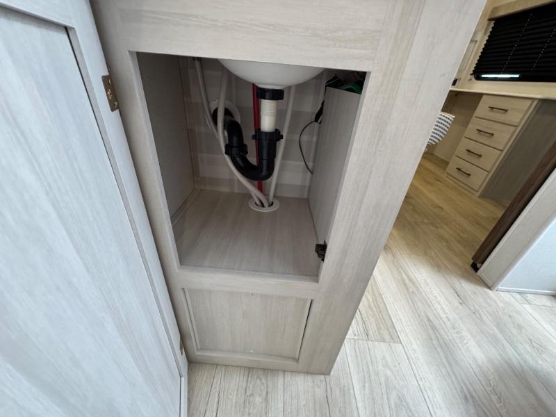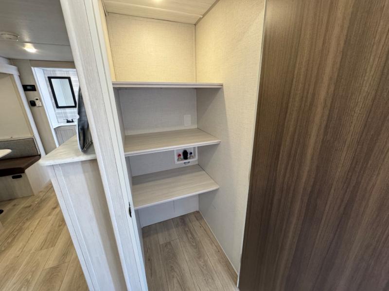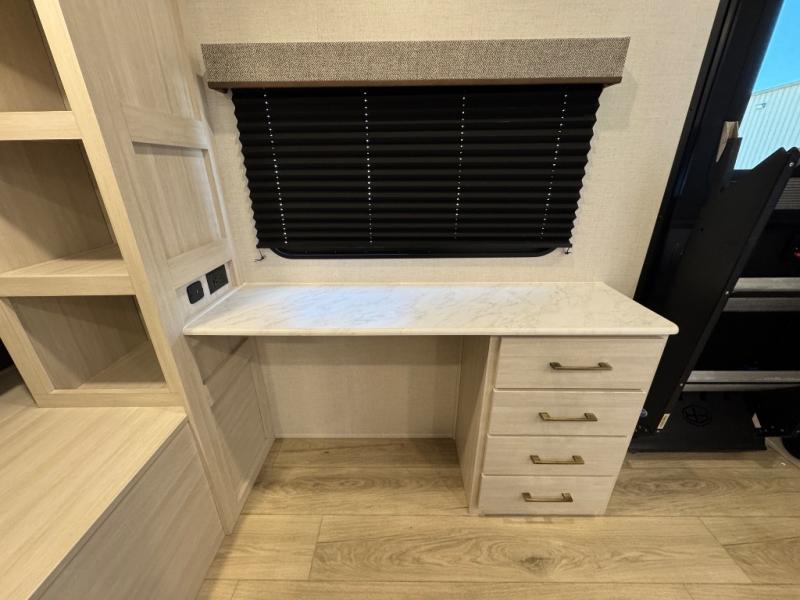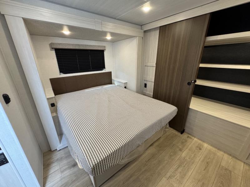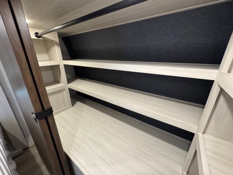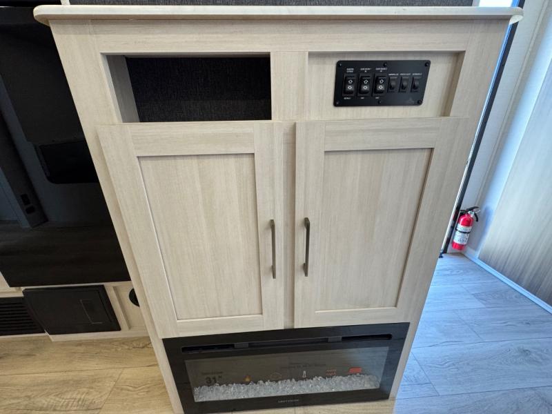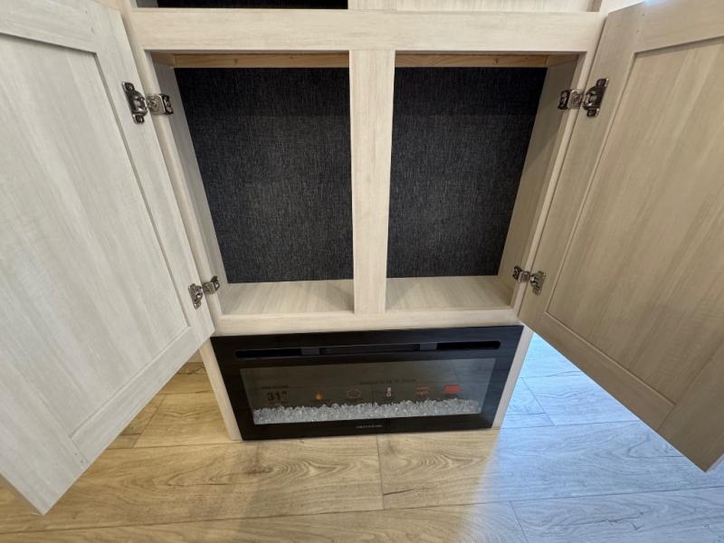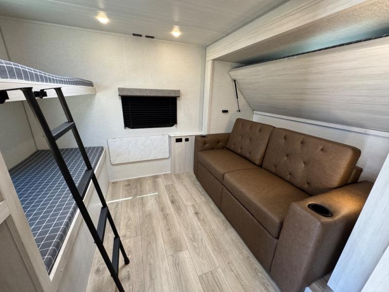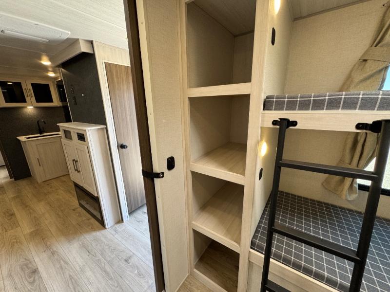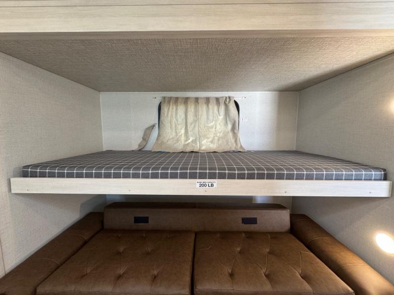 Experience the ultimate in family-friendly RV living with our spacious travel trailer. The rear bunk beds area is a kid's paradise, featuring three cozy bunk beds, while the tri-fold sofa provides additional sleeping space or a comfortable spot to relax. A convenient wardrobe and flip-up desk provide ample storage and a workspace. Moreover, the kitchen and living room are designed for comfort and functionality, with a sofa, dinette, and entertainment center with a fireplace perfect for family movie nights, the pantry keeps snacks and ingredients organized, and the refrigerator and microwave with an air fryer make meal prep easy and delicious. Additionally, the walk-through bathroom provides easy access, and the front bedroom is a serene retreat featuring a spacious queen-size bed, dresser/desk, and ample wardrobe space. On the exterior, two entry and exit doors provide convenient access, and the 19' awning offers shade and protection, perfect for creating lifelong memories.