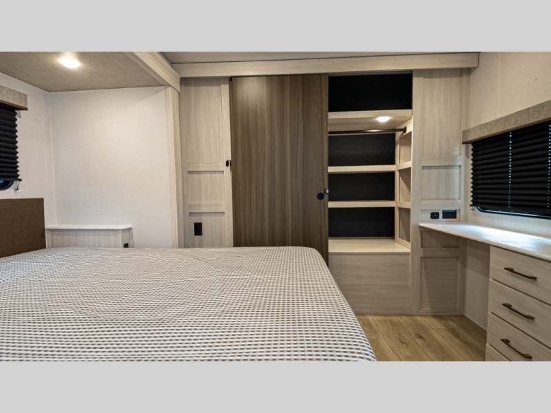 This model features three slides, bunk room flexibility, and the Legend-X Value Package—delivering cozy insulation, solar and power prep, and deluxe comfort without stepping into fifth-wheel tow class.