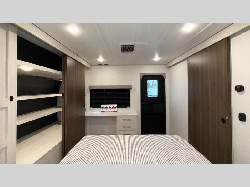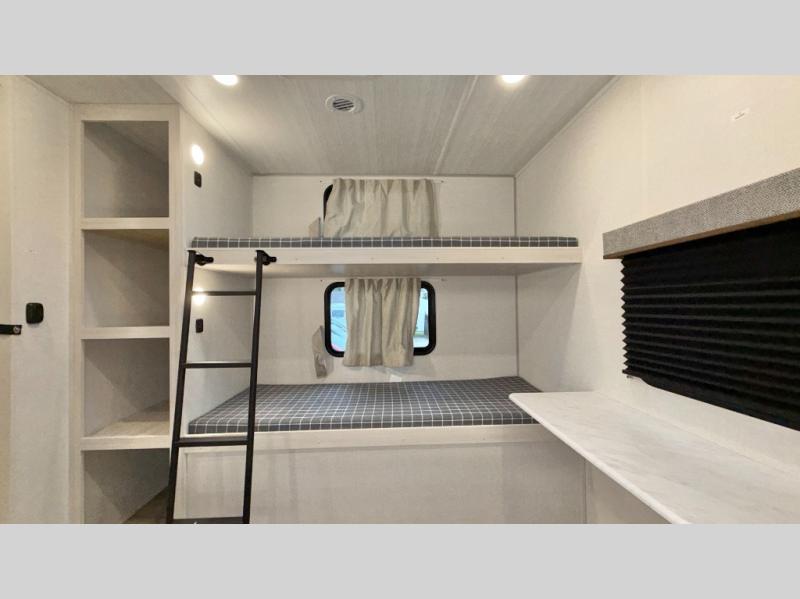 Experience the ultimate in family-friendly RV living with our spacious travel trailer. The rear bunk beds area is a kid's paradise, featuring three cozy bunk beds, while the tri-fold sofa provides additional sleeping space or a comfortable spot to relax. A convenient wardrobe and flip-up desk provide ample storage and a workspace. Moreover, the kitchen and living room are designed for comfort and functionality, with a sofa, dinette, and entertainment center with a fireplace perfect for family movie nights, the pantry keeps snacks and ingredients organized, and the refrigerator and microwave with an air fryer make meal prep easy and delicious. Additionally, the walk-through bathroom provides easy access, and the front bedroom is a serene retreat featuring a spacious queen-size bed, dresser/desk, and ample wardrobe space. On the exterior, two entry and exit doors provide convenient access, and the 19' awning offers shade and protection, perfect for creating lifelong memories.