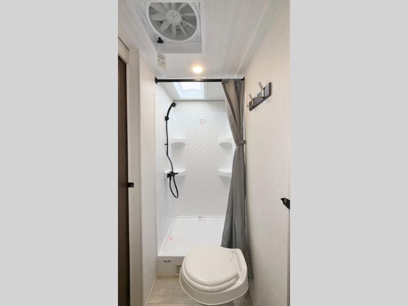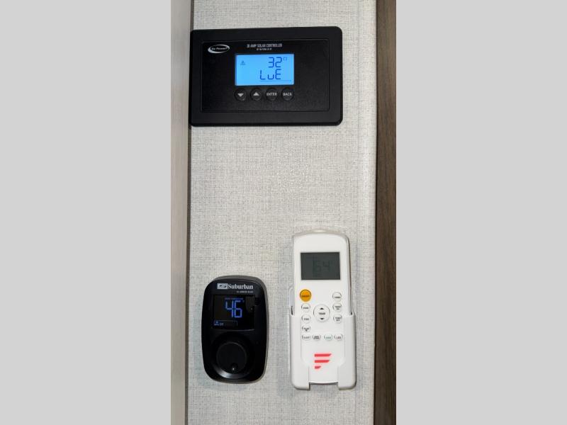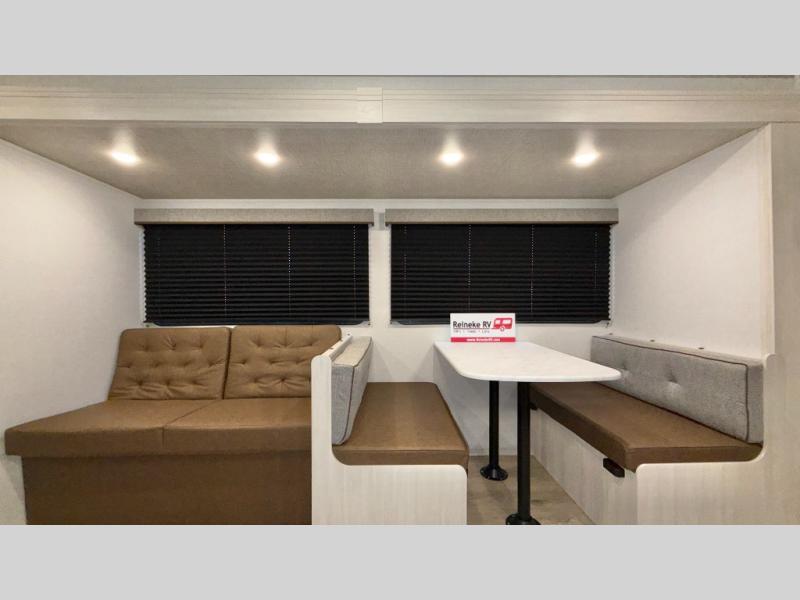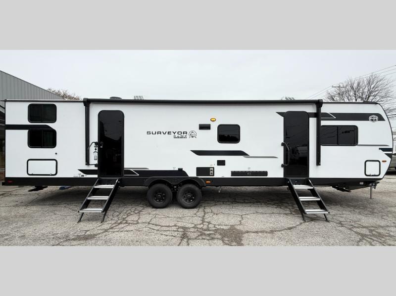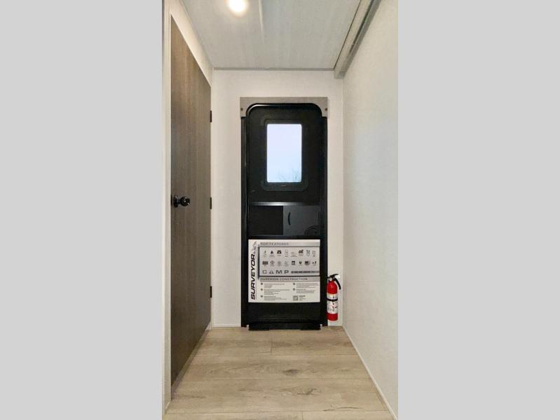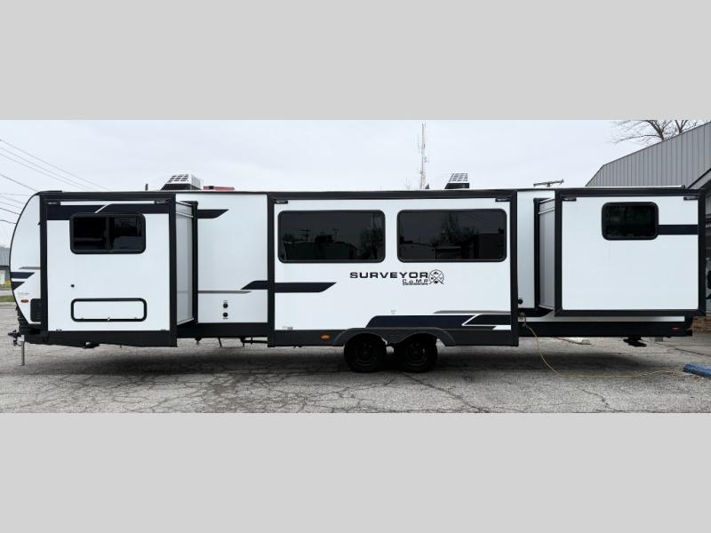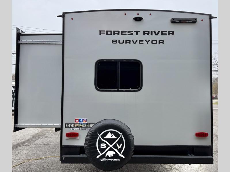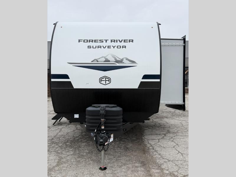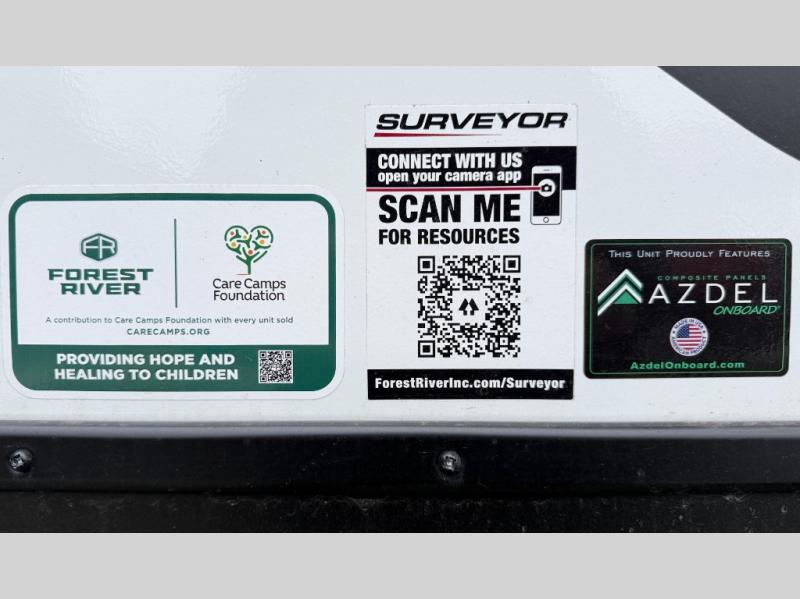 Value and versatility go hand-in-hand with the Surveyor Camp Series travel trailers by Forest River. The solid construction includes a 2" aluminum framed floor with block foam insulation and a sealed underbelly with forced heat and radiant foil insulation. A 100-watt roof mounted solar panel will provide some off-grid power, and the power tongue jack will let you easily hitch up and go whenever you're ready. Additional stand-out features include Surf(X) seamless countertops throughout, two A/C units, an electric awning with LED light strip, black glass friction hinge entry door(s), and so much more!