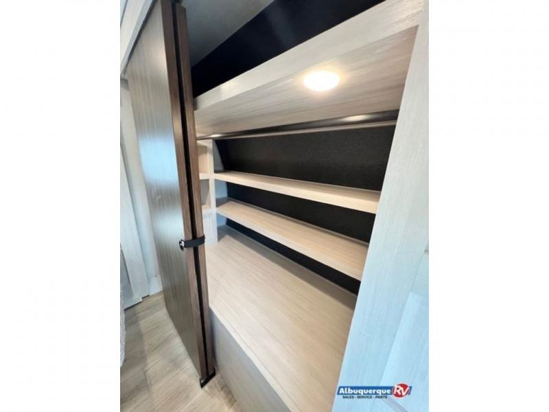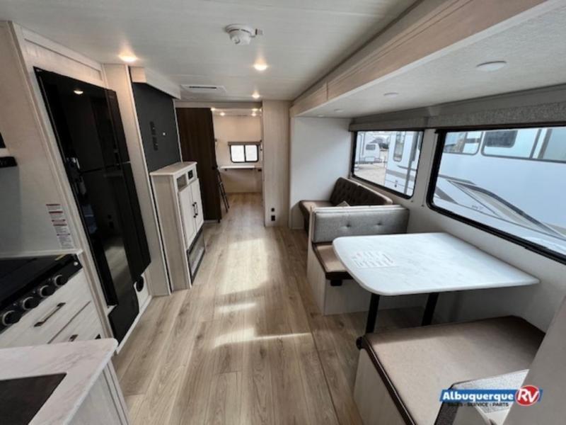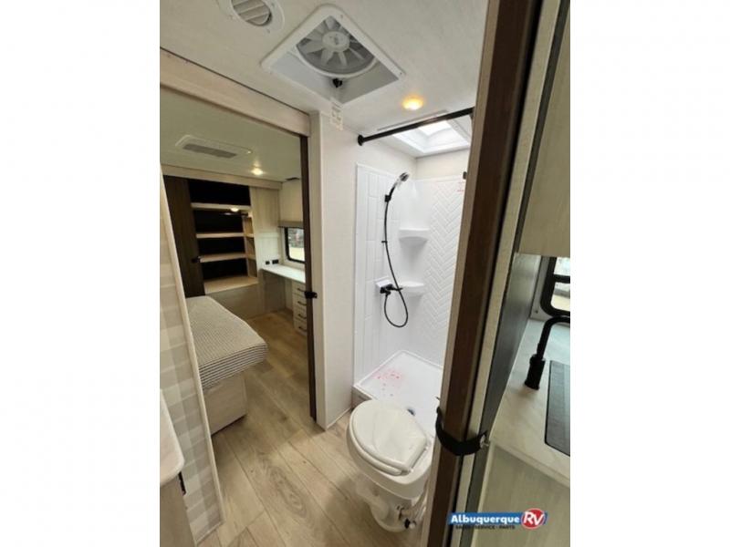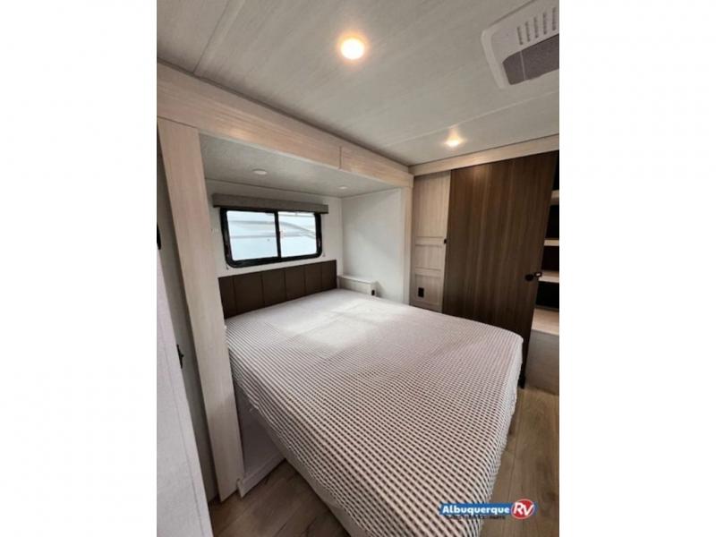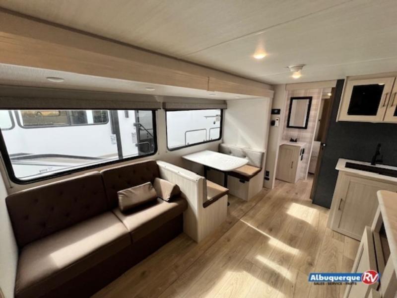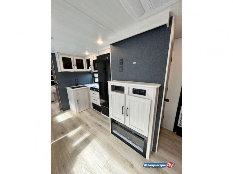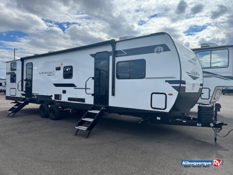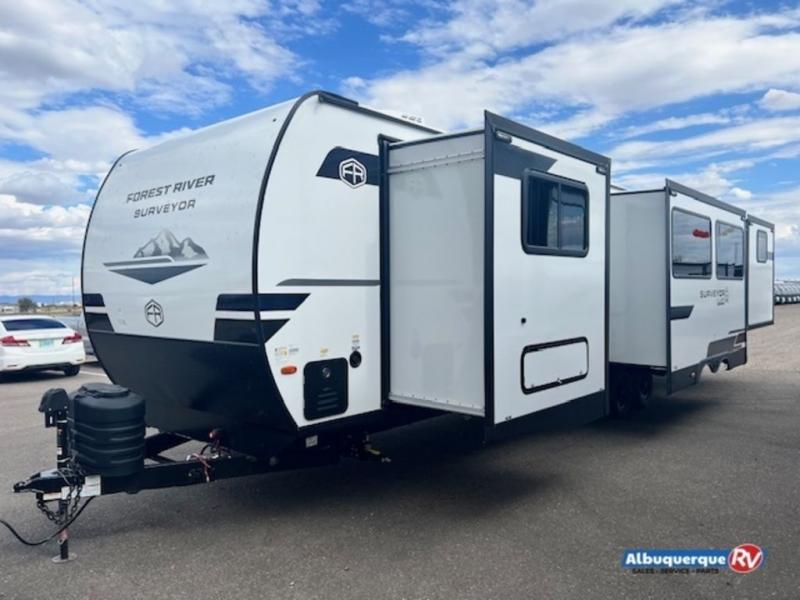 Value and versatility go hand-in-hand with the Surveyor Camp Series travel trailers by Forest River. The solid construction includes a 2" aluminum framed floor with block foam insulation and a sealed underbelly with forced heat and radiant foil insulation. A 100-watt roof mounted solar panel will provide some off-grid power, and the power tongue jack will let you easily hitch up and go whenever you're ready. Additional stand-out features include Surf(X) seamless countertops throughout, two A/C units, an electric awning with LED light strip, black glass friction hinge entry door(s), and so much more!
