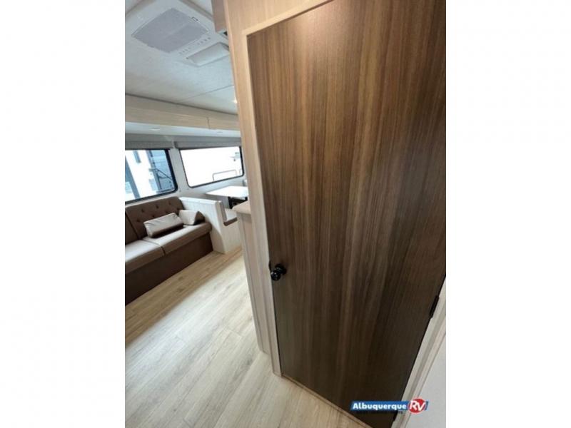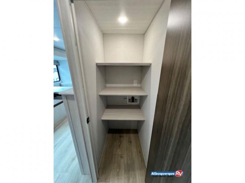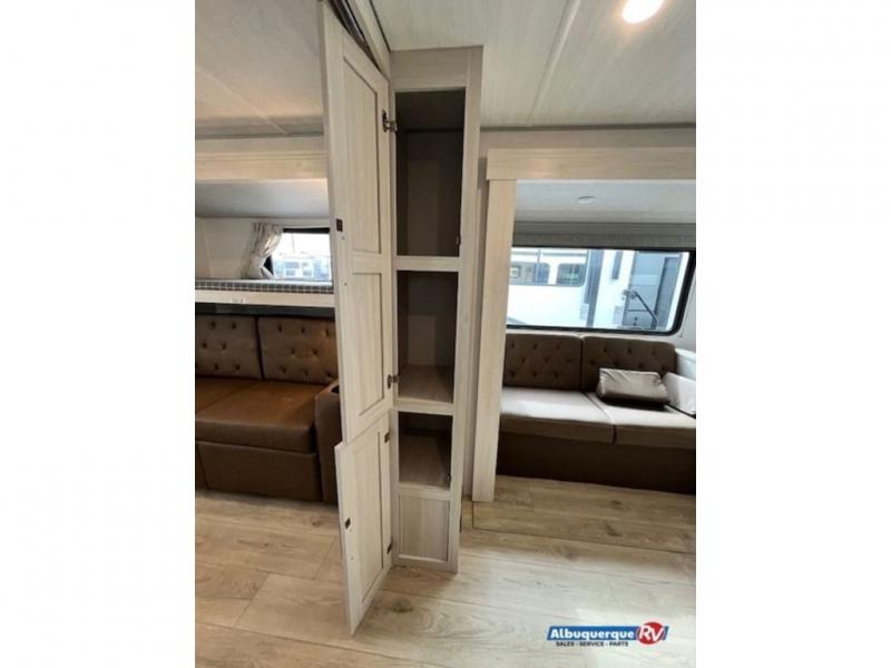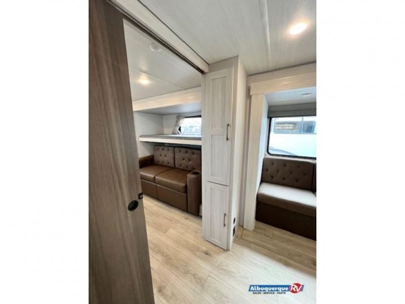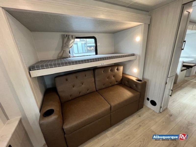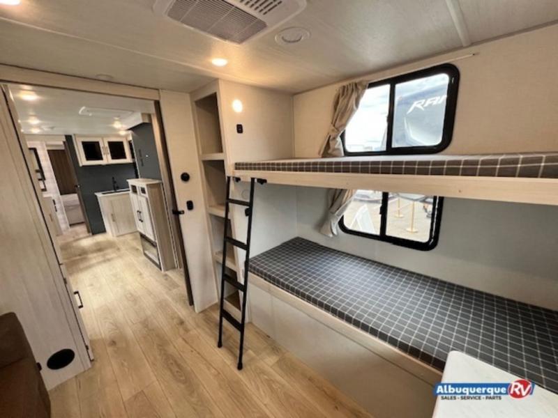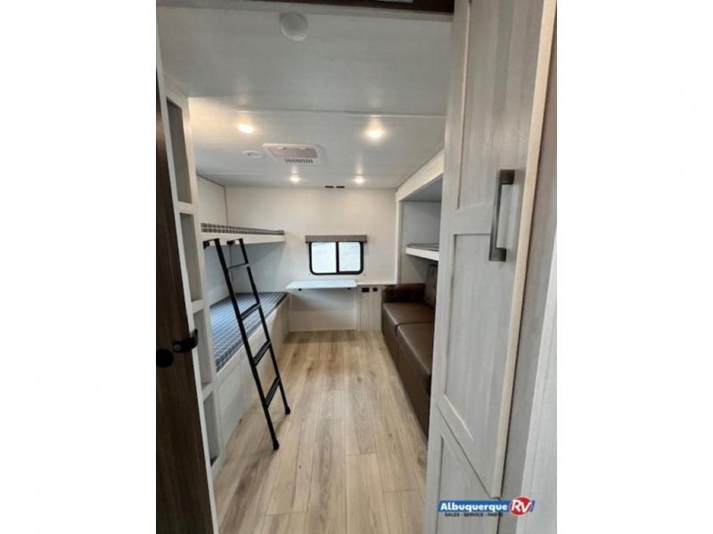 Experience the ultimate in family-friendly RV living with our spacious travel trailer. The rear bunk beds area is a kid's paradise, featuring three cozy bunk beds, while the tri-fold sofa provides additional sleeping space or a comfortable spot to relax. A convenient wardrobe and flip-up desk provide ample storage and a workspace. Moreover, the kitchen and living room are designed for comfort and functionality, with a sofa, dinette, and entertainment center with a fireplace perfect for family movie nights, the pantry keeps snacks and ingredients organized, and the refrigerator and microwave with an air fryer make meal prep easy and delicious. Additionally, the walk-through bathroom provides easy access, and the front bedroom is a serene retreat featuring a spacious queen-size bed, dresser/desk, and ample wardrobe space. On the exterior, two entry and exit doors provide convenient access, and the 19' awning offers shade and protection, perfect for creating lifelong memories.