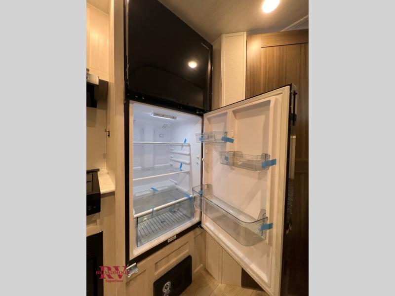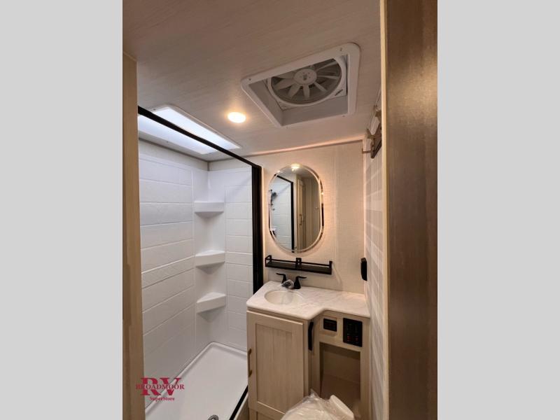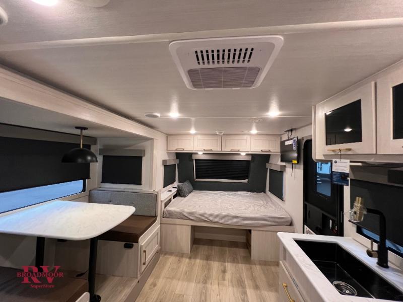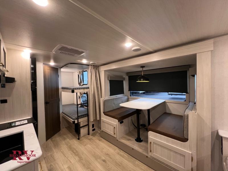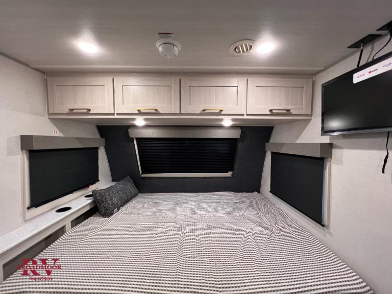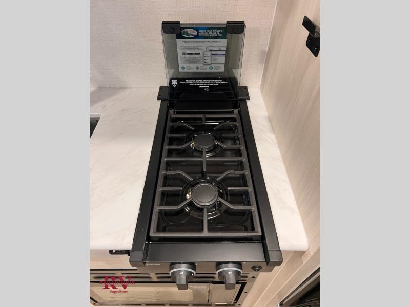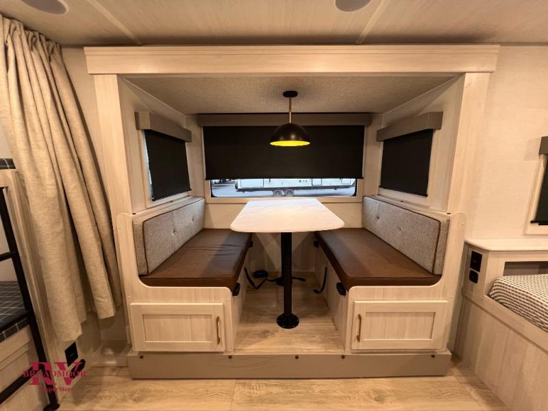 Bring along family or friends in this travel trailer that can sleep up to six people each night. The dinette slide will provide the chef space to cook on the two burner cooktop, or they may just head outdoors to cook on the outside kitchen. There is also an outdoor shelf here and a spray port for your convenience. The true queen-size bed up front is sure to provide a great night's rest, plus there is a "Stargazer" front window that will allow natural light in and beautiful starry nights.