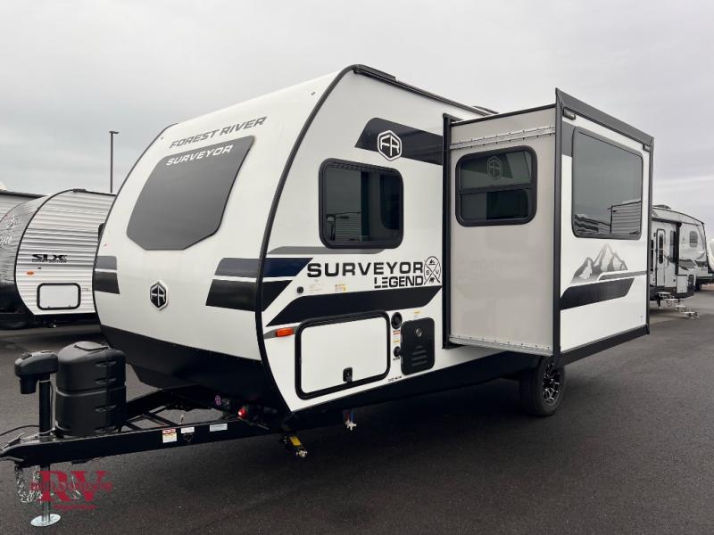 With any Surveyor Legend travel trailer by Forest River you will enjoy quality craftsmanship, convenient amenities, and at-home comforts. The Azdel composite walls provide a longer-lasting trailer, and the power tongue jack with a hitch light will get you back on the road in no-time. There are also Goodyear tires and a tire pressure monitoring system for hassle-free towing. Each model includes the Surveyor Legend Package that comes standard with oversized dinette storage access doors, front slam latch baggage doors, plus an automotive style tinted front windshield. You'll appreciate camping with a tankless water heater for endless hot showers, a 2" accessory hitch to bring bikes along, plus carpet-free interiors and a central vacuum system for easy clean up.