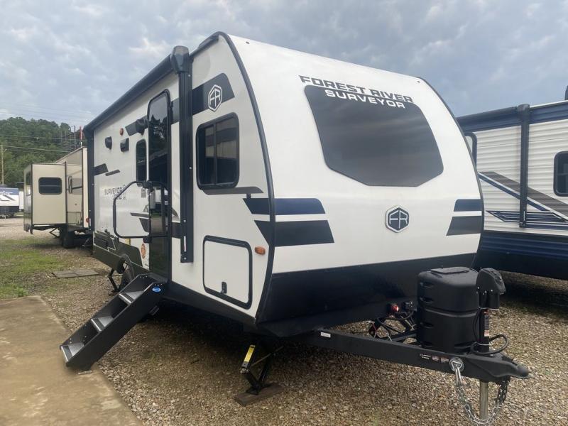 With any Surveyor Legend travel trailer by Forest River you will enjoy quality craftsmanship, convenient amenities, and at-home comforts. The Azdel composite walls provide a longer-lasting trailer, and the power tongue jack with a hitch light will get you back on the road in no-time. There are also Goodyear tires and a tire pressure monitoring system for hassle-free towing. Each model includes the Surveyor Legend Package that comes standard with oversized dinette storage access doors, front slam latch baggage doors, plus an automotive style tinted front windshield. You'll appreciate camping with a tankless water heater for endless hot showers, a 2" accessory hitch to bring bikes along, plus carpet-free interiors and a central vacuum system for easy clean up.