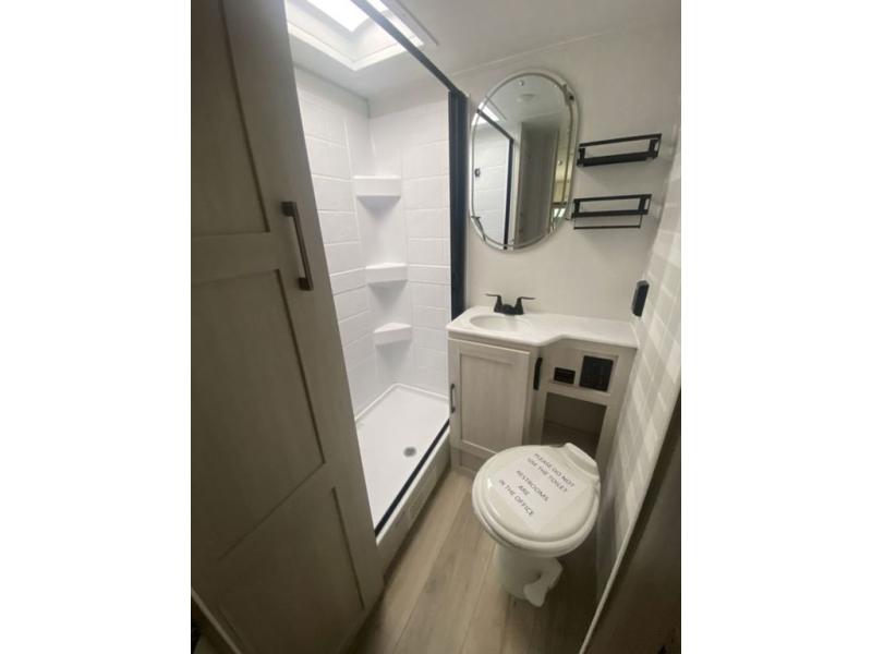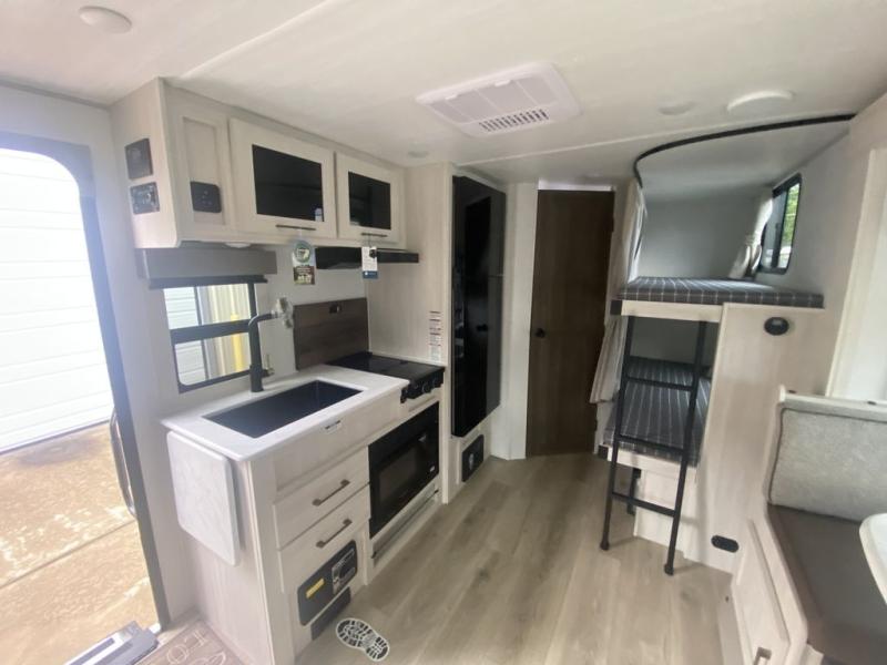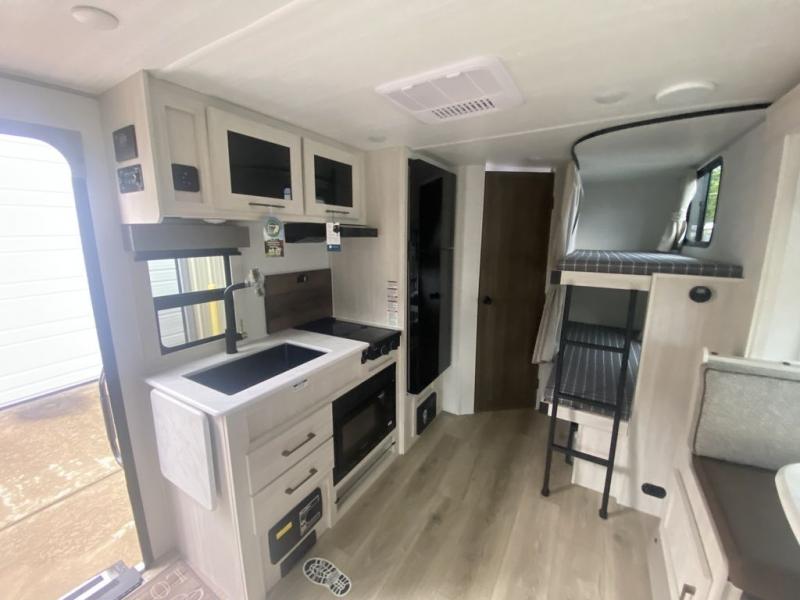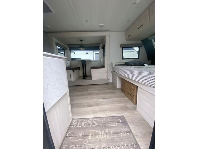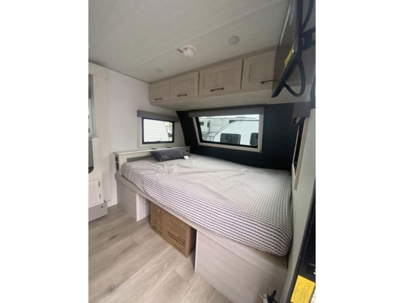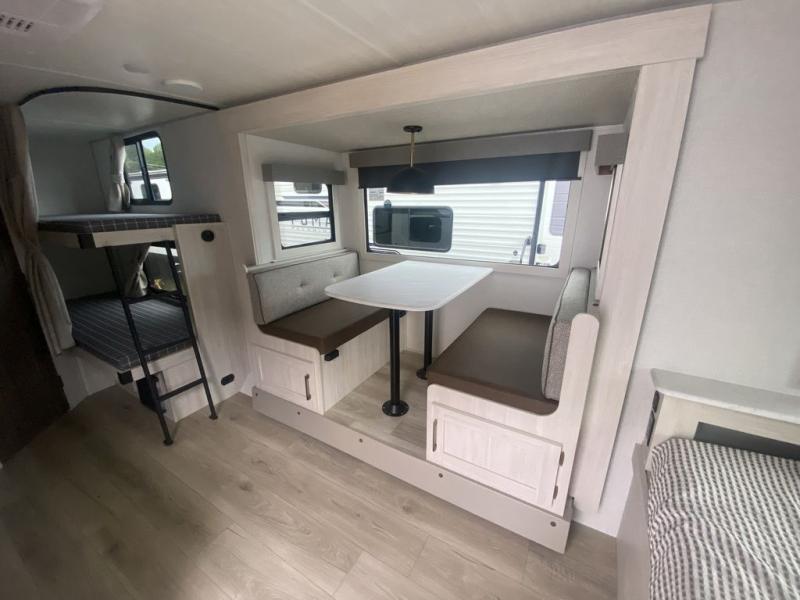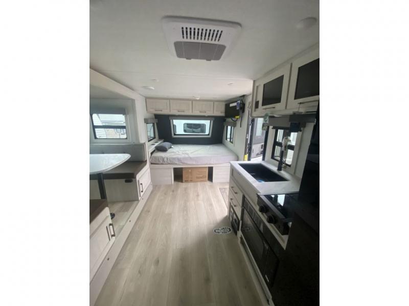 Bring along family or friends in this travel trailer that can sleep up to six people each night. The dinette slide will provide the chef space to cook on the two burner cooktop, or they may just head outdoors to cook on the outside kitchen. There is also an outdoor shelf here and a spray port for your convenience. The true queen-size bed up front is sure to provide a great night's rest, plus there is a "Stargazer" front window that will allow natural light in and beautiful starry nights.
