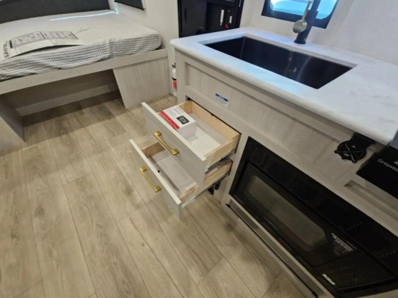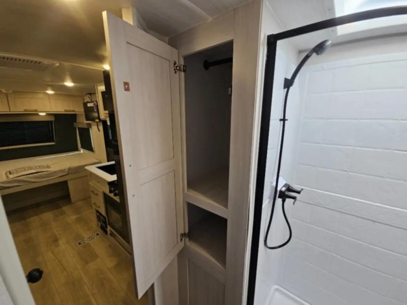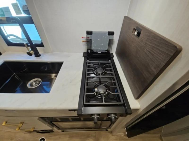 Bring along family or friends in this travel trailer that can sleep up to five people each night. The dinette slide will provide the chef space to cook on the two burner cooktop, or they may just head outdoors to cook on the outside kitchen. There is also an outdoor shelf here and a spray port for your convenience. The true queen-size bed up front is sure to provide a great night's rest, plus there is a "Stargazer" front window that will allow natural light in and beautiful starry nights.