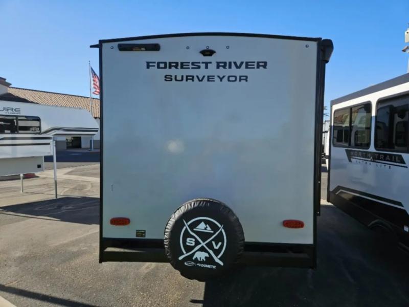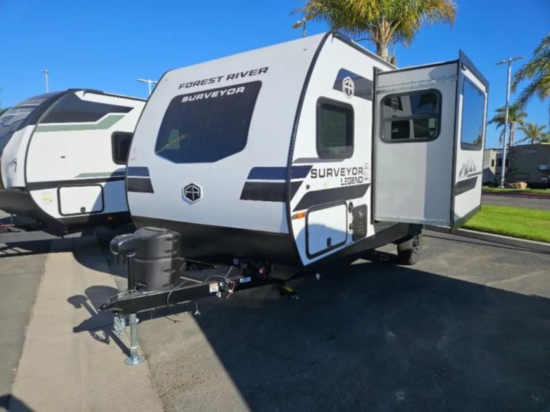 With any Surveyor Legend travel trailer by Forest River you will enjoy quality craftsmanship, convenient amenities, and at-home comforts. The Azdel composite walls provide a longer-lasting trailer, and the power tongue jack with a hitch light will get you back on the road in no-time. There are also Goodyear tires and a tire pressure monitoring system for hassle-free towing. Each model includes the Surveyor Legend Package that comes standard with oversized dinette storage access doors, front slam latch baggage doors, plus an automotive style tinted front windshield. You'll appreciate camping with a tankless water heater for endless hot showers, a 2" accessory hitch to bring bikes along, plus carpet-free interiors and a central vacuum system for easy clean up.