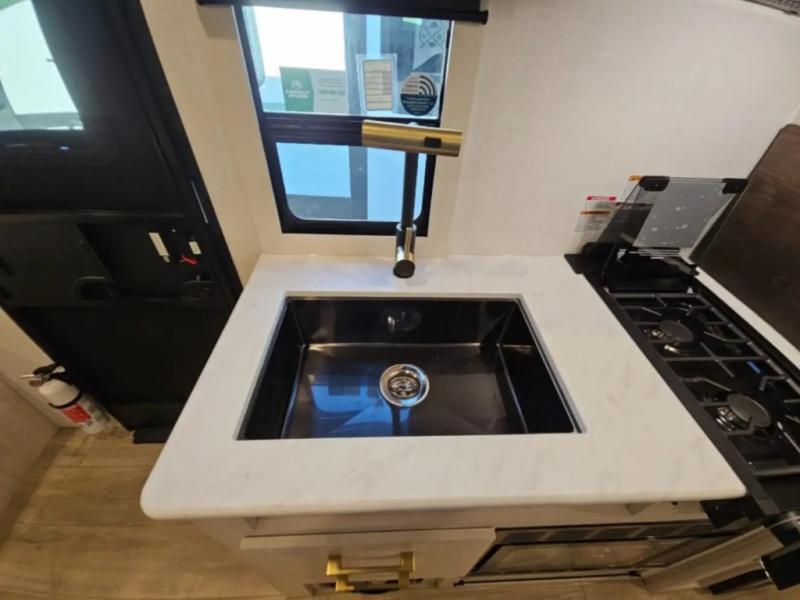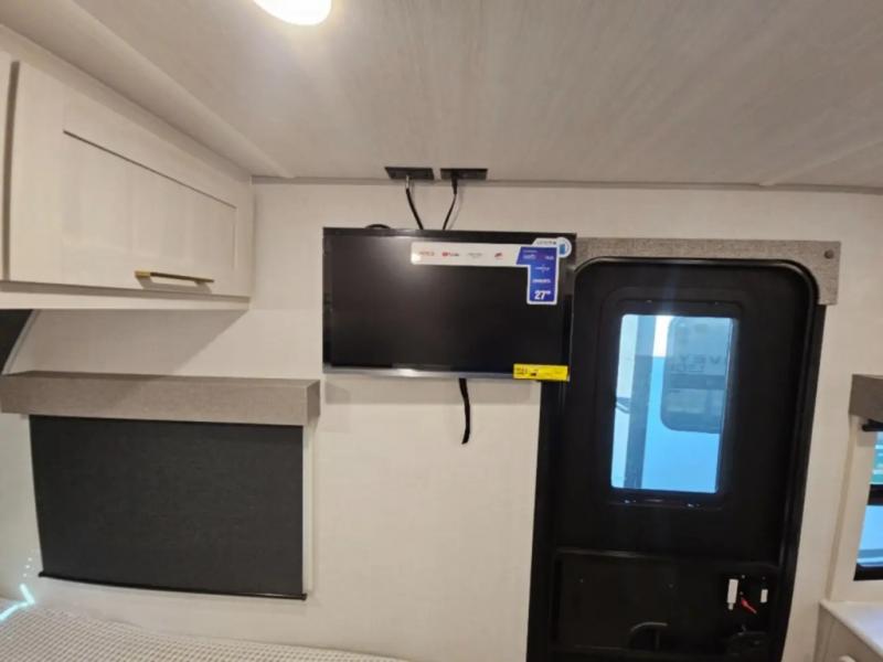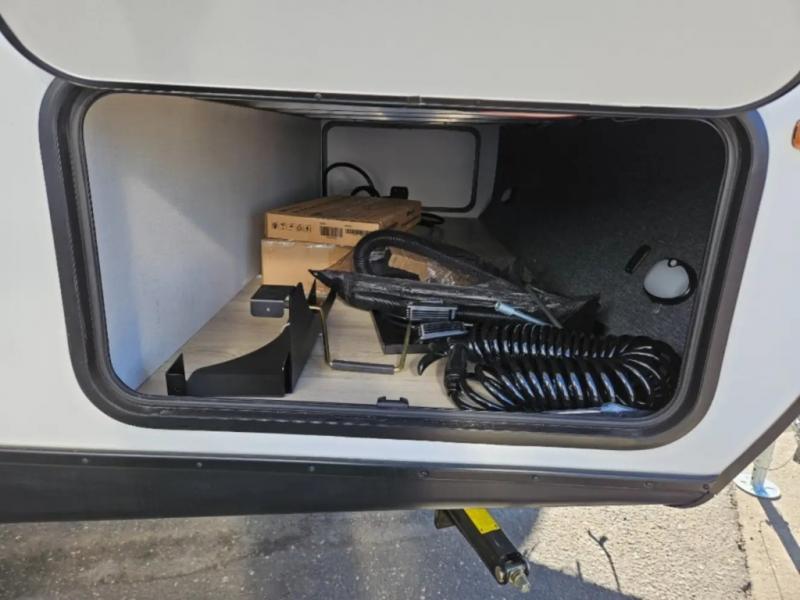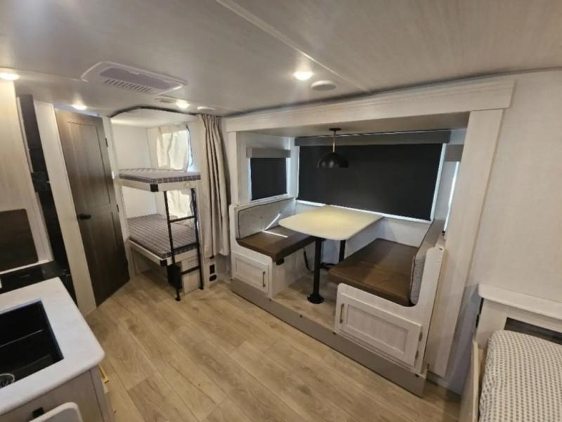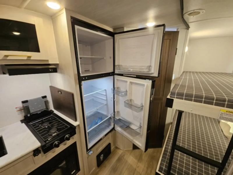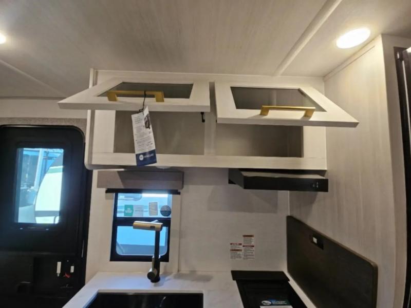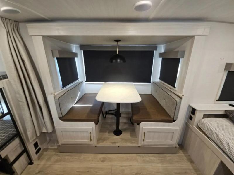 Bring along family or friends in this travel trailer that can sleep up to five people each night. The dinette slide will provide the chef space to cook on the two burner cooktop, or they may just head outdoors to cook on the outside kitchen. There is also an outdoor shelf here and a spray port for your convenience. The true queen-size bed up front is sure to provide a great night's rest, plus there is a "Stargazer" front window that will allow natural light in and beautiful starry nights.