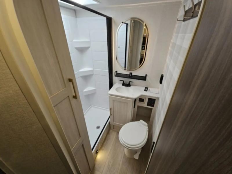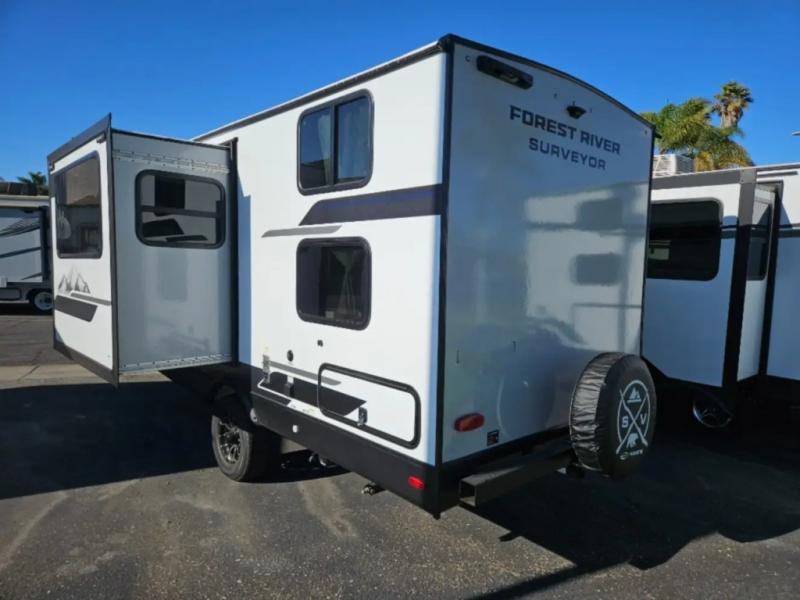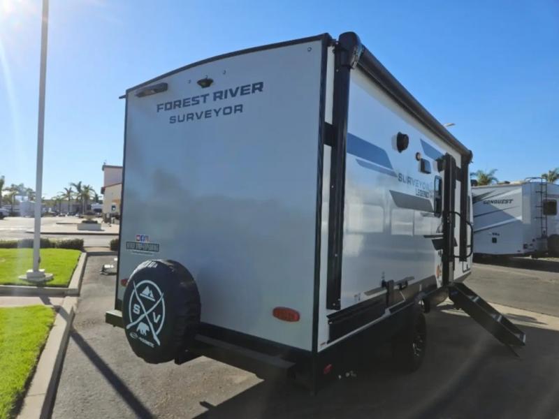 With any Surveyor Legend travel trailer by Forest River you will enjoy quality craftsmanship, convenient amenities, and at-home comforts. The Azdel composite walls provide a longer-lasting trailer, and the power tongue jack with a hitch light will get you back on the road in no-time. There are also Goodyear tires and a tire pressure monitoring system for hassle-free towing. Each model includes the Surveyor Legend Package that comes standard with oversized dinette storage access doors, front slam latch baggage doors, plus an automotive style tinted front windshield. You'll appreciate camping with a tankless water heater for endless hot showers, a 2" accessory hitch to bring bikes along, plus carpet-free interiors and a central vacuum system for easy clean up.