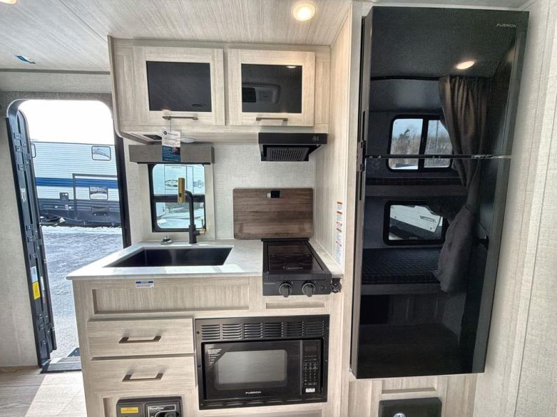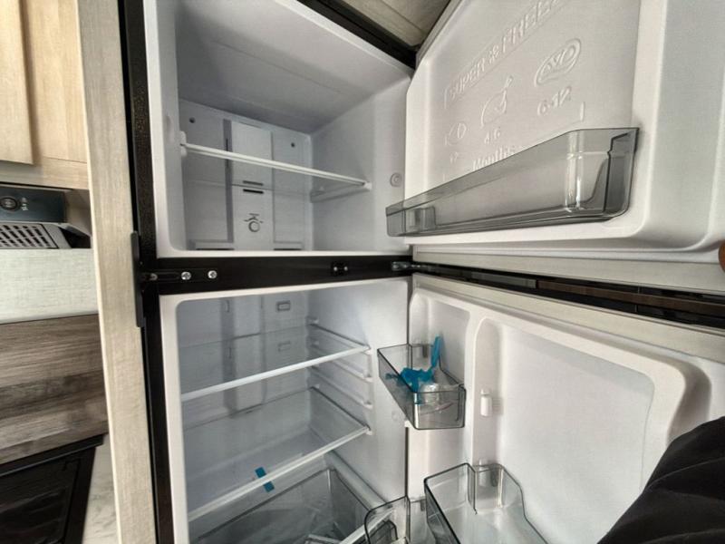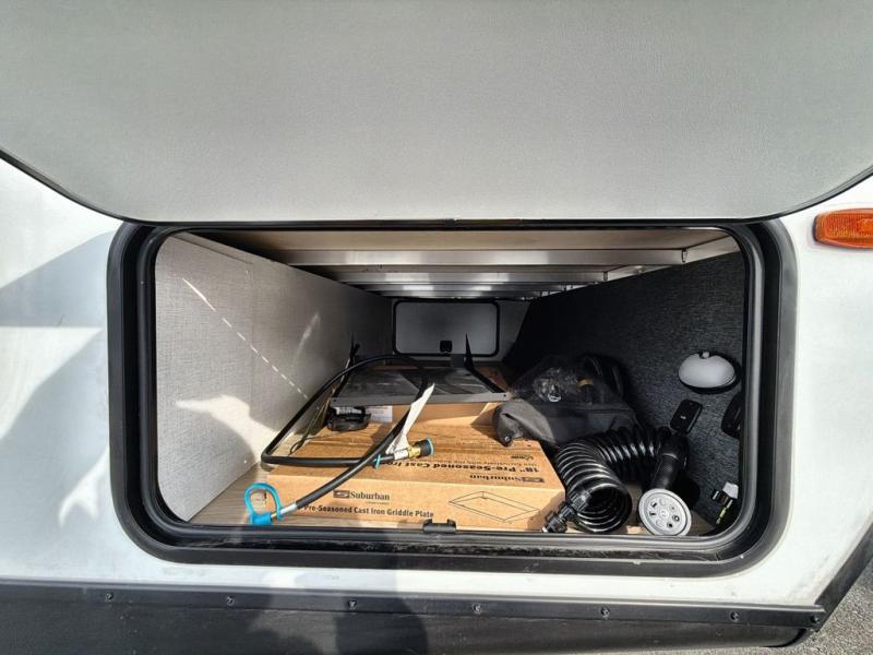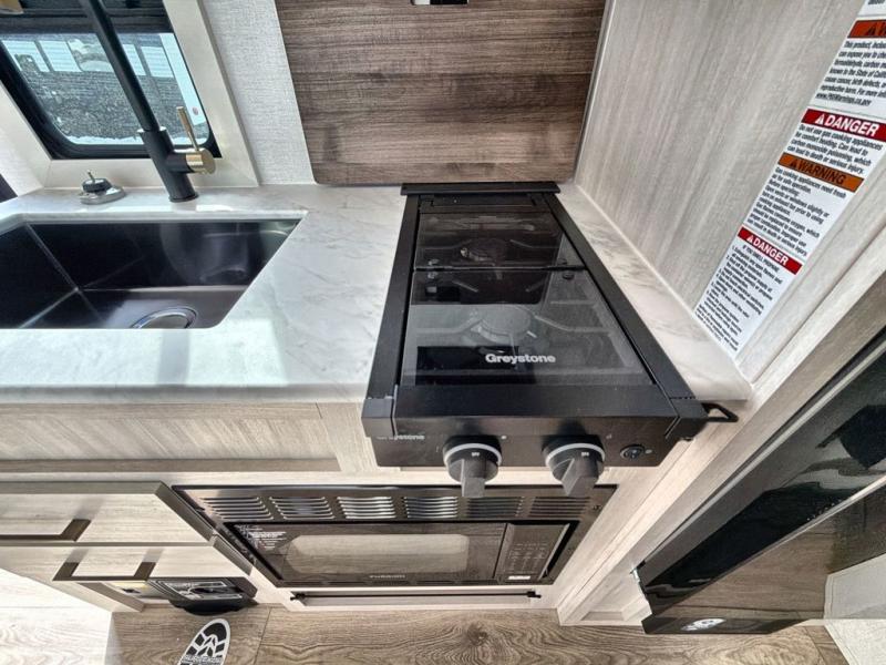 Bring along family or friends in this travel trailer that can sleep up to five people each night. The dinette slide will provide the chef space to cook on the two burner cooktop, or they may just head outdoors to cook on the outside kitchen. There is also an outdoor shelf here and a spray port for your convenience. The true queen-size bed up front is sure to provide a great night's rest, plus there is a "Stargazer" front window that will allow natural light in and beautiful starry nights.