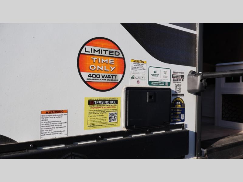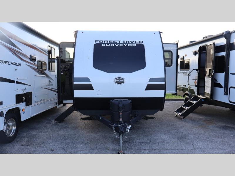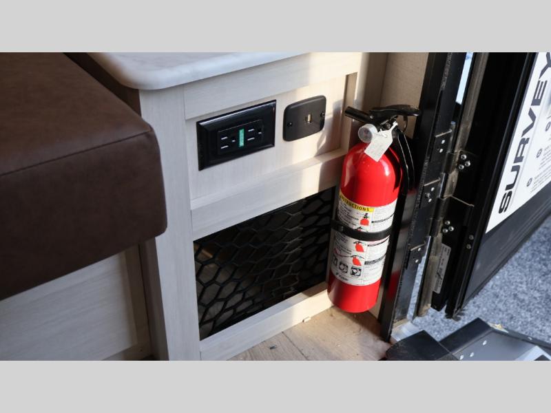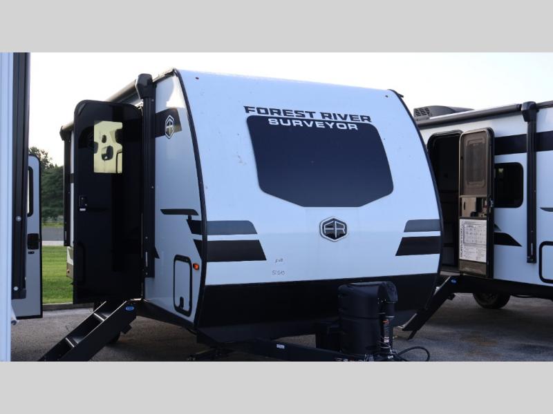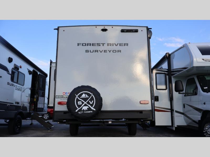 With any Surveyor Legend travel trailer by Forest River you will enjoy quality craftsmanship, convenient amenities, and at-home comforts. The Azdel composite walls provide a longer-lasting trailer, and the power tongue jack with a hitch light will get you back on the road in no-time. There are also Goodyear tires and a tire pressure monitoring system for hassle-free towing. Each model includes the Surveyor Legend Package that comes standard with oversized dinette storage access doors, front slam latch baggage doors, plus an automotive style tinted front windshield. You'll appreciate camping with a tankless water heater for endless hot showers, a 2" accessory hitch to bring bikes along, plus carpet-free interiors and a central vacuum system for easy clean up.