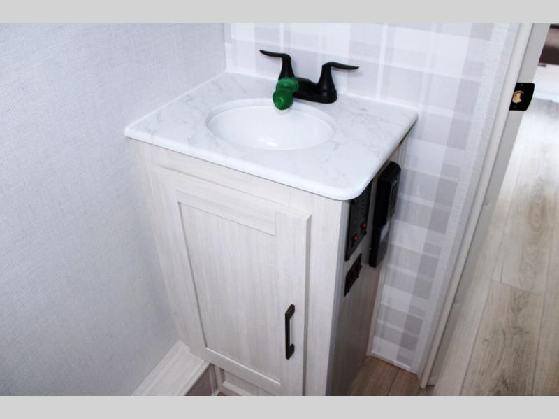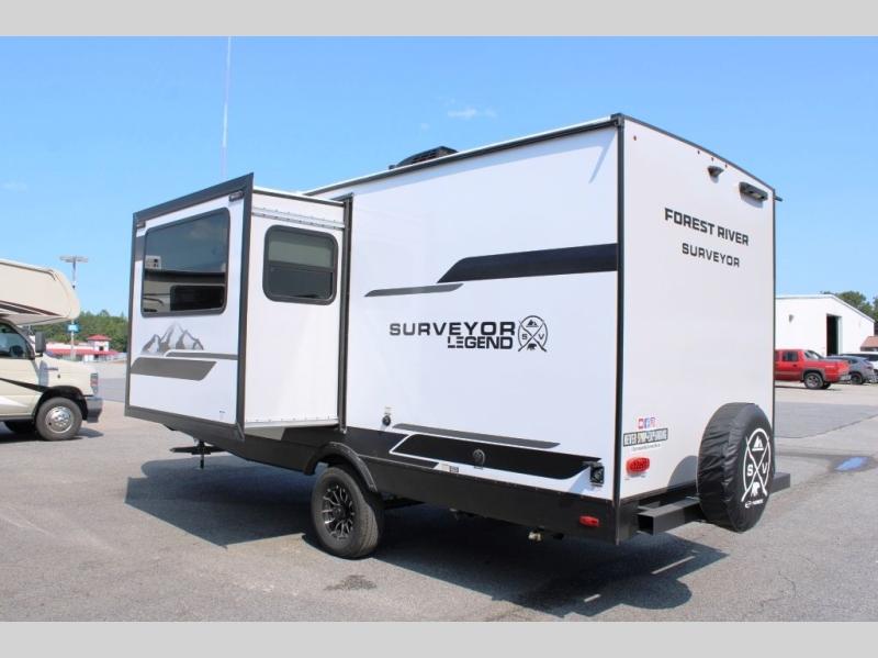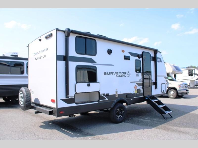 With any Surveyor Legend travel trailer by Forest River you will enjoy quality craftsmanship, convenient amenities, and at-home comforts. The Azdel composite walls provide a longer-lasting trailer, and the power tongue jack with hitch light makes getting back on the road quick and easy. There are also Goodyear® tires and a tire pressure monitoring system (TPMS) for more confident, hassle-free towing. Each model is built with thoughtful details like slam-latch exterior baggage doors and an automotive-style tinted front windshield that gives the front cap a sleek look while letting in natural light. You’ll appreciate camping with a tankless water heater for endless hot showers, a 2" rear accessory hitch to bring bikes or extra gear along, plus a central vacuum system that helps keep your easy-to-clean interior looking fresh.