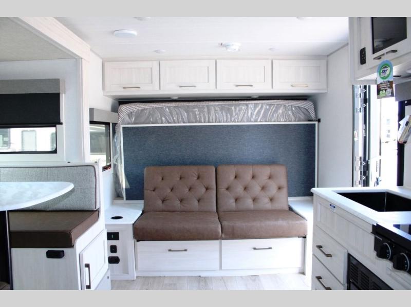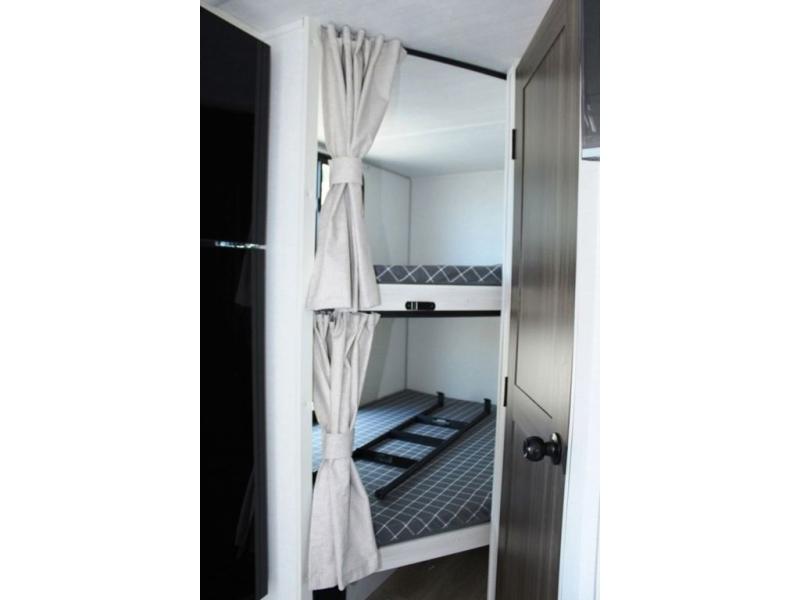 Experiencing the camping lifestyle just got easier with this travel trailer! The outdoor kitchen includes griddle and a shelf, plus there is a two burner cooktop inside if the weather isn't cooperating. There is a dinette slide where you can play a game of cards at, and the HD TV will allow you to keep up on your favorite shows. The kids or your guests can make themselves comfortable on the oversized bunks with a ladder, and the spacious full bath is close by for easy nighttime use. This model also includes a front queen-size Murphy bed with two end tables to set your books or phone on, plus there is overhead storage for your valuables.
