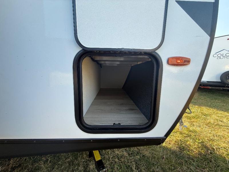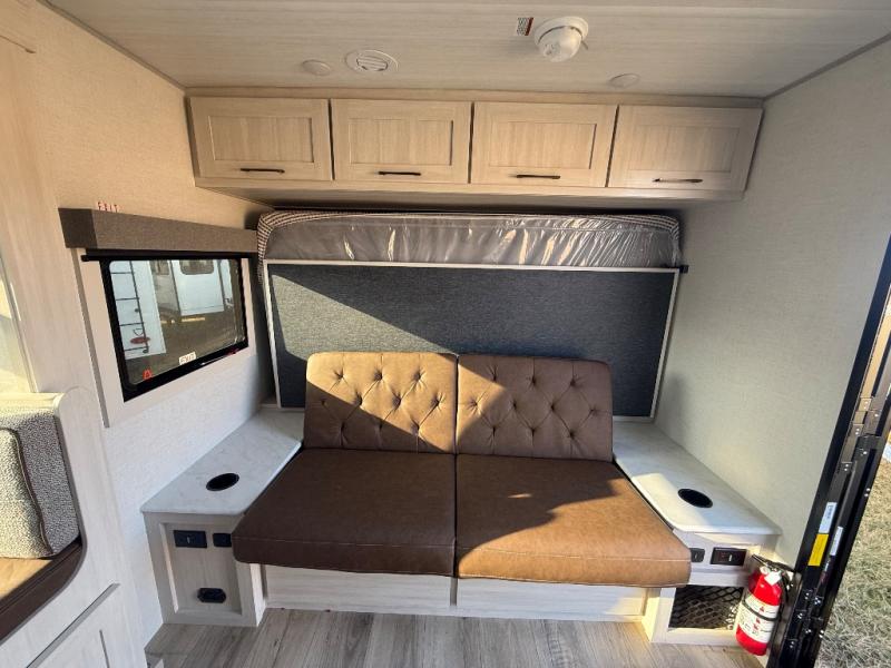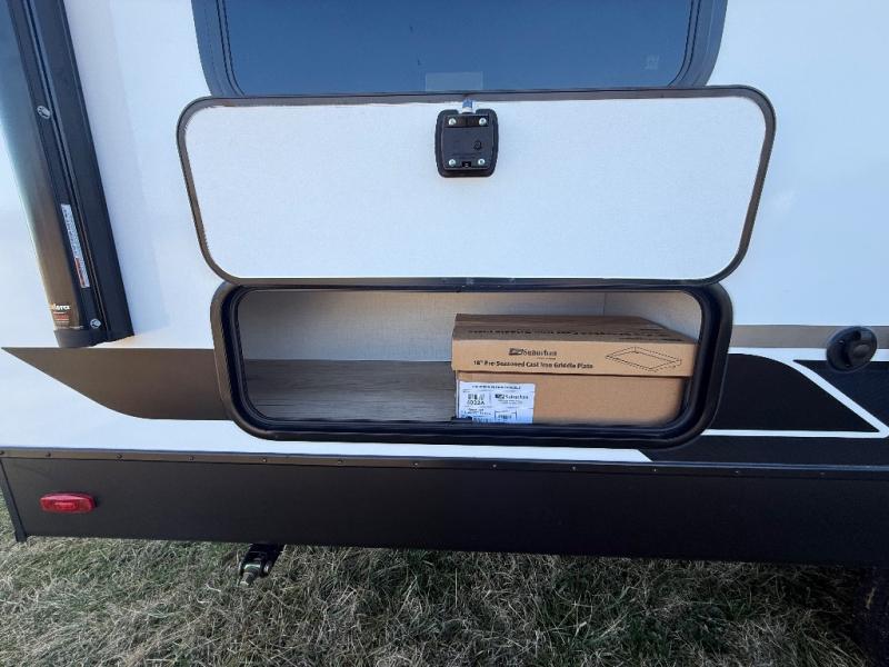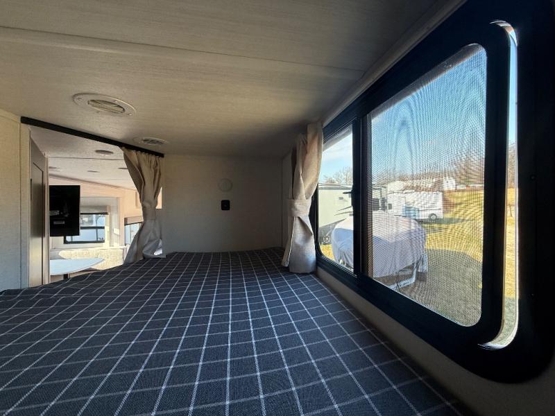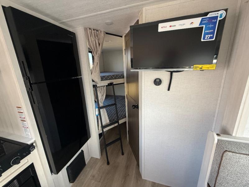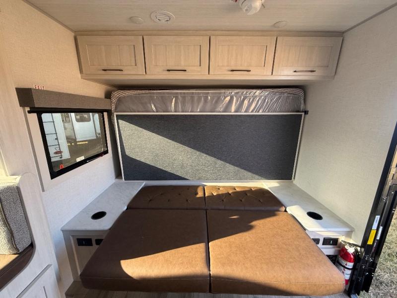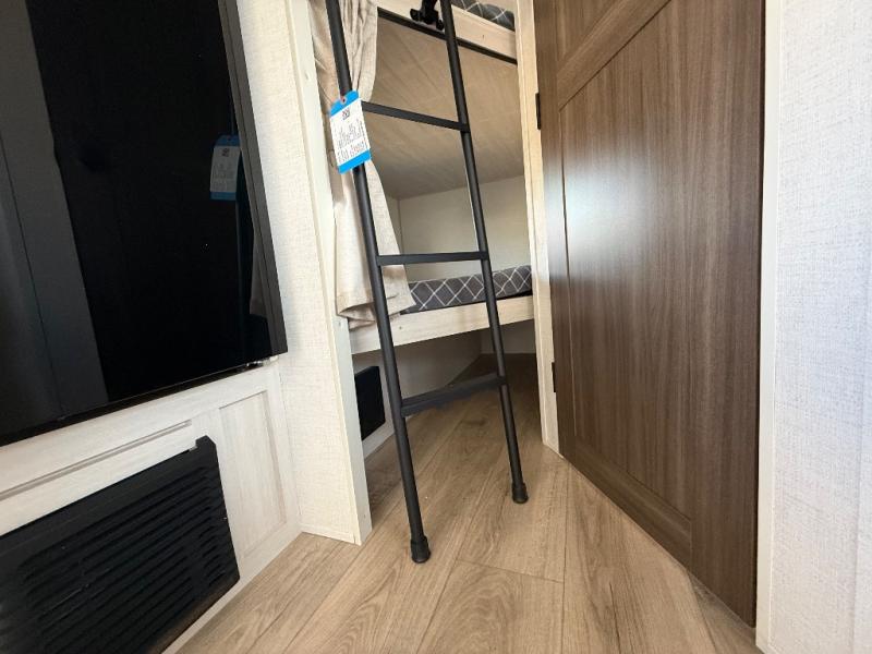Experiencing the camping lifestyle just got easier with this travel trailer! The outdoor kitchen includes griddle and a shelf, plus there is a two burner cooktop inside if the weather isn't cooperating. There is a dinette slide where you can play a game of cards at, and the HD TV will allow you to keep up on your favorite shows. The kids or your guests can make themselves comfortable on the oversized bunks with a ladder, and the spacious full bath is close by for easy nighttime use. This model also includes a front queen-size Murphy bed with two end tables to set your books or phone on, plus there is overhead storage for your valuables.