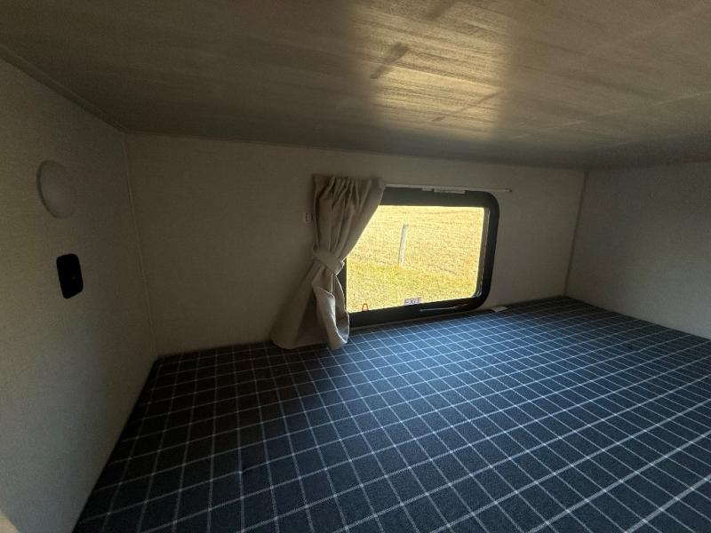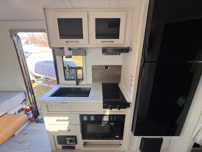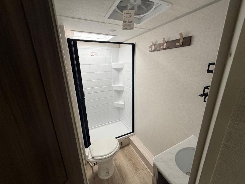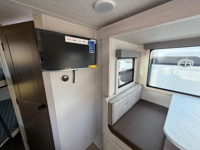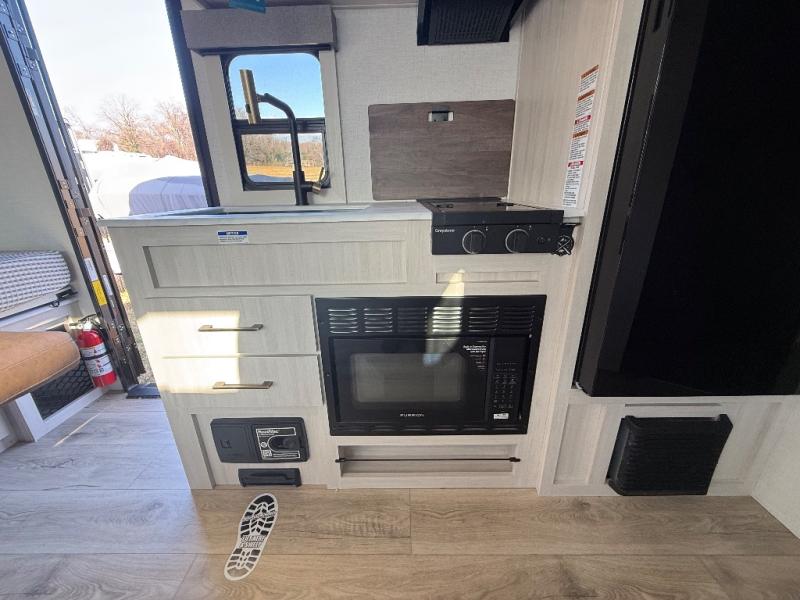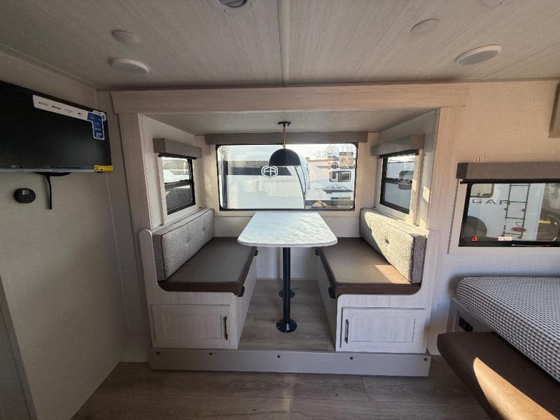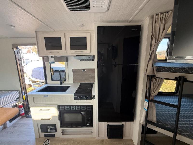 Experiencing the camping lifestyle just got easier with this travel trailer! The outdoor kitchen includes griddle and a shelf, plus there is a two burner cooktop inside if the weather isn't cooperating. There is a dinette slide where you can play a game of cards at, and the HD TV will allow you to keep up on your favorite shows. The kids or your guests can make themselves comfortable on the oversized bunks with a ladder, and the spacious full bath is close by for easy nighttime use. This model also includes a front queen-size Murphy bed with two end tables to set your books or phone on, plus there is overhead storage for your valuables.