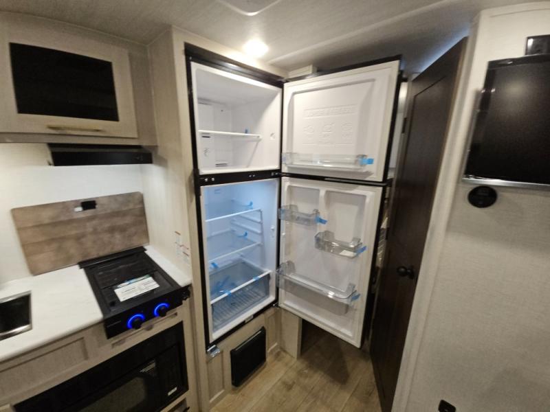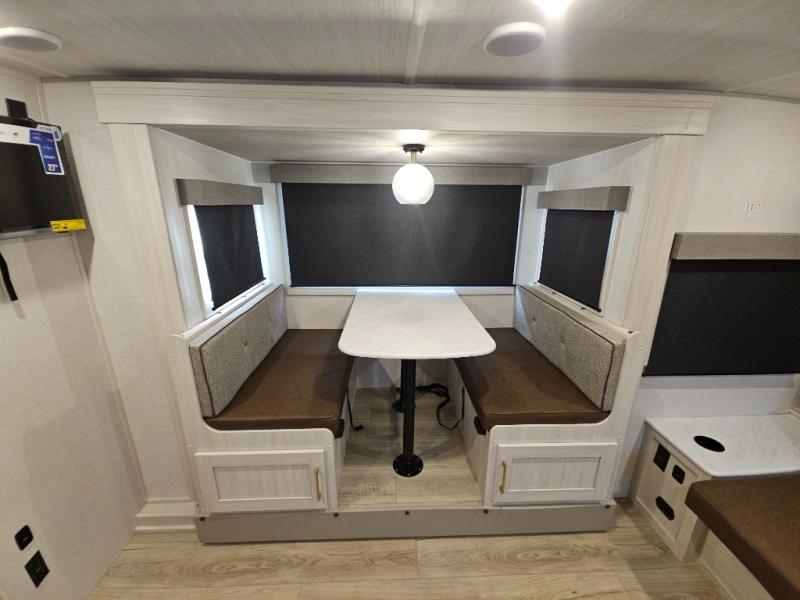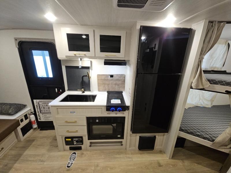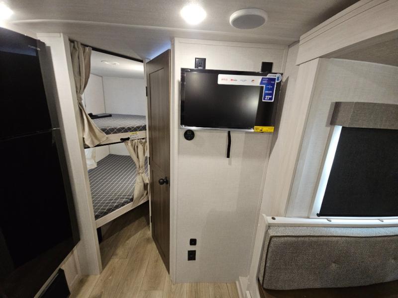 Experiencing the camping lifestyle just got easier with this travel trailer! The outdoor kitchen includes griddle and a shelf, plus there is a two burner cooktop inside if the weather isn't cooperating. There is a dinette slide where you can play a game of cards at, and the HD TV will allow you to keep up on your favorite shows. The kids or your guests can make themselves comfortable on the oversized bunks with a ladder, and the spacious full bath is close by for easy nighttime use. This model also includes a front queen-size Murphy bed with two end tables to set your books or phone on, plus there is overhead storage for your valuables.