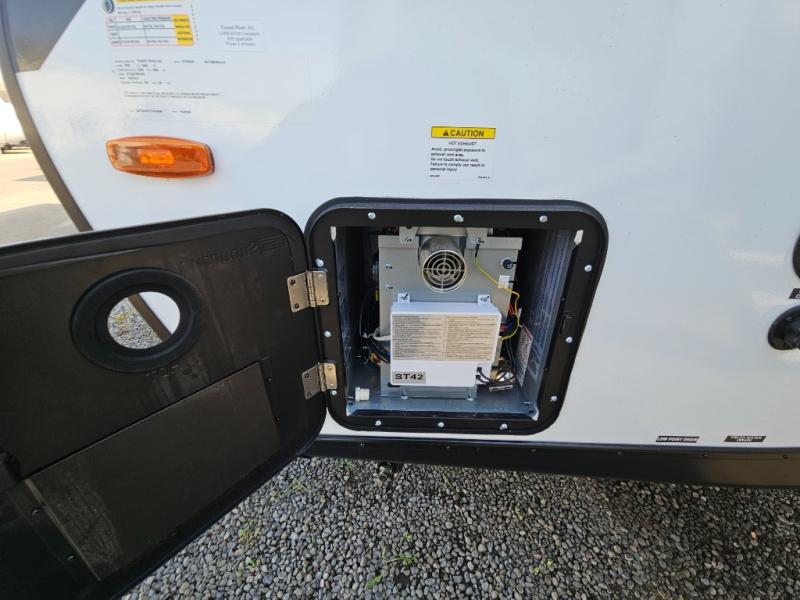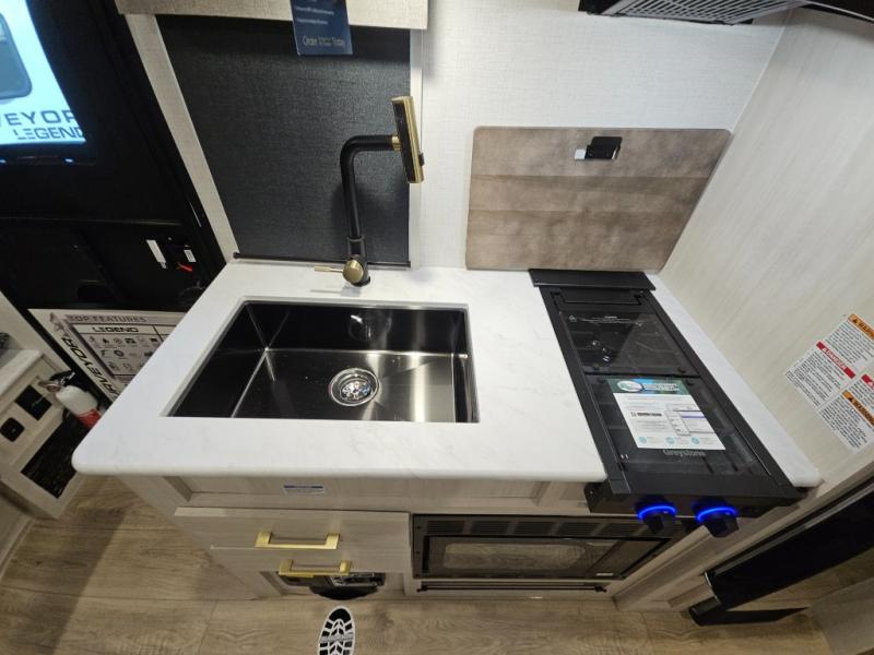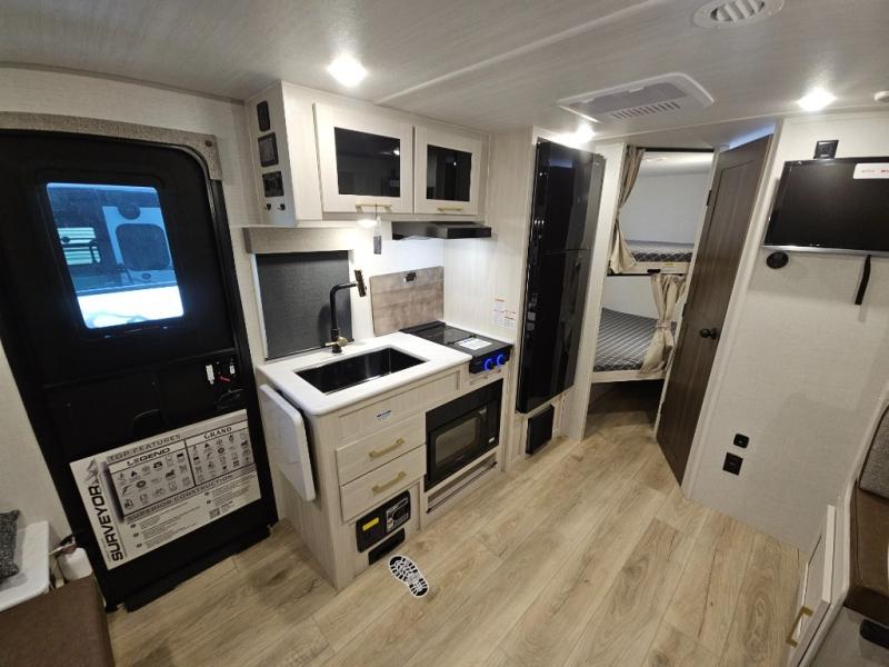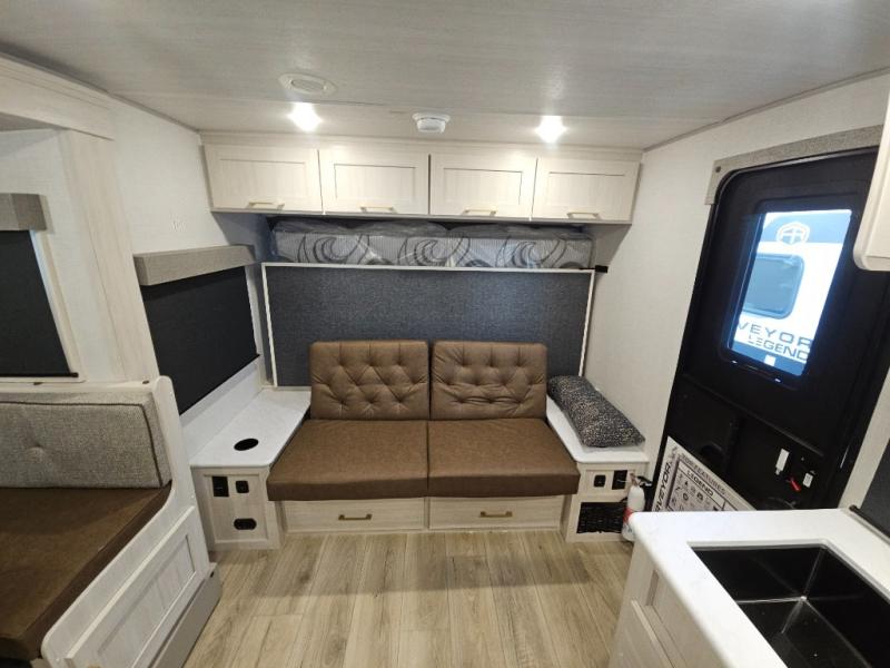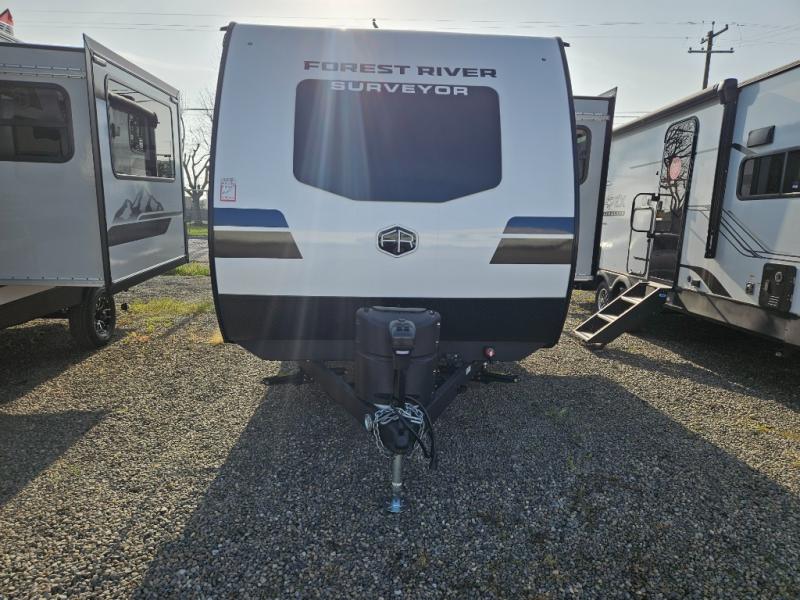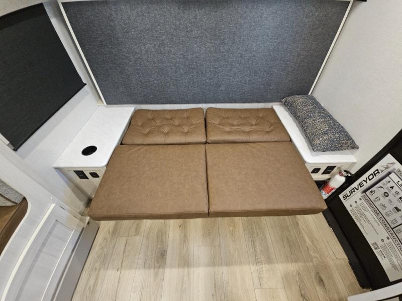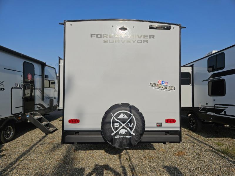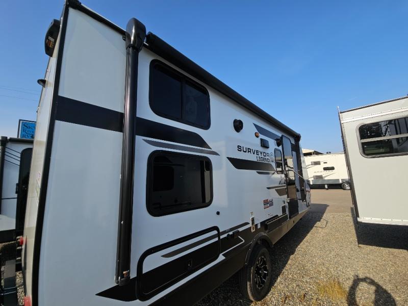 With any Surveyor Legend travel trailer by Forest River you will enjoy quality craftsmanship, convenient amenities, and at-home comforts. The Azdel composite walls provide a longer-lasting trailer, and the power tongue jack with hitch light makes getting back on the road quick and easy. There are also Goodyear® tires and a tire pressure monitoring system (TPMS) for more confident, hassle-free towing. Each model is built with thoughtful details like slam-latch exterior baggage doors and an automotive-style tinted front windshield that gives the front cap a sleek look while letting in natural light. You’ll appreciate camping with a tankless water heater for endless hot showers, a 2" rear accessory hitch to bring bikes or extra gear along, plus a central vacuum system that helps keep your easy-to-clean interior looking fresh.